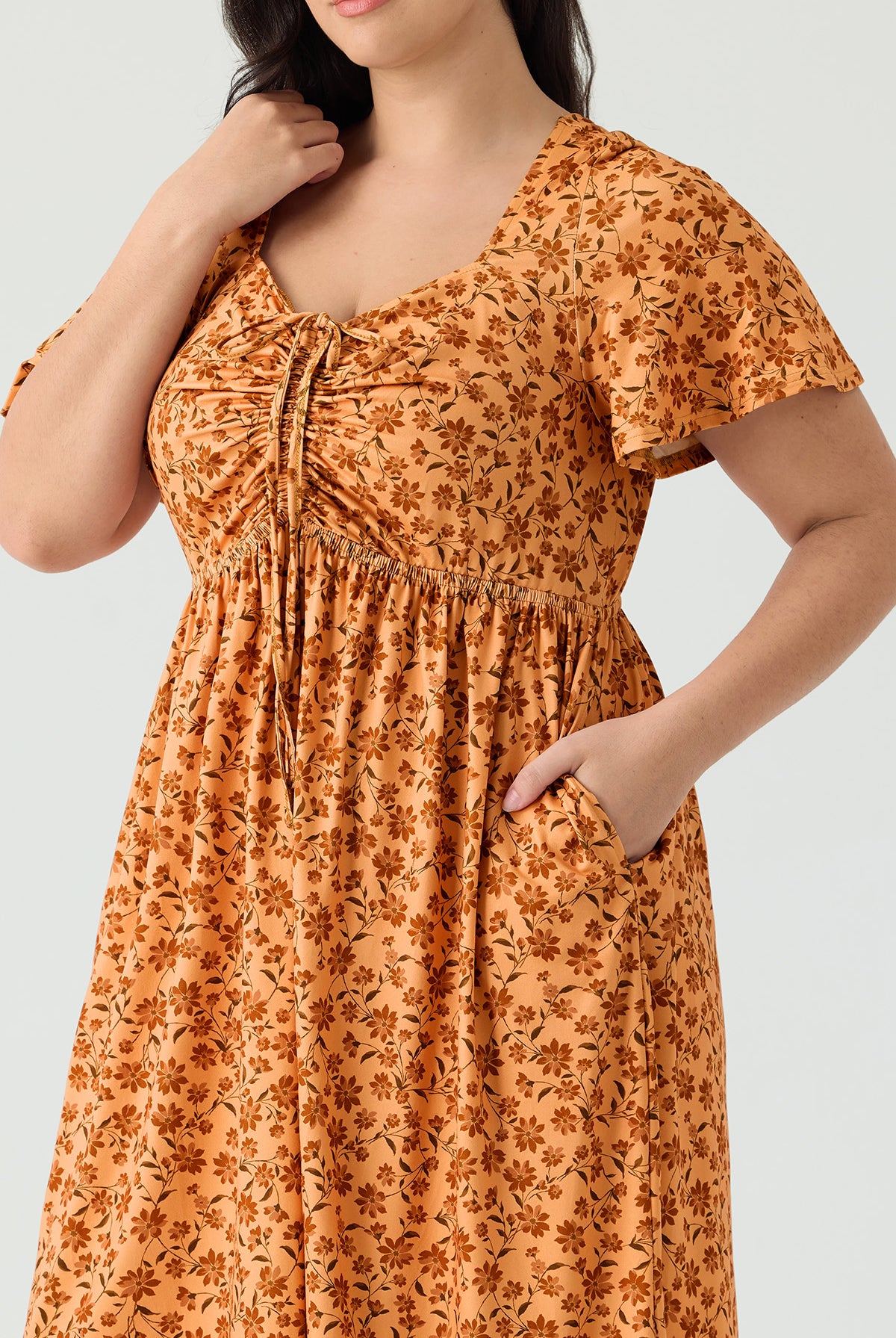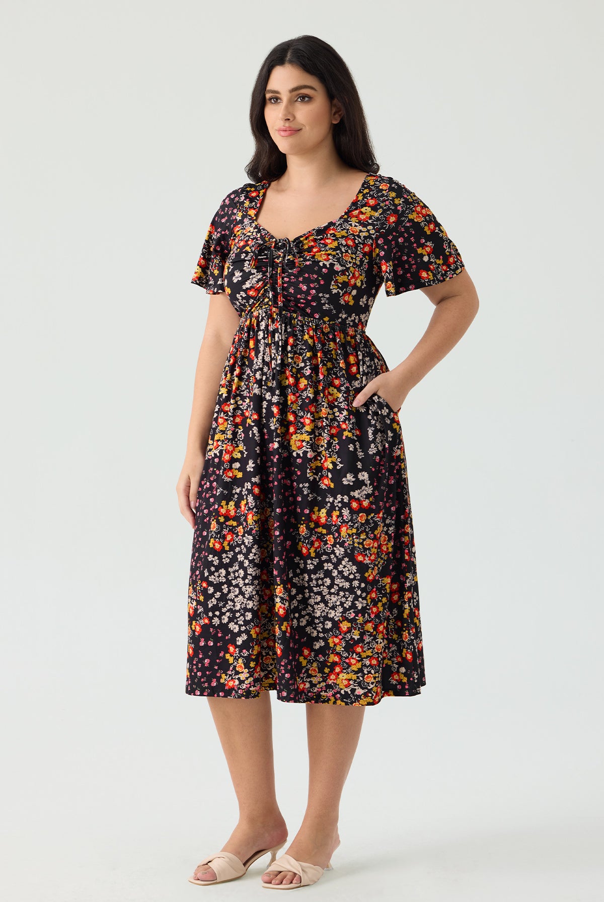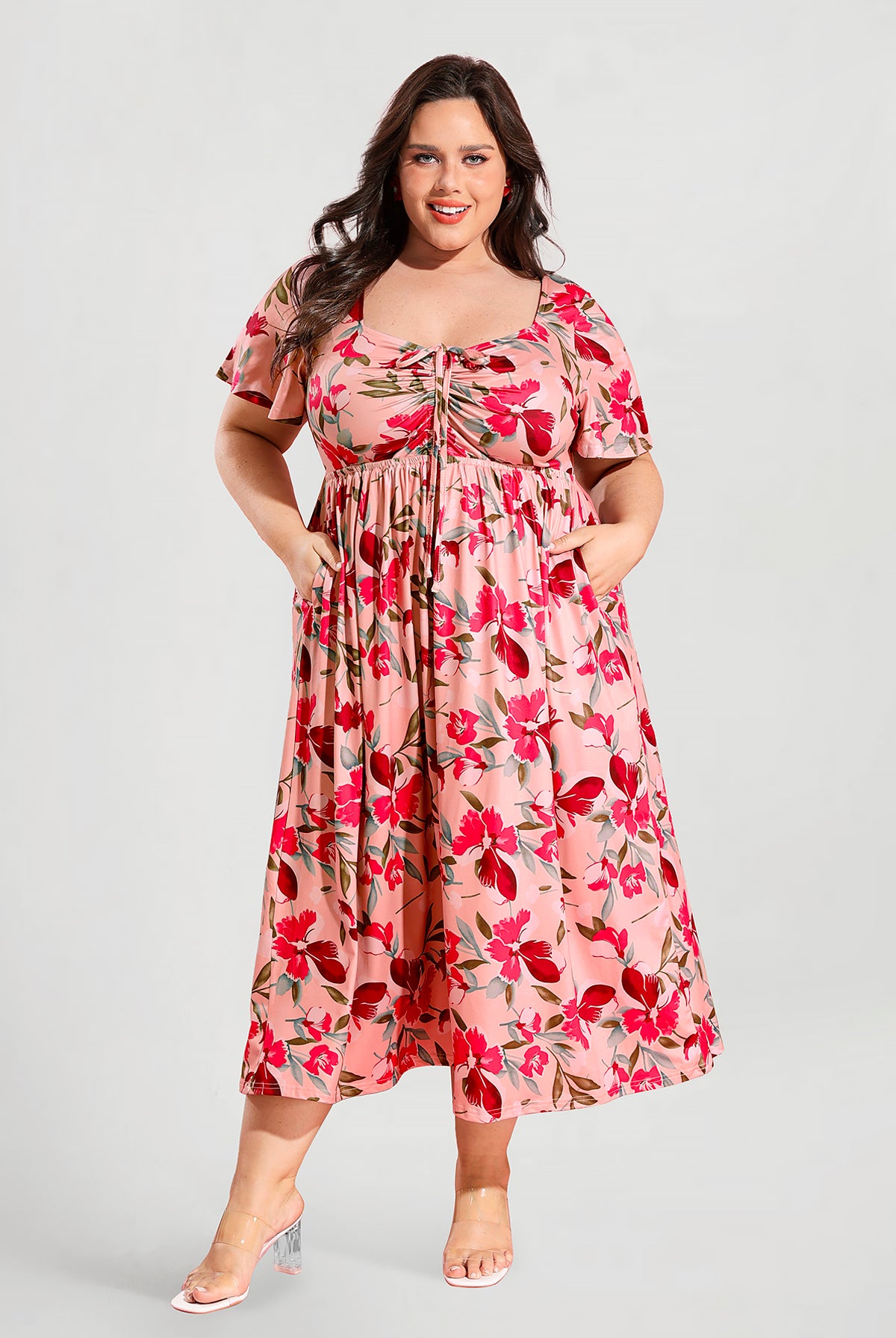 Pockets Drawstring Sweetheart Floral A-line Midi Dress