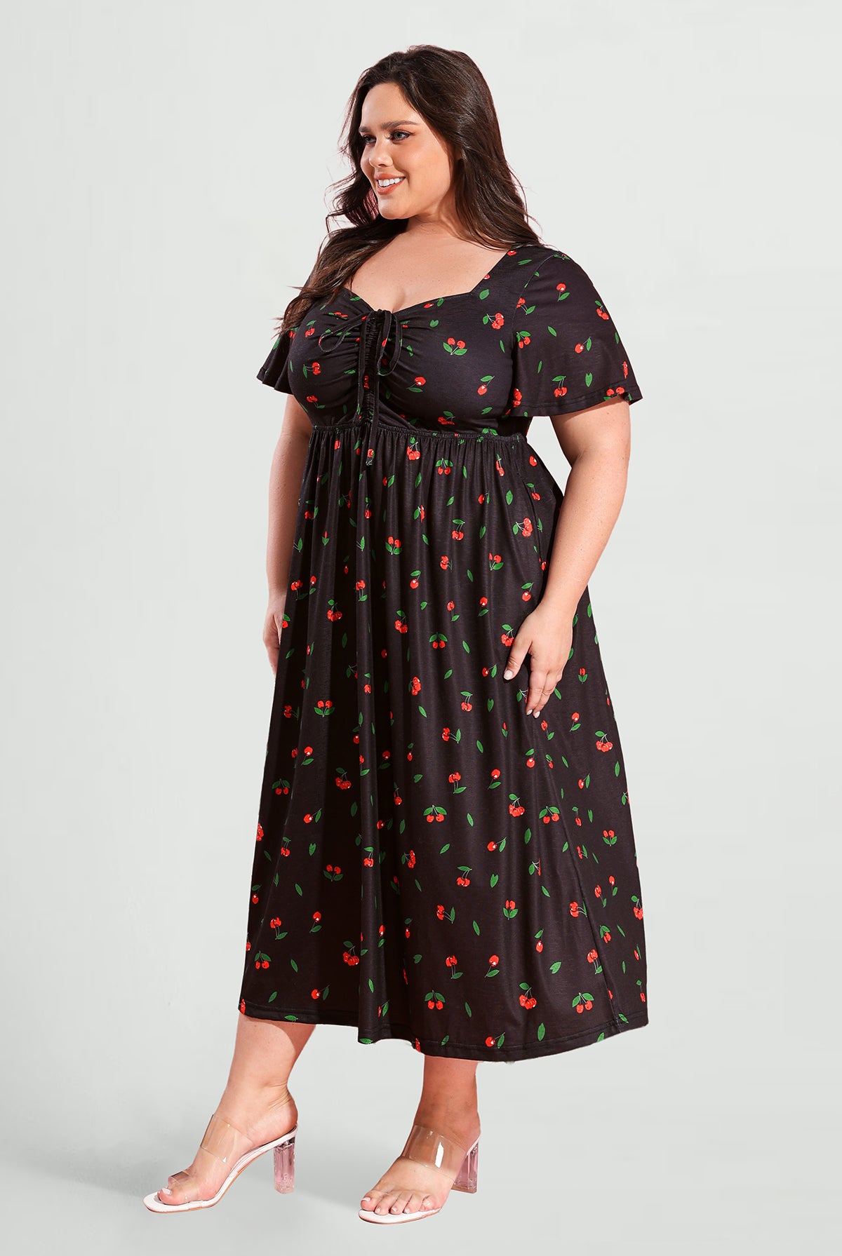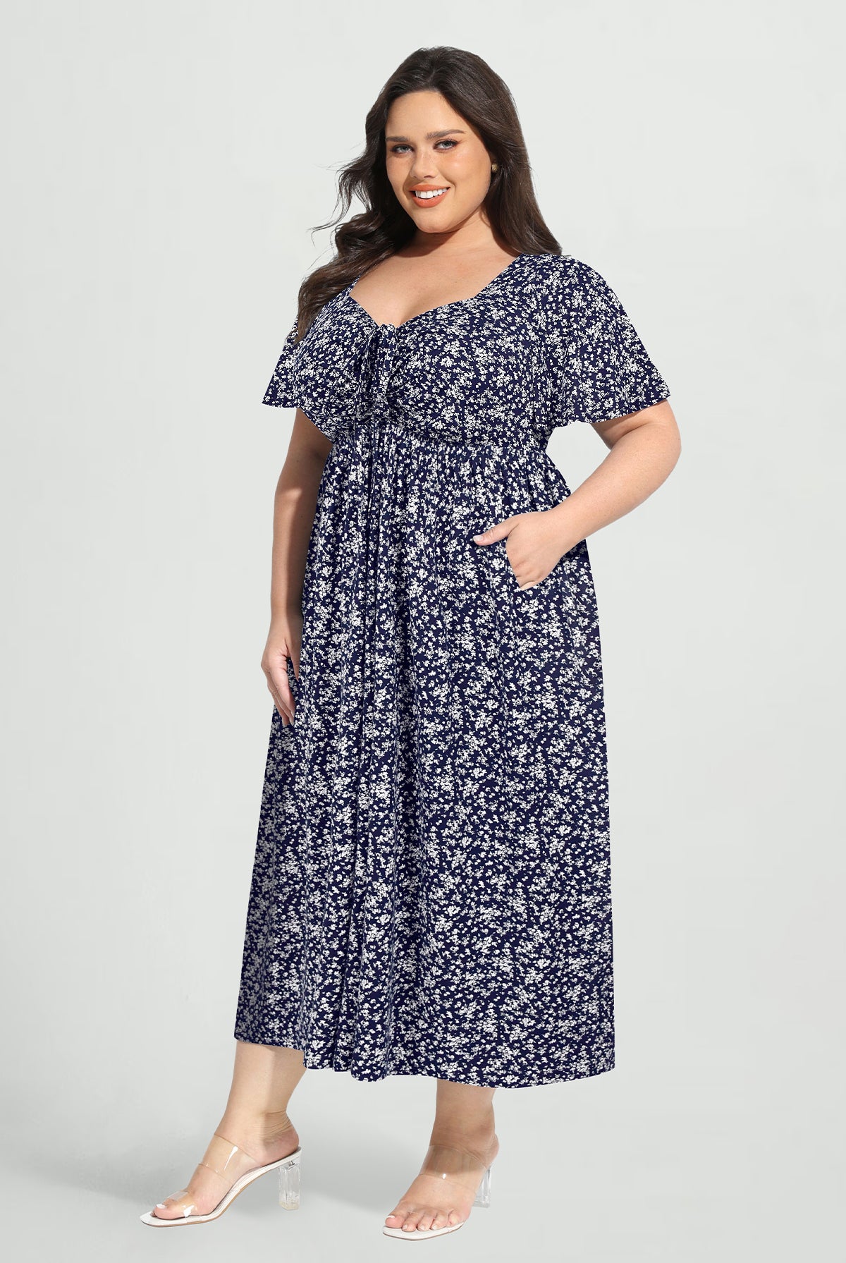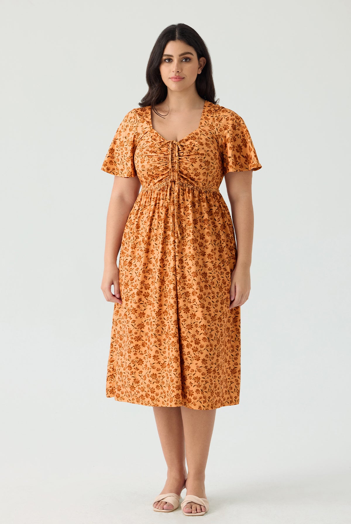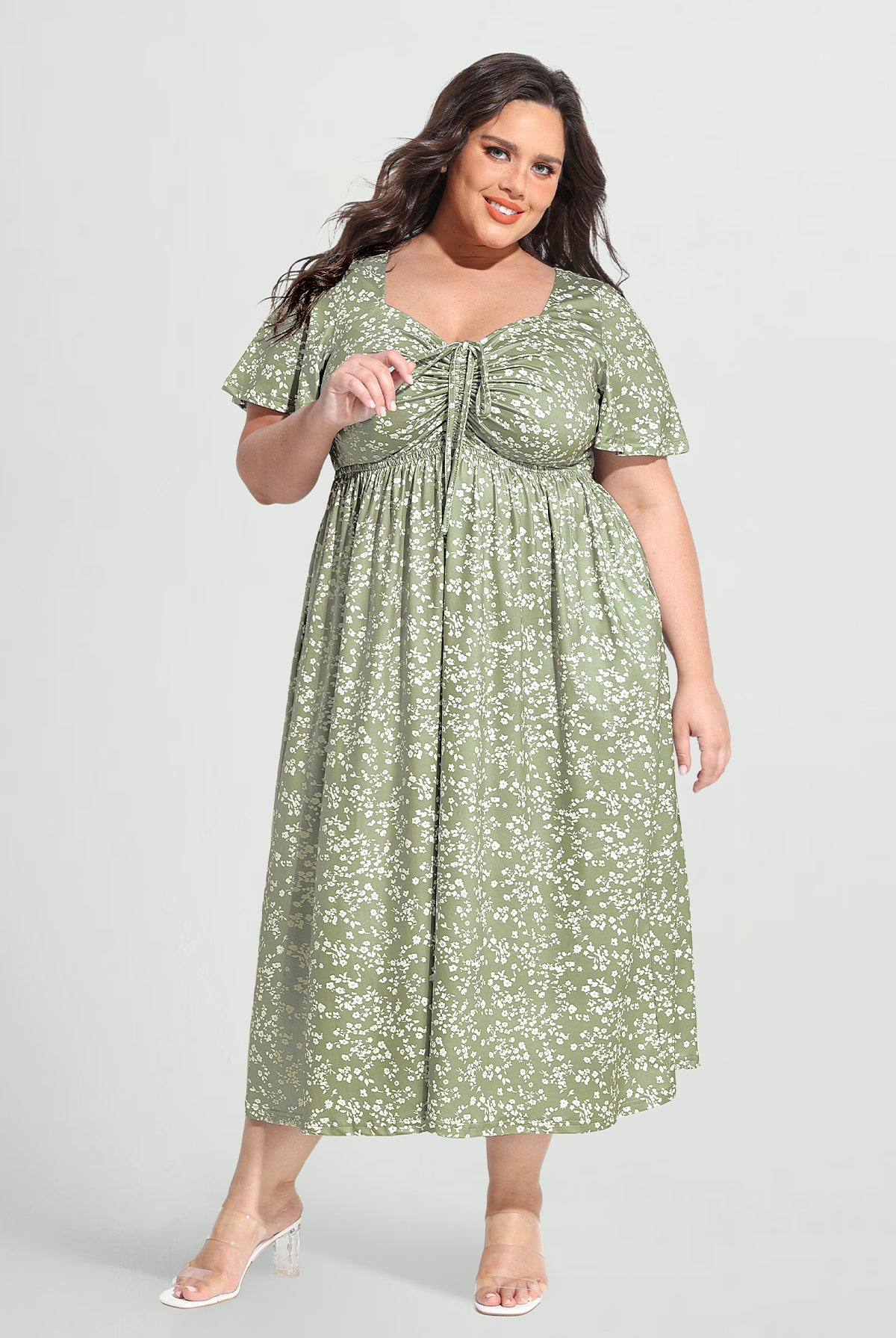 Pockets Drawstring Sweetheart Floral A-line Midi Dress