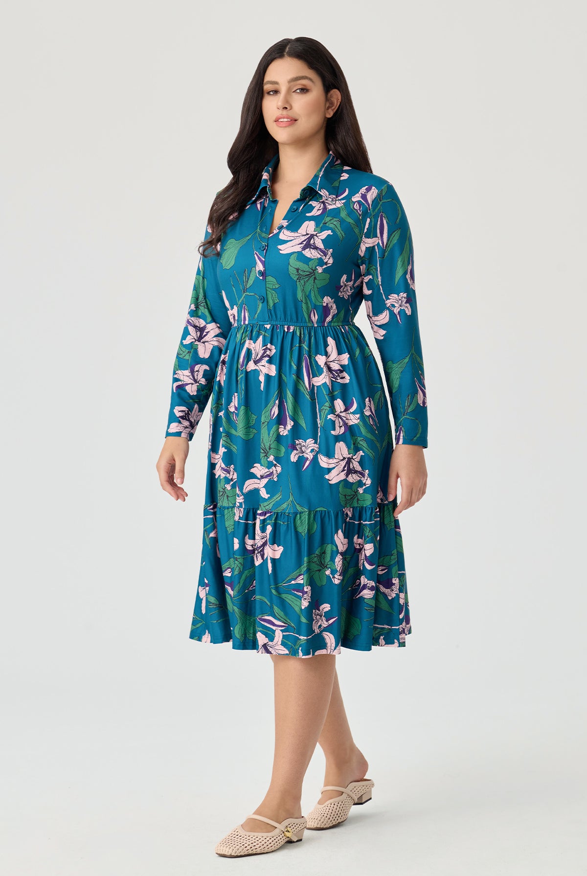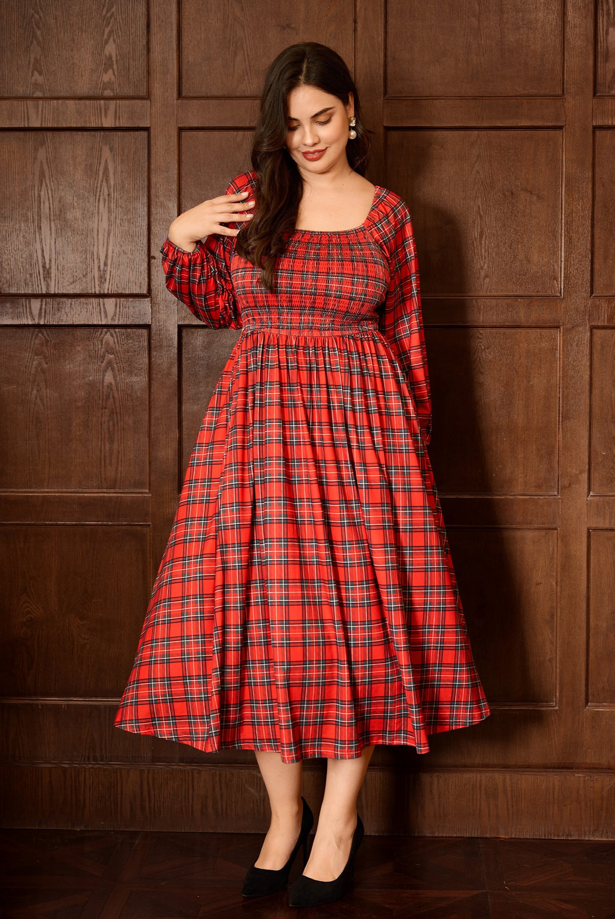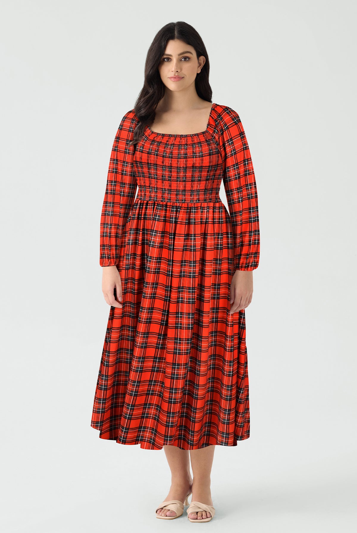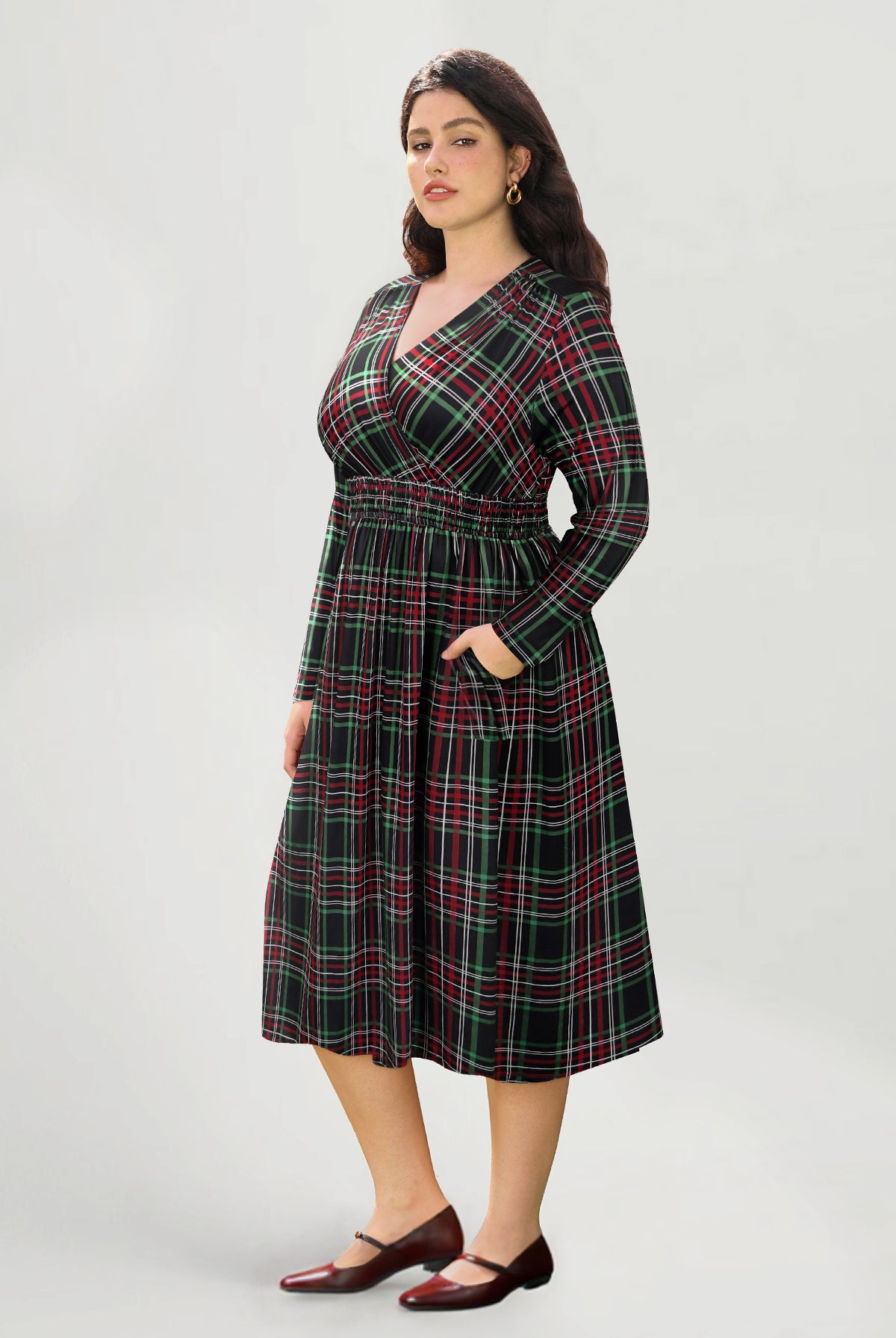Ritera Pockets Plaid Button Up Polo Neck Shirred Midi Dress