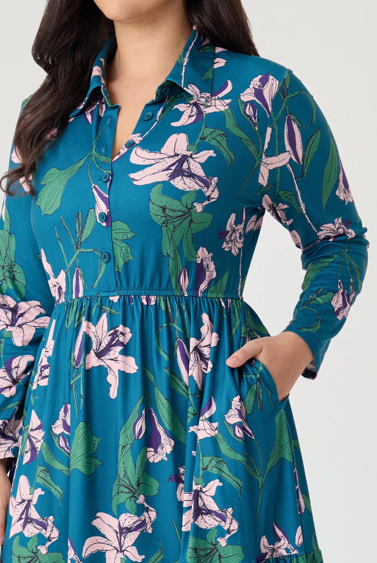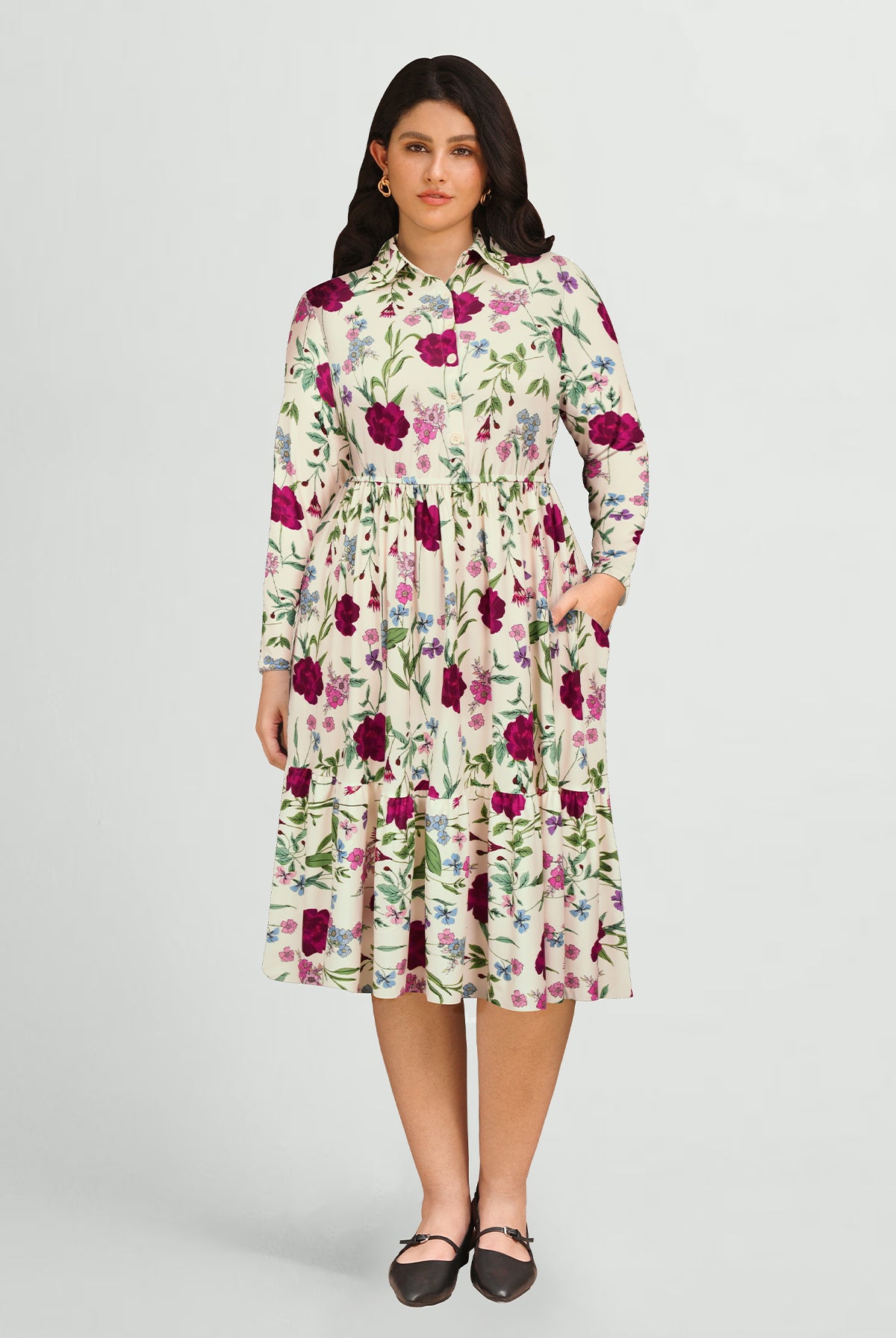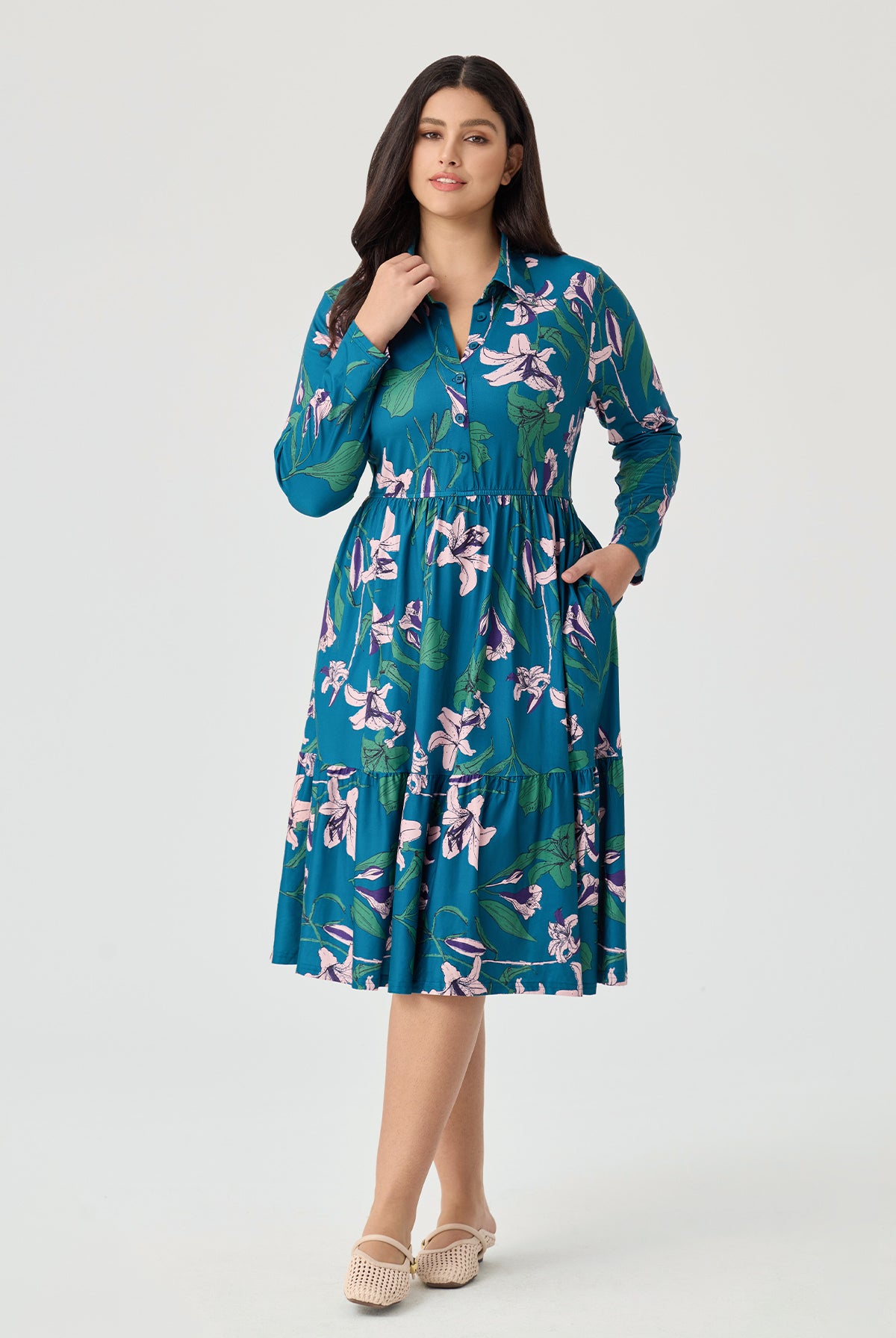Pockets Button Up Floral Collar Neck Tiered Midi Dress