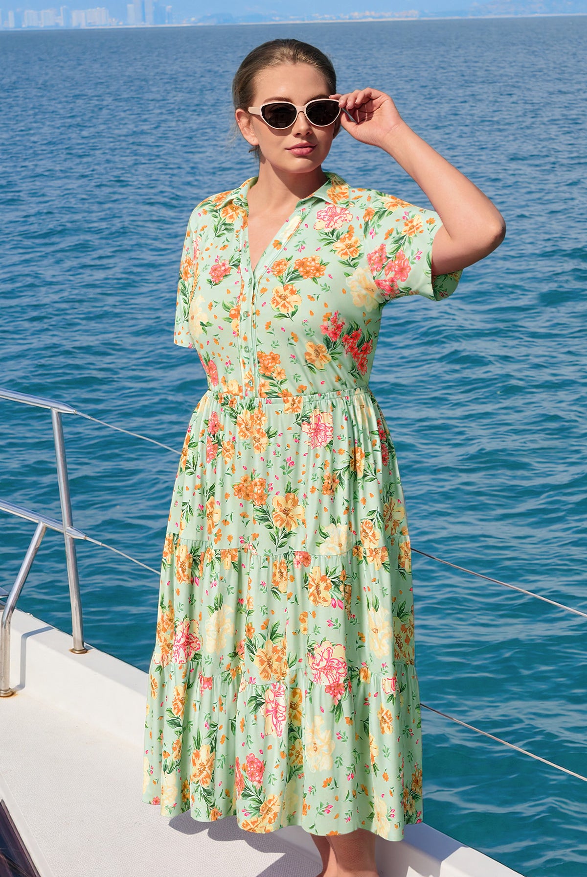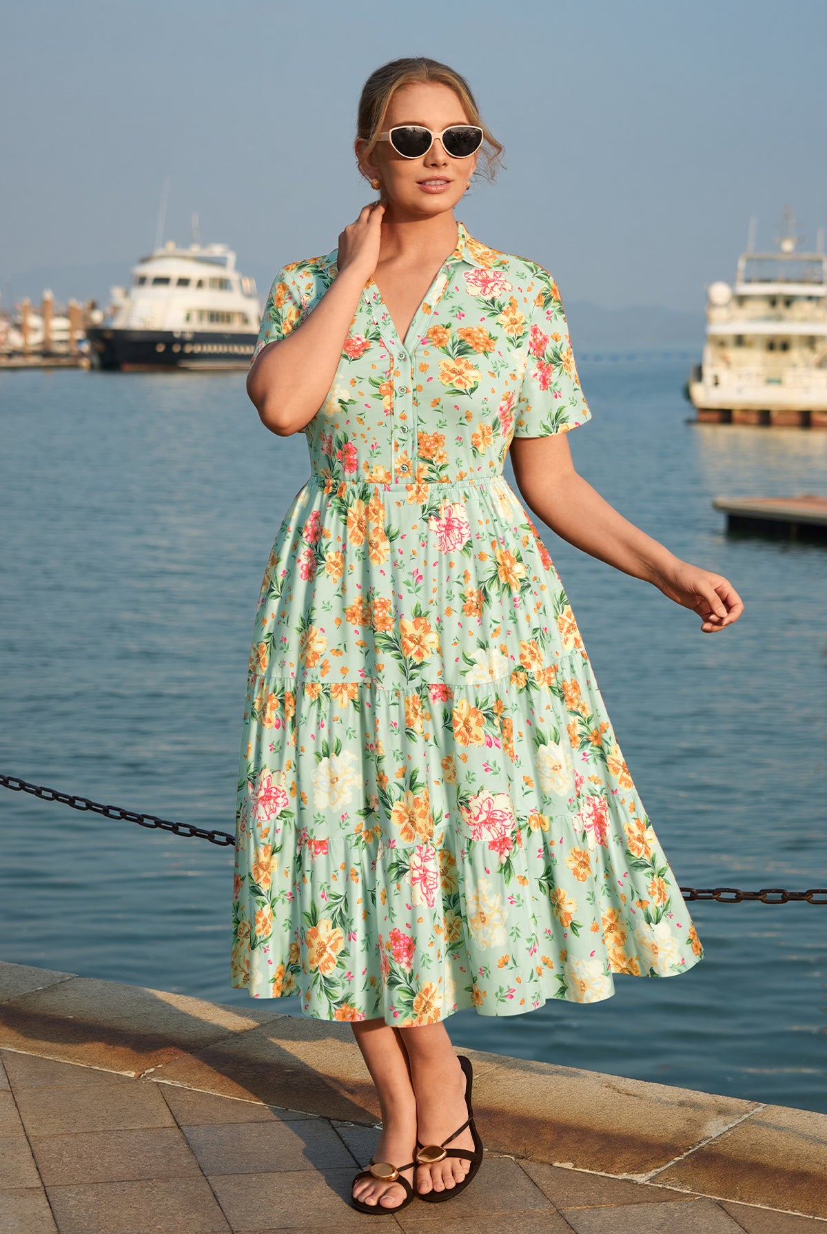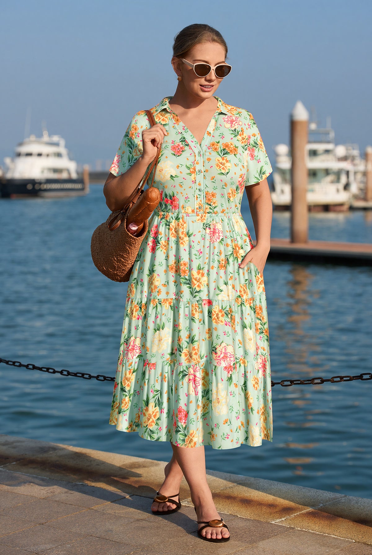 Ritera Pockets Button Up Floral Polo Neck Tiered Midi Dress