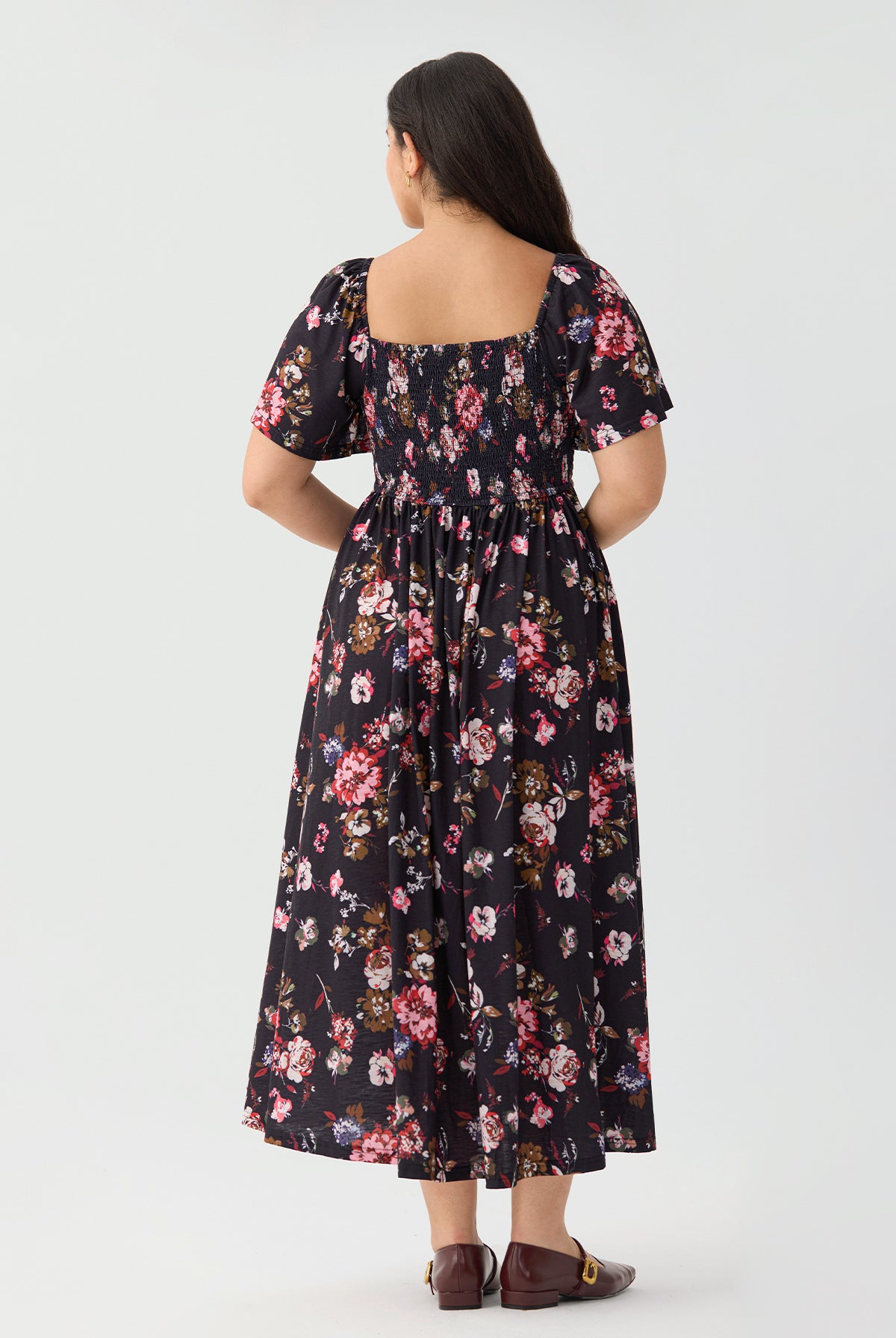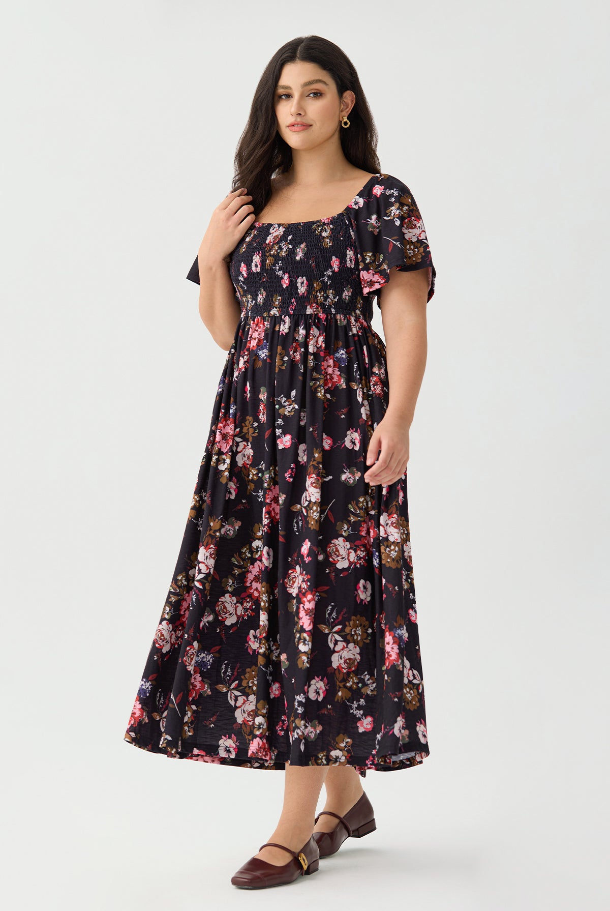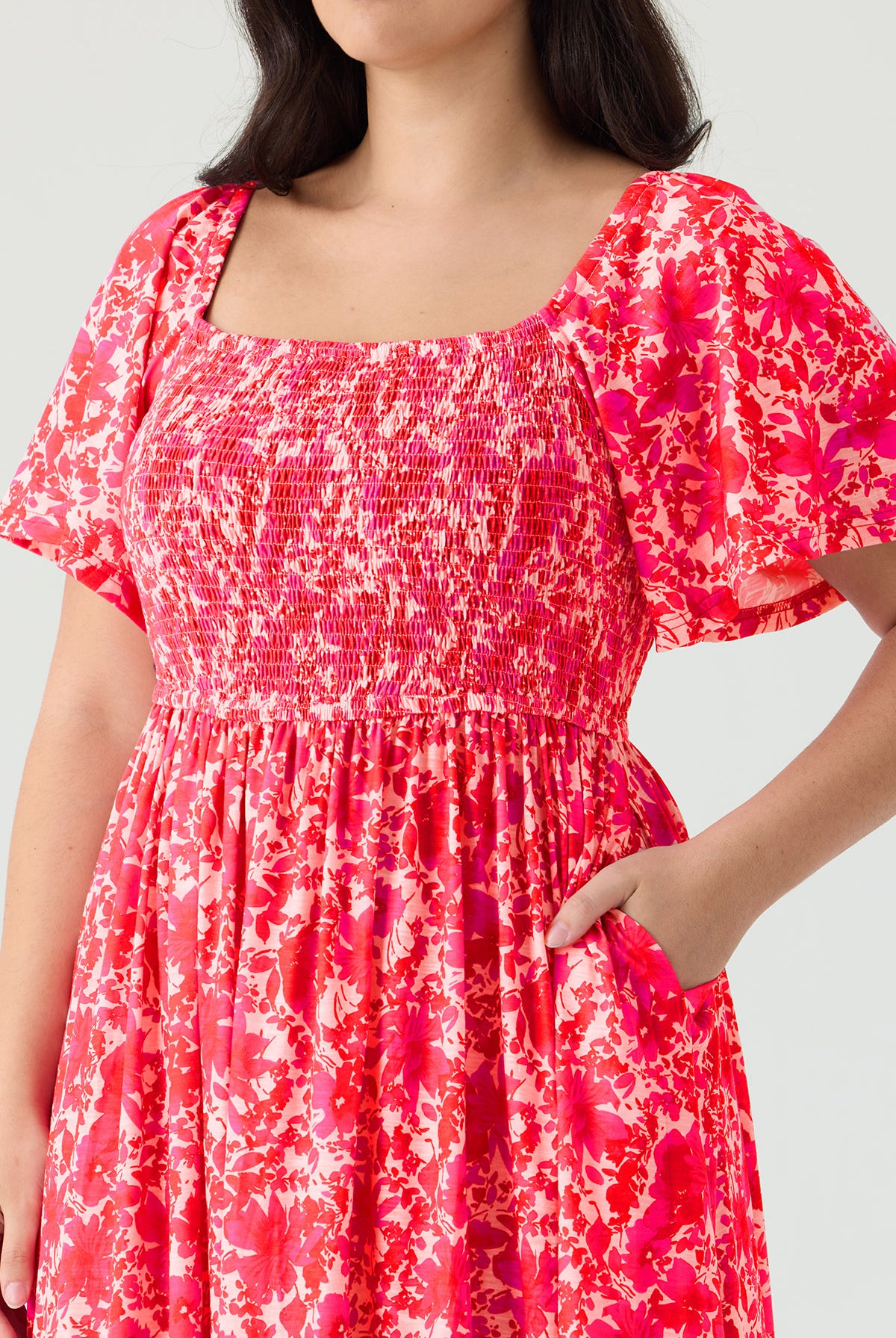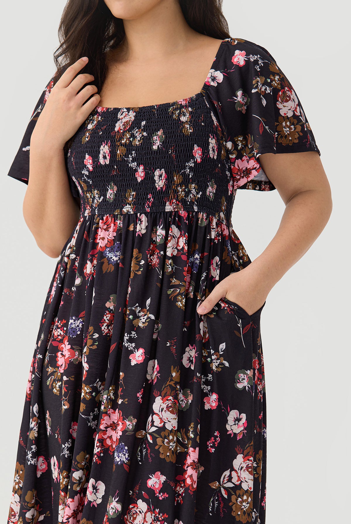 Pocket Floral Print Ruffle Sleeve Midi Dress