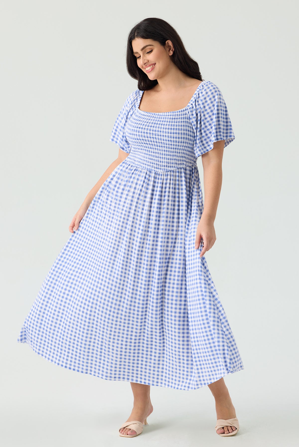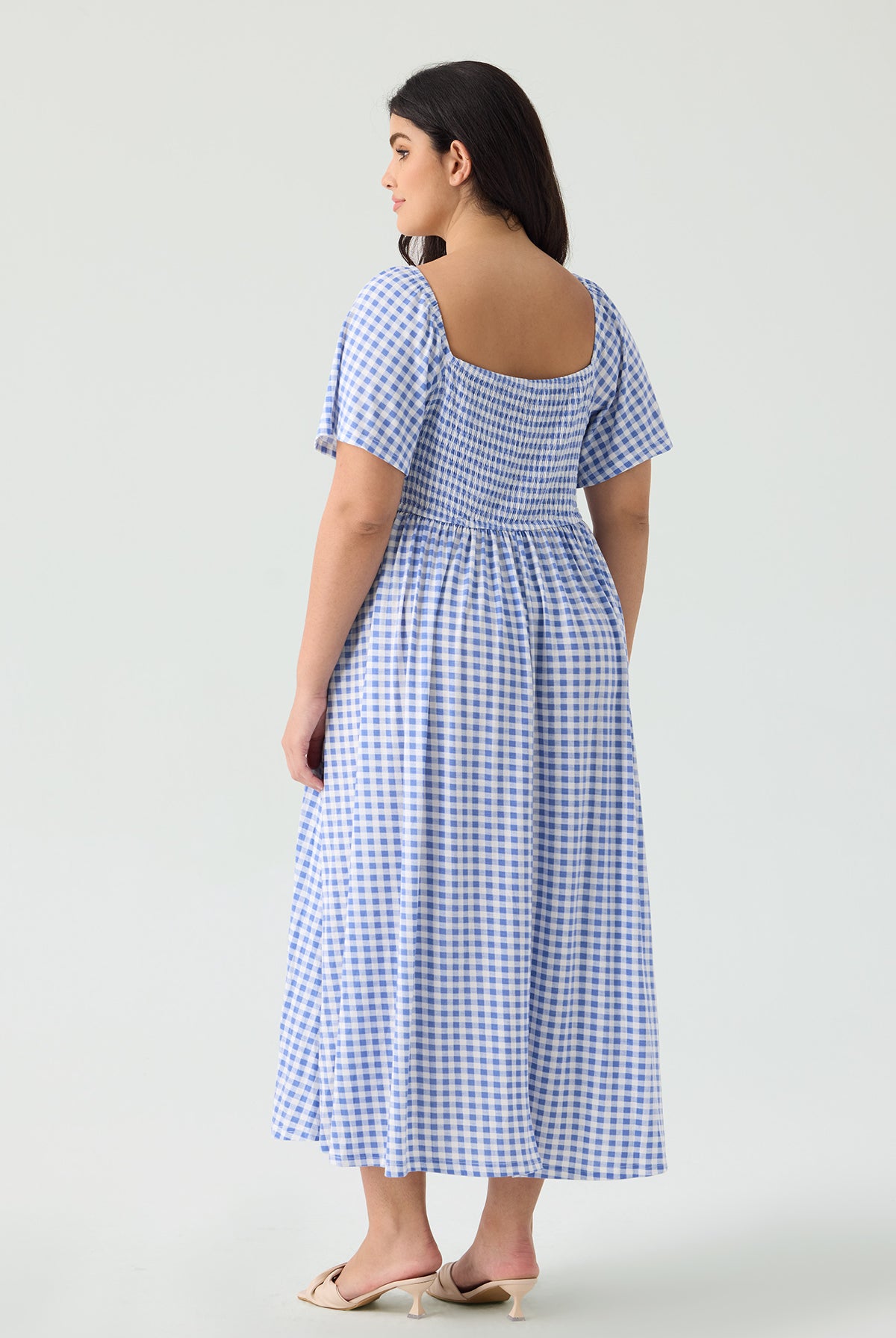 Ritera Pockets Plaid Button Up Polo Neck Shirred Midi Dress