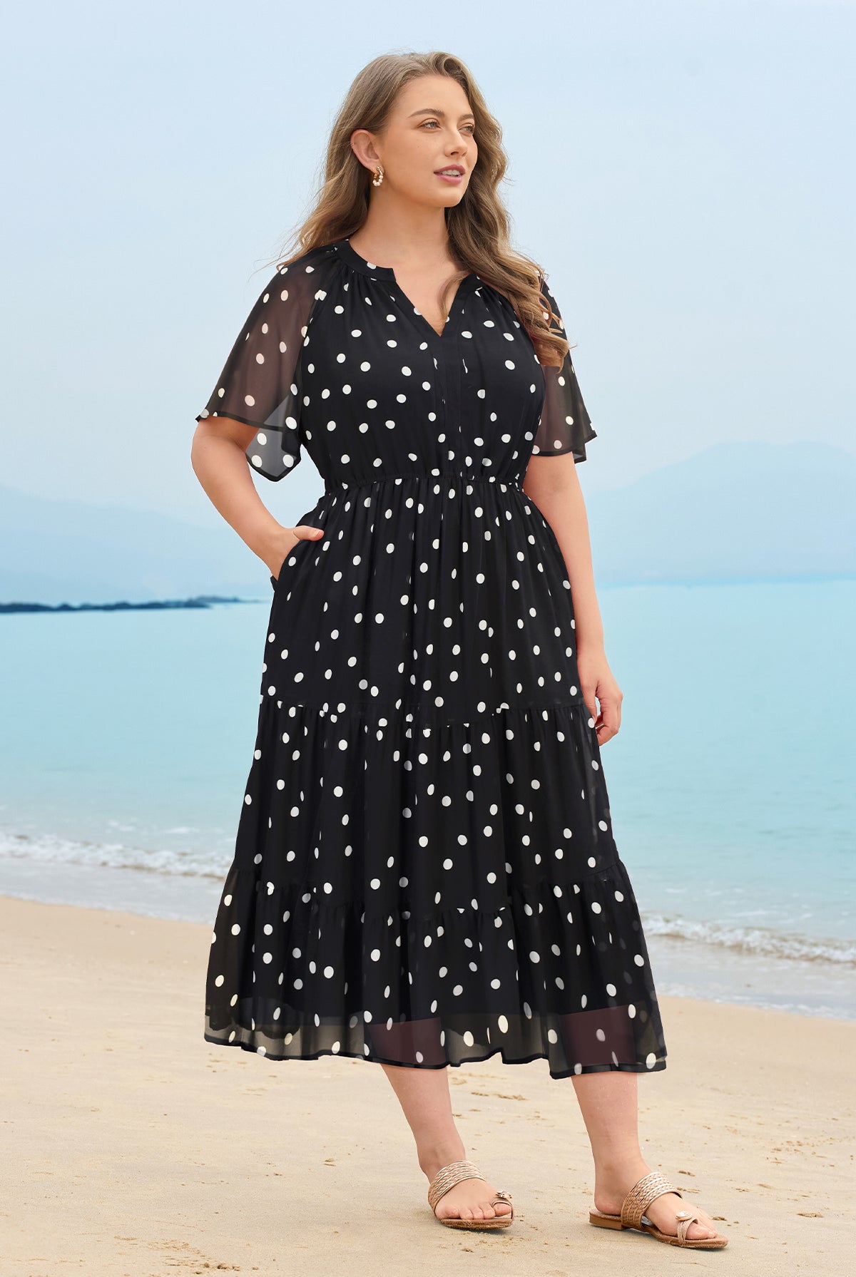 Pockets Polka Dot V-Neck Smocked Waist Midi Dress