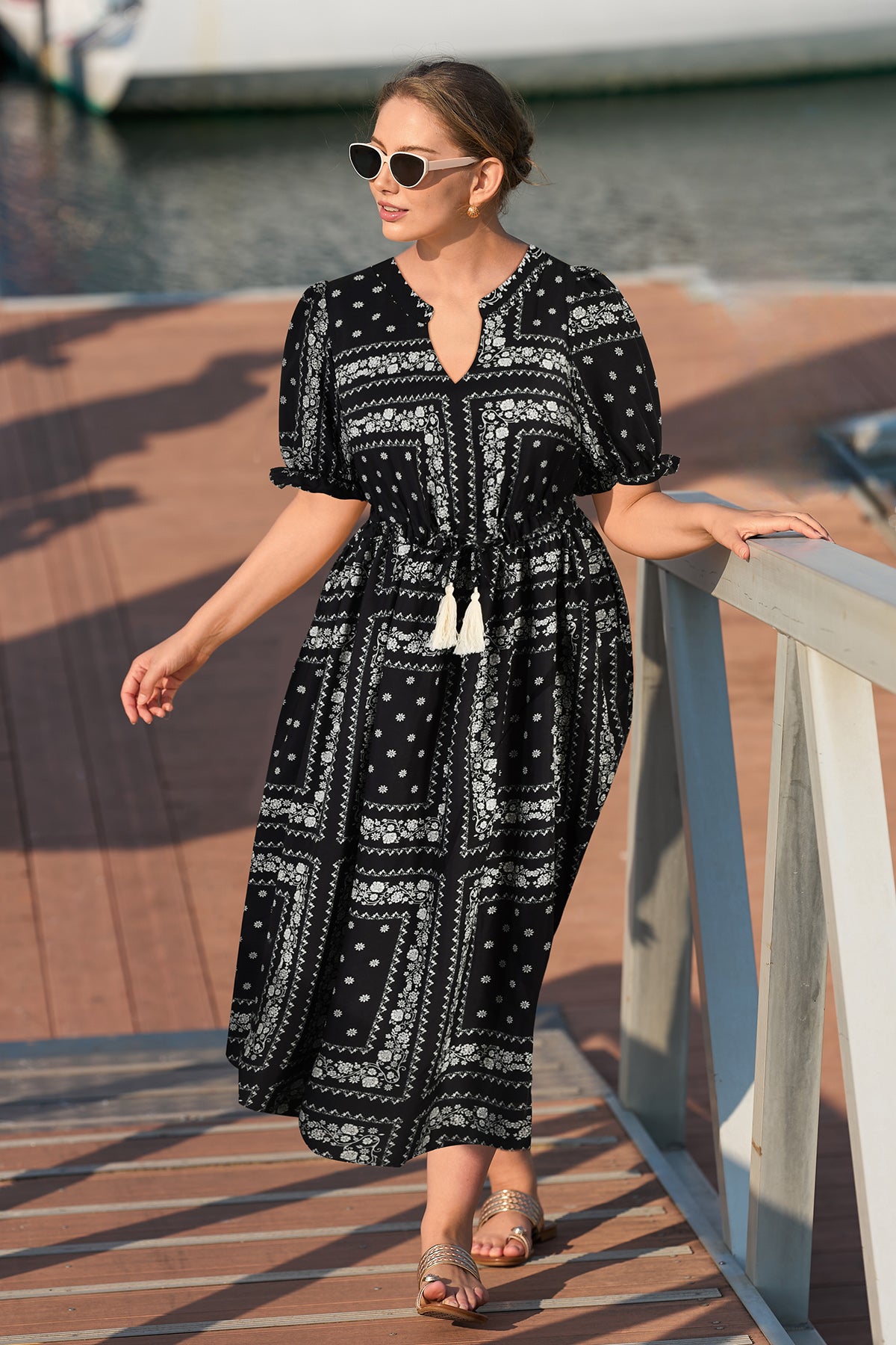 Pockets Elastic Waist Boho Midi Dress