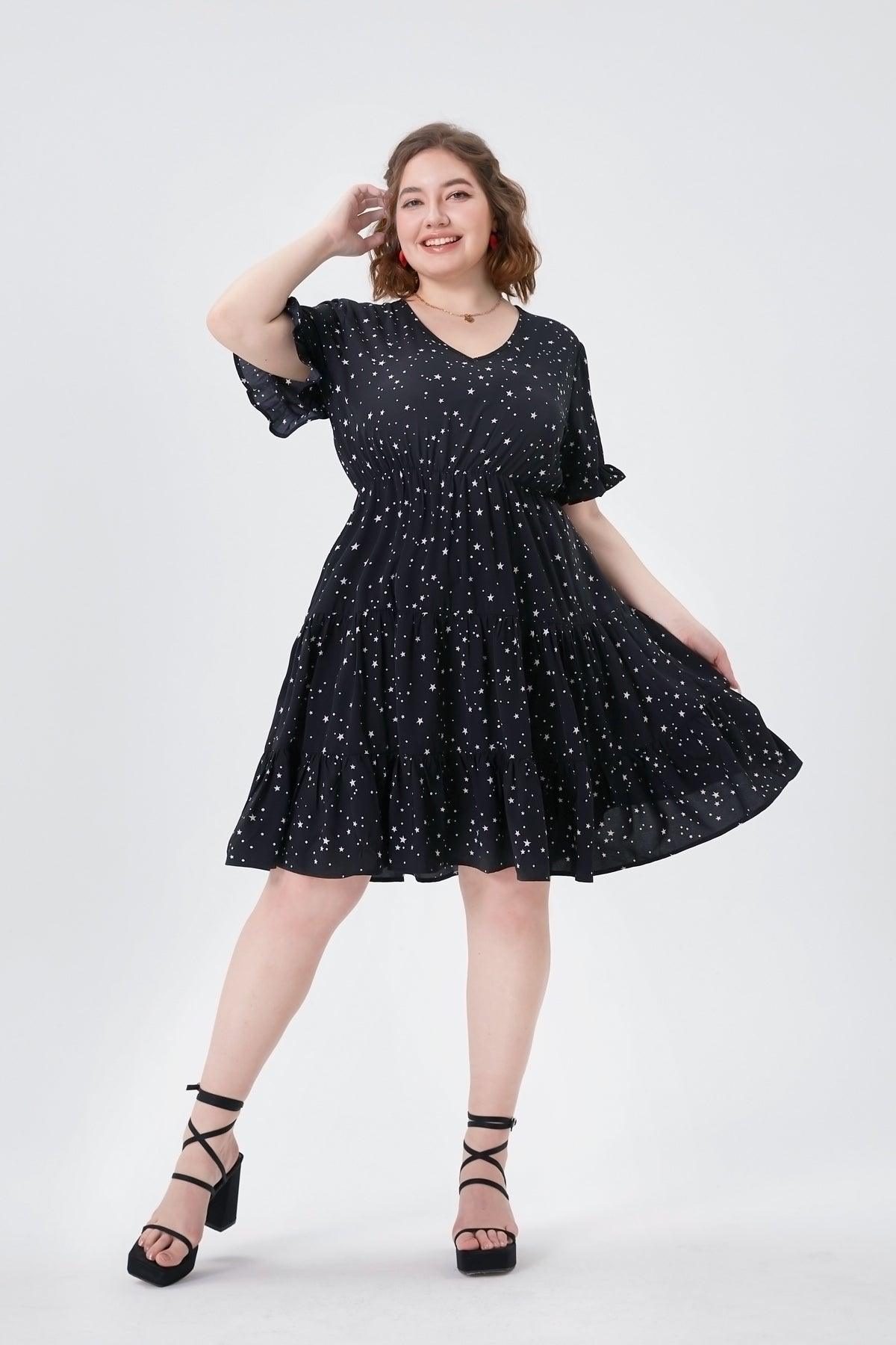 The Black Starts Ruffle Dress stands out from the crowd with its beautiful ruffle sleeves and black star pattern. The ruffles add a touch of femininity and sophistication, while the stars give the dress a playful and trendy vibe. Made from high-quality materials, this dress is not only stylish but also comfortable to wear.