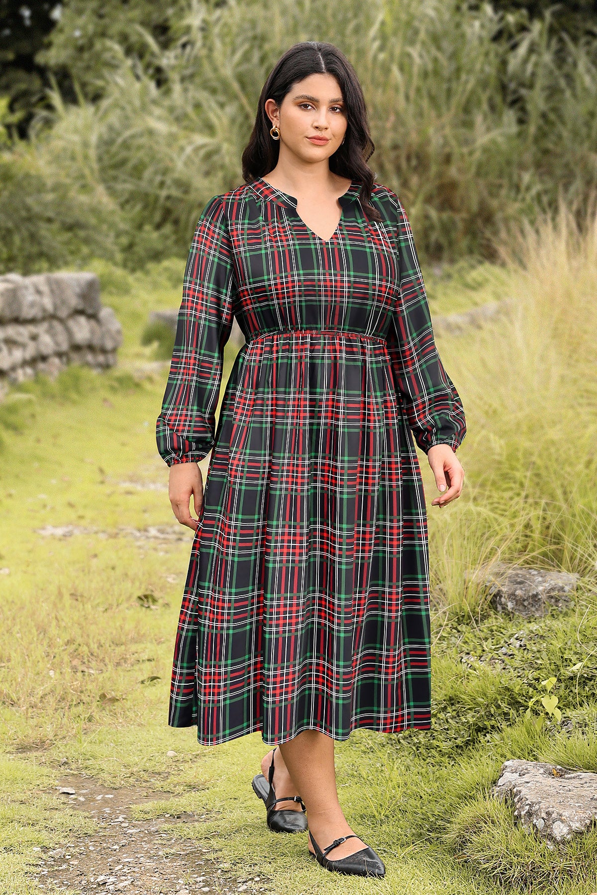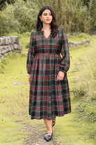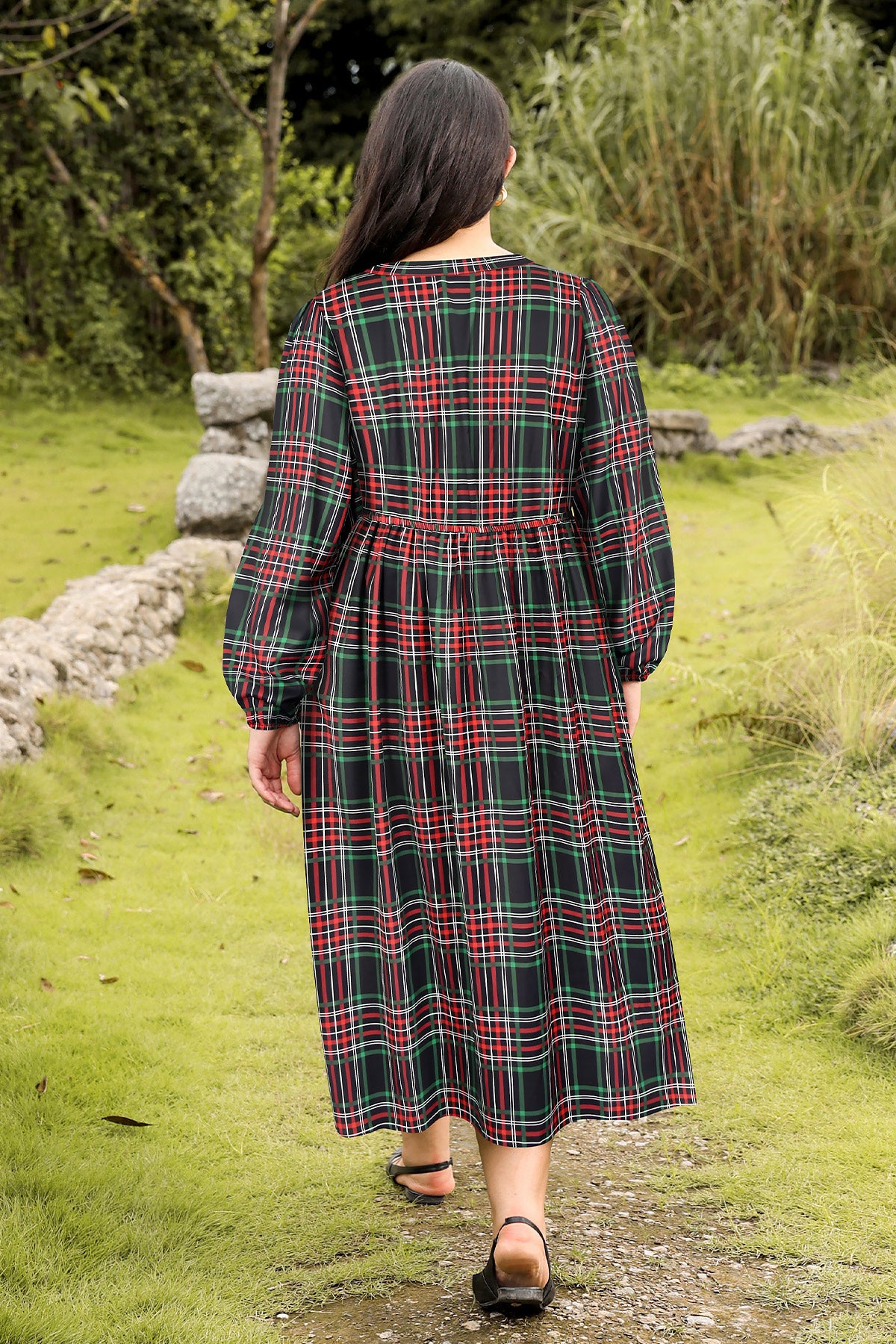 This dress captures the essence of cozy elegance, featuring a traditional tartan print that's perfect for the cooler months. Designed for comfort and versatility, it's an essential addition to your fall and winter wardrobe, ideal for holiday gatherings or everyday chic.