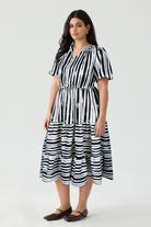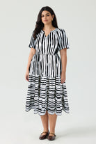 This oversized striped midi dress, crafted with vertical black-and-white stripes that elongate your silhouette, the V-neckline and short sleeves offer a balanced mix of elegance and comfort. The elastic waistband accentuates curves naturally, flowing into a tiered ruffle hem that dances with every step.
