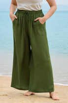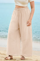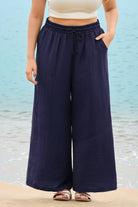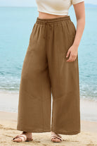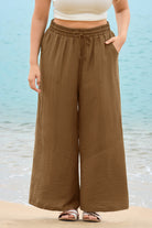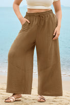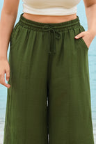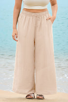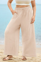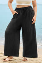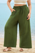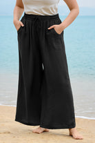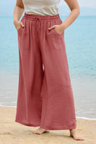 These sleek solid-color wide-leg pants feature a drawstring waist for customizable comfort, while deep side pockets add practicality. The flowy, relaxed fit brings effortless ease, balancing casual style with daily versatility.