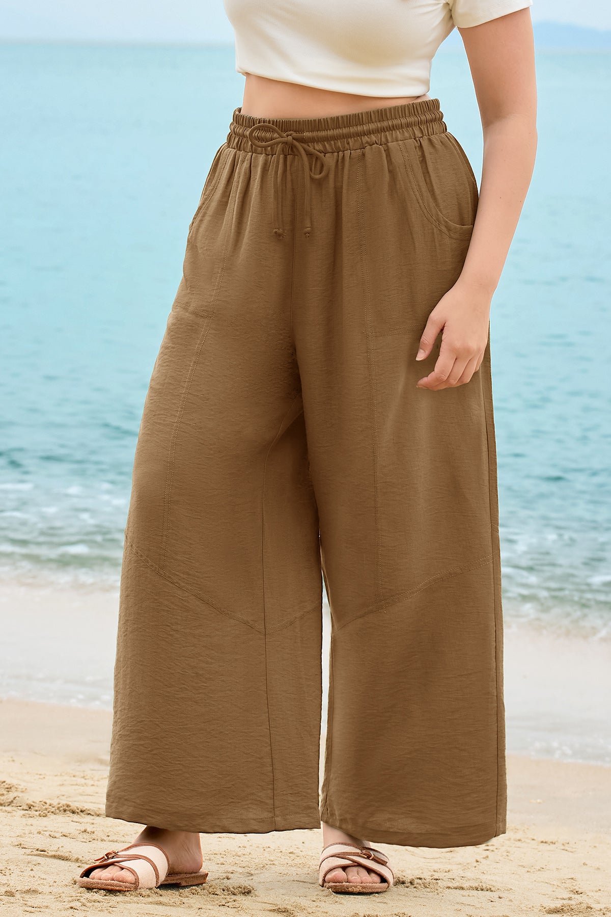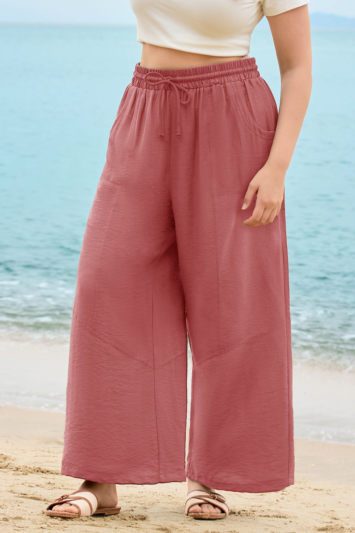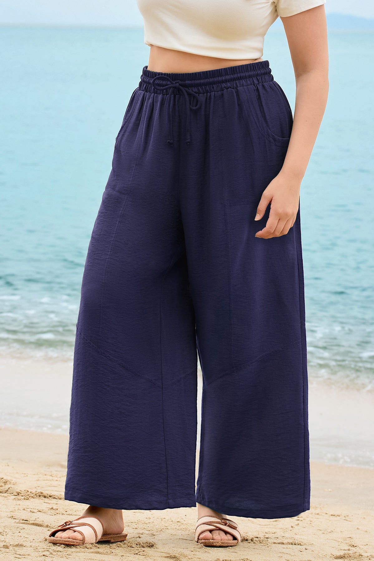 - Details: Drawstring waist, Deep side pockets, Wide-leg cut