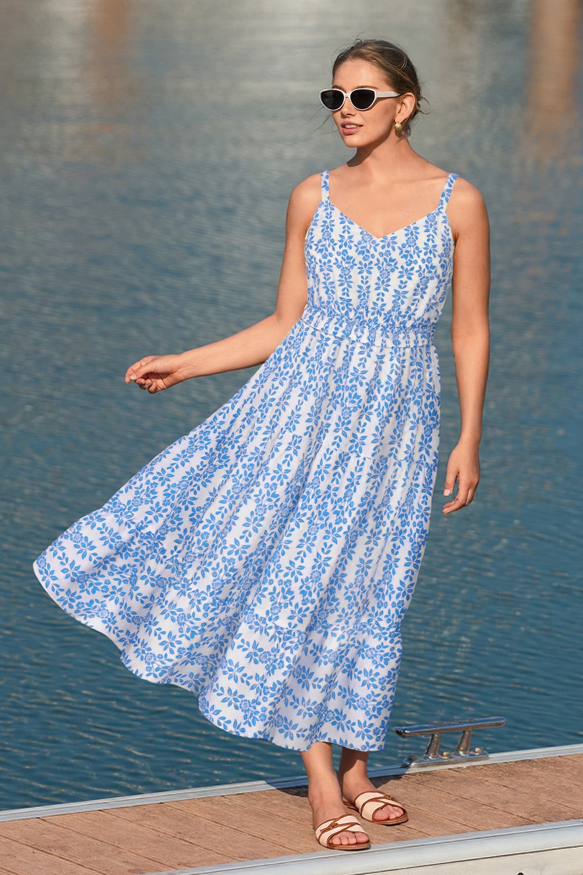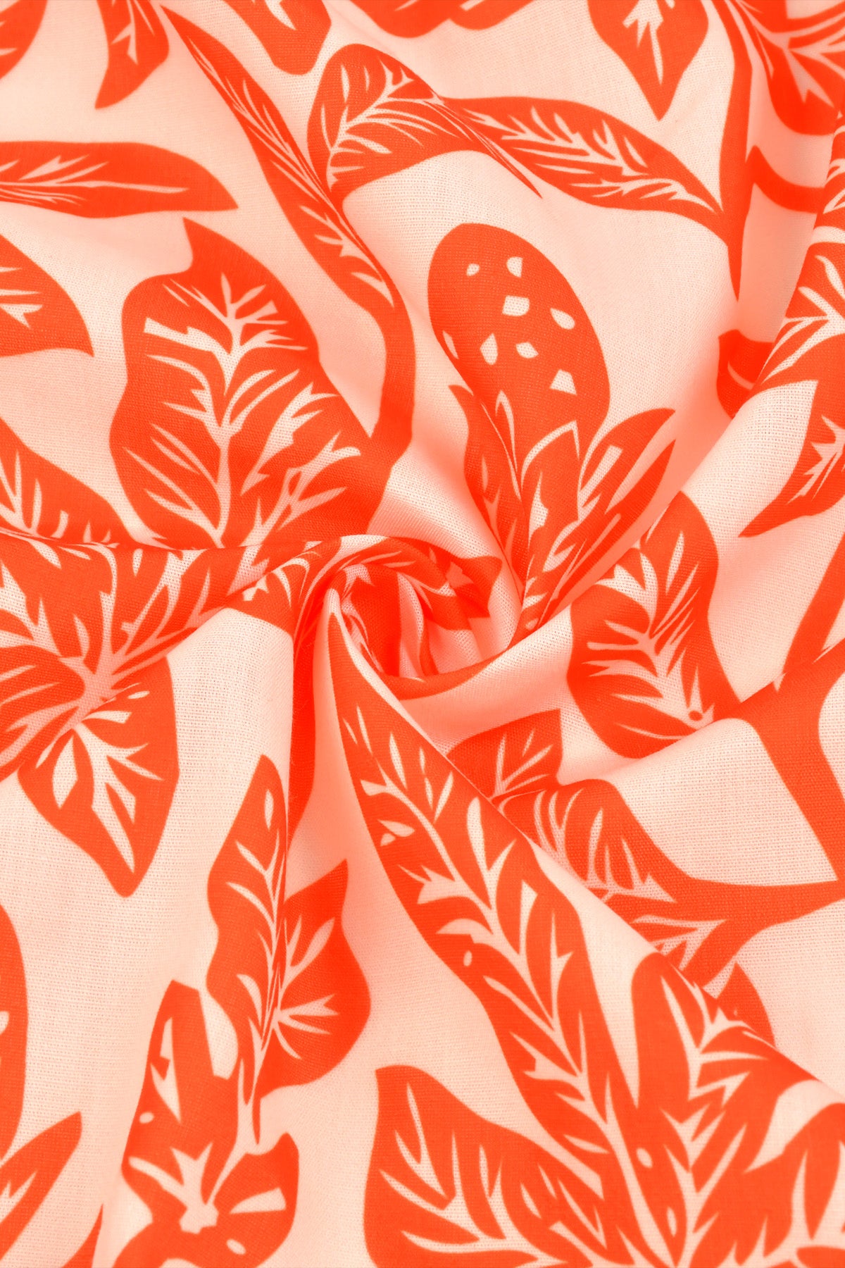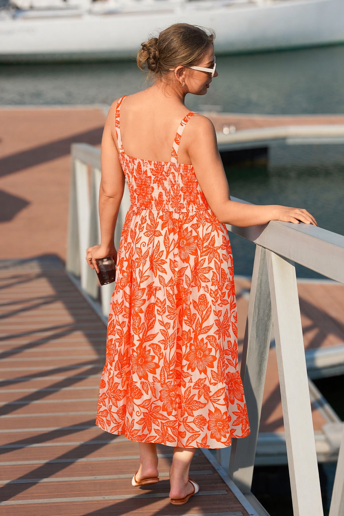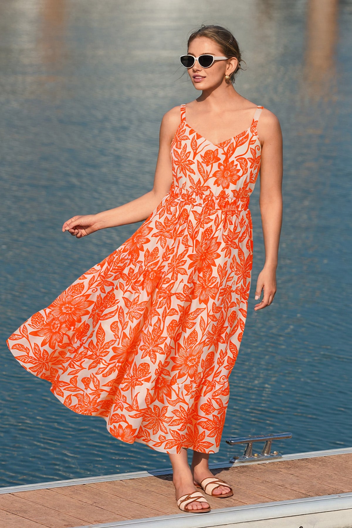 Tropical Orange Floral Print Smocked Adjustable Straps Midi Dress