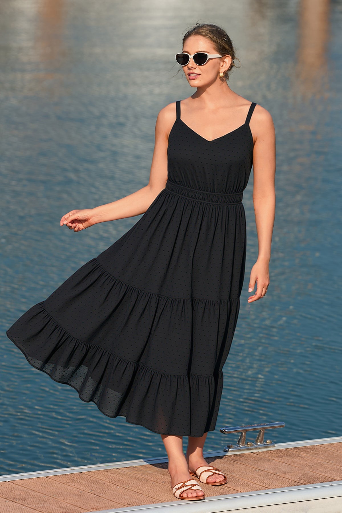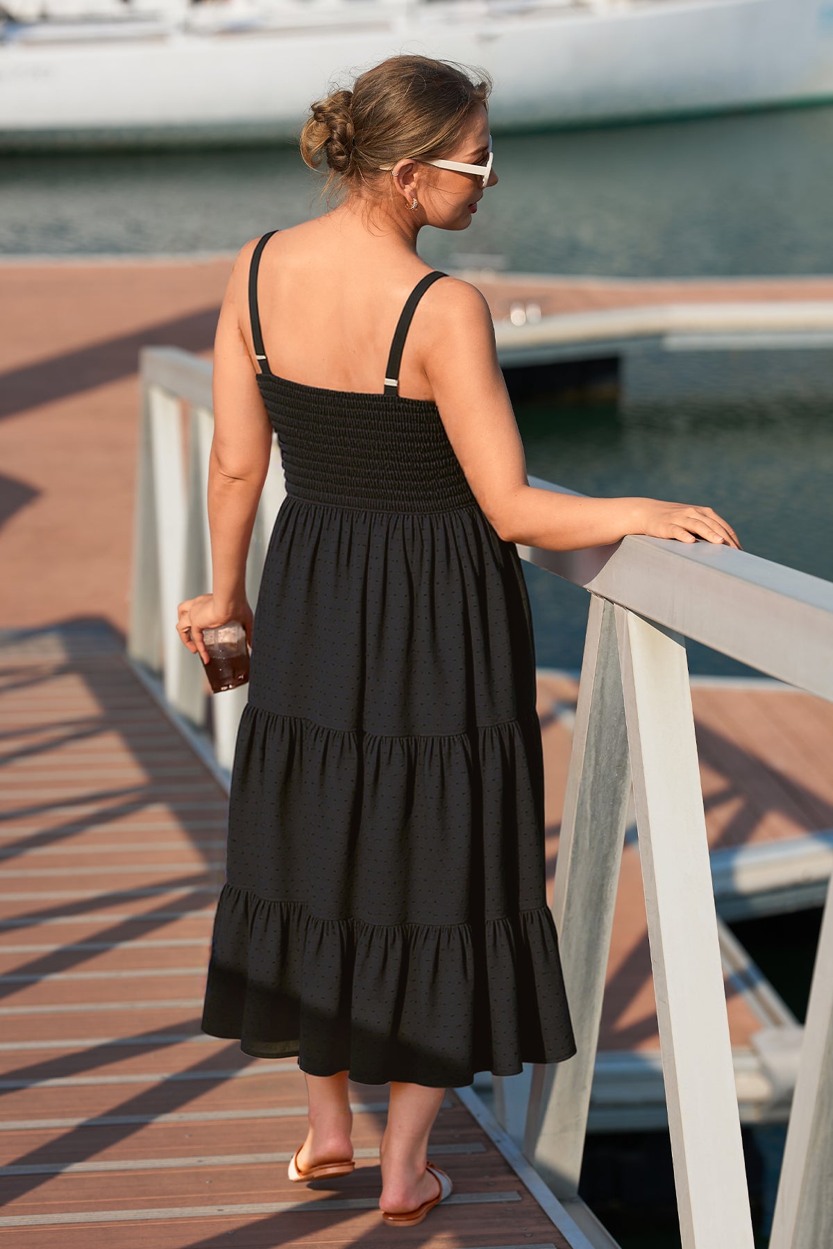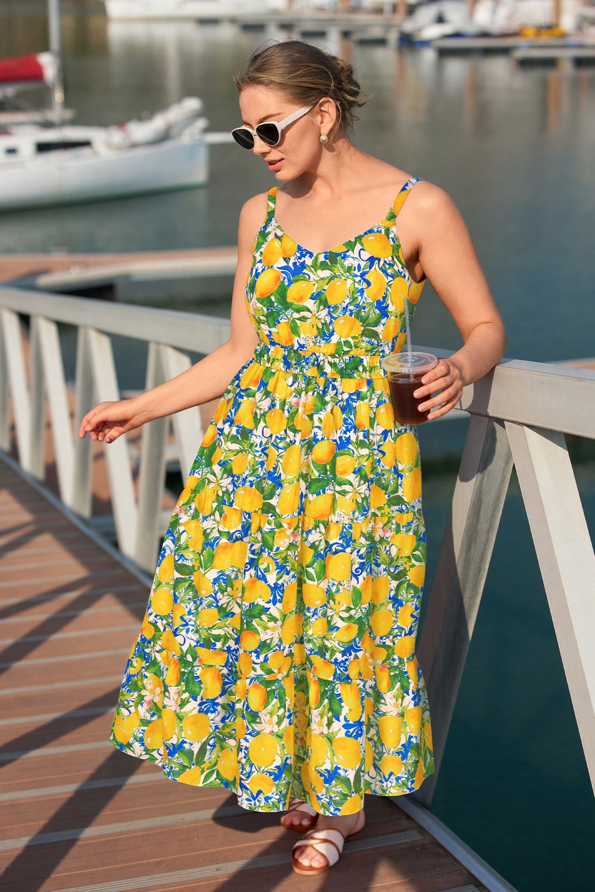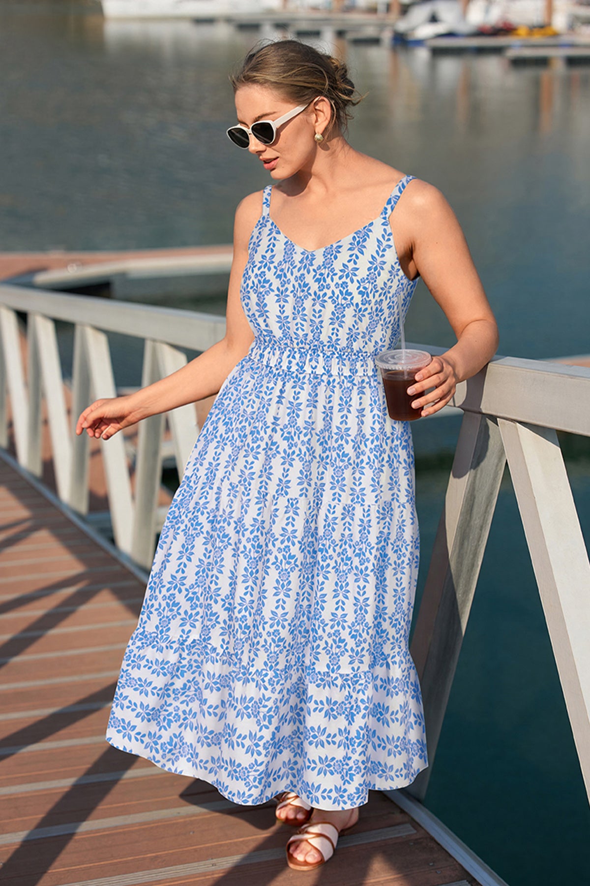 Tropical Orange Floral Print Smocked Adjustable Straps Midi Dress