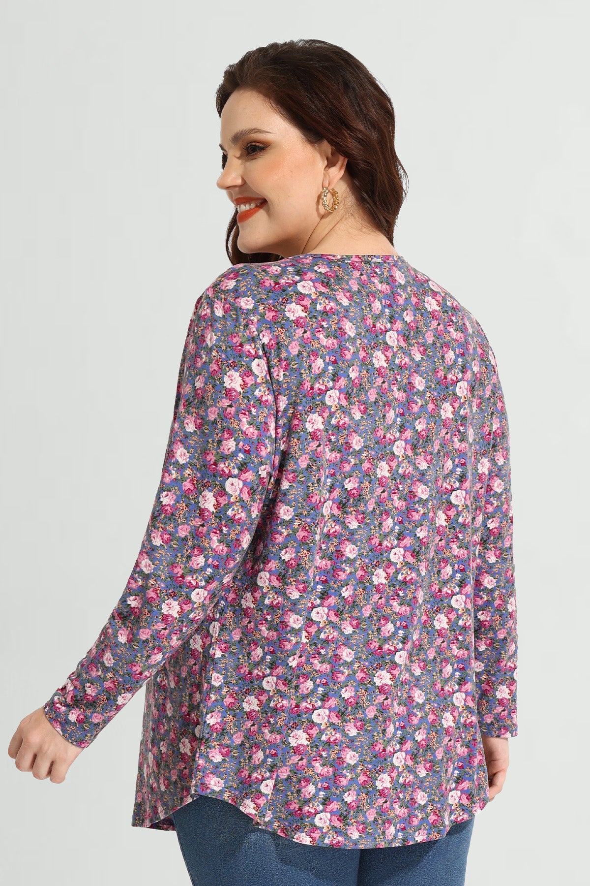Floral Print Ruffled V-Neckline Long Sleeve Blouse