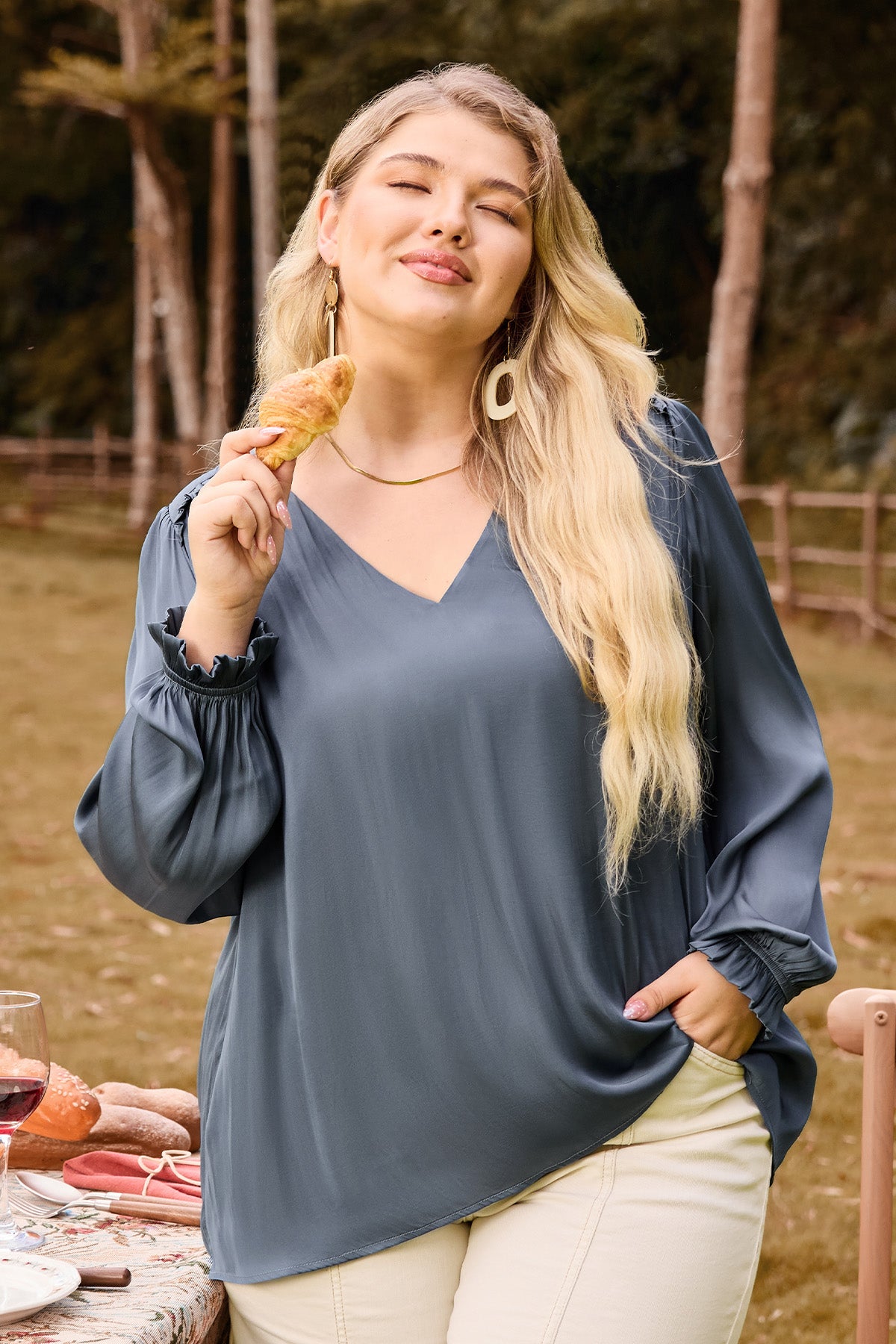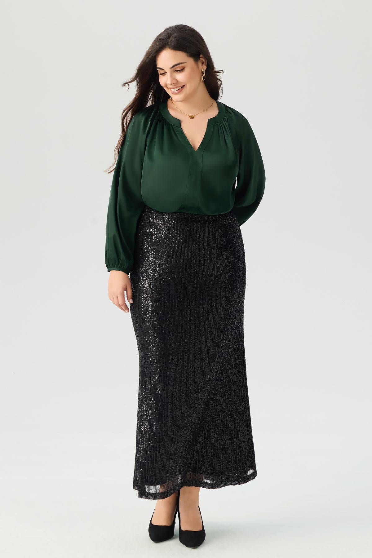 Emerald Green Satin V-Neck Puff Sleeve Blouse