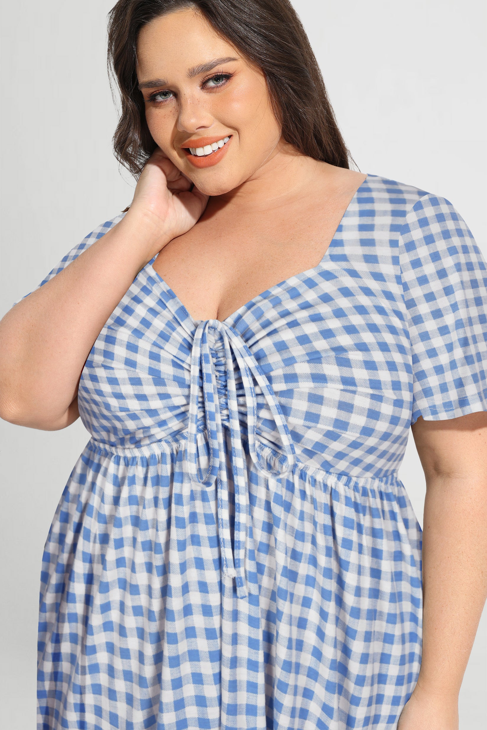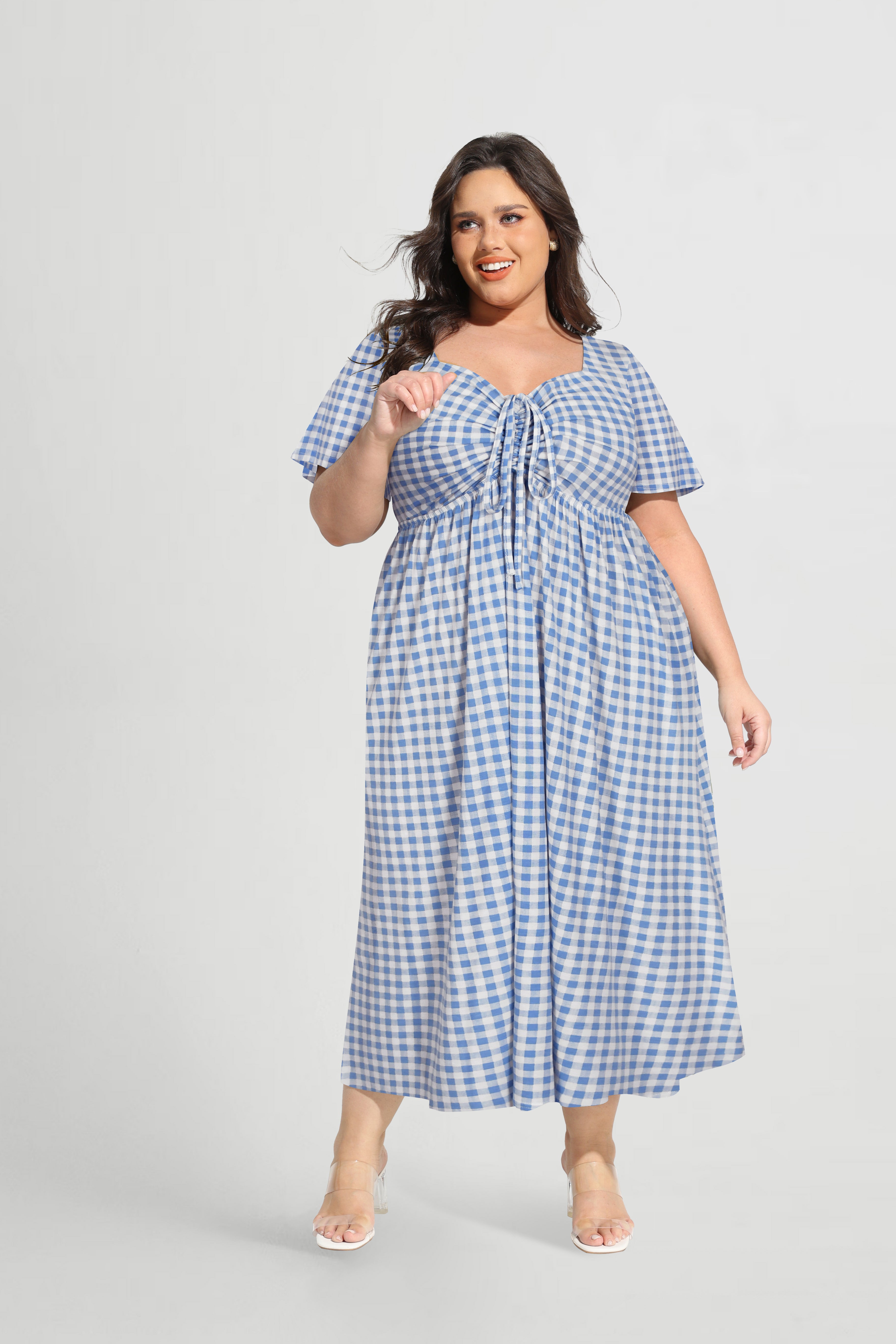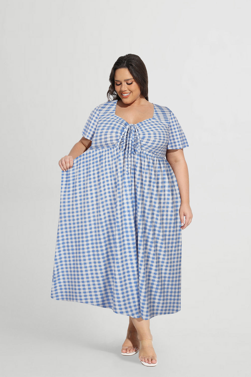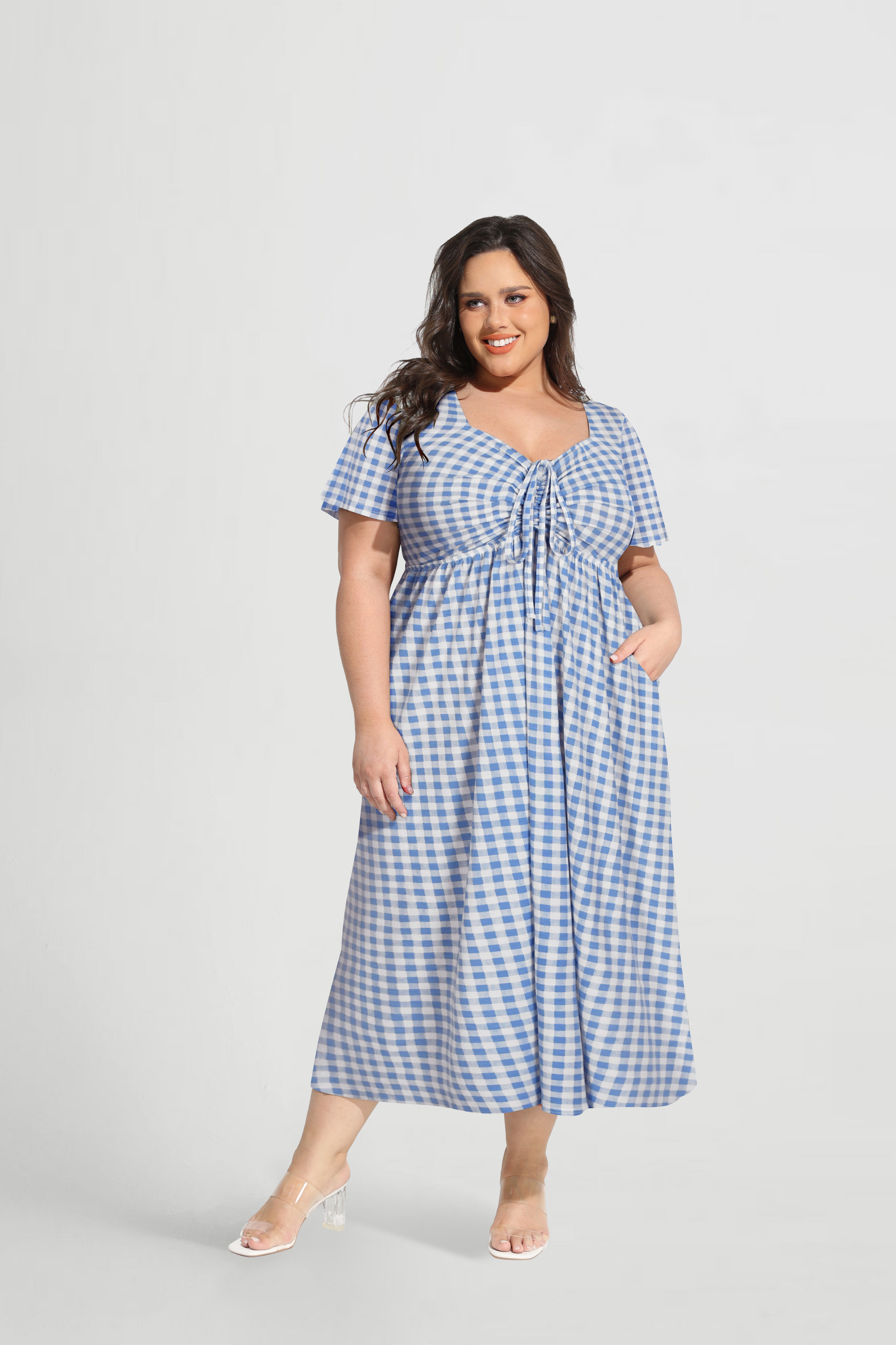 Ritera Pockets Plaid Button Up Polo Neck Shirred Midi Dress