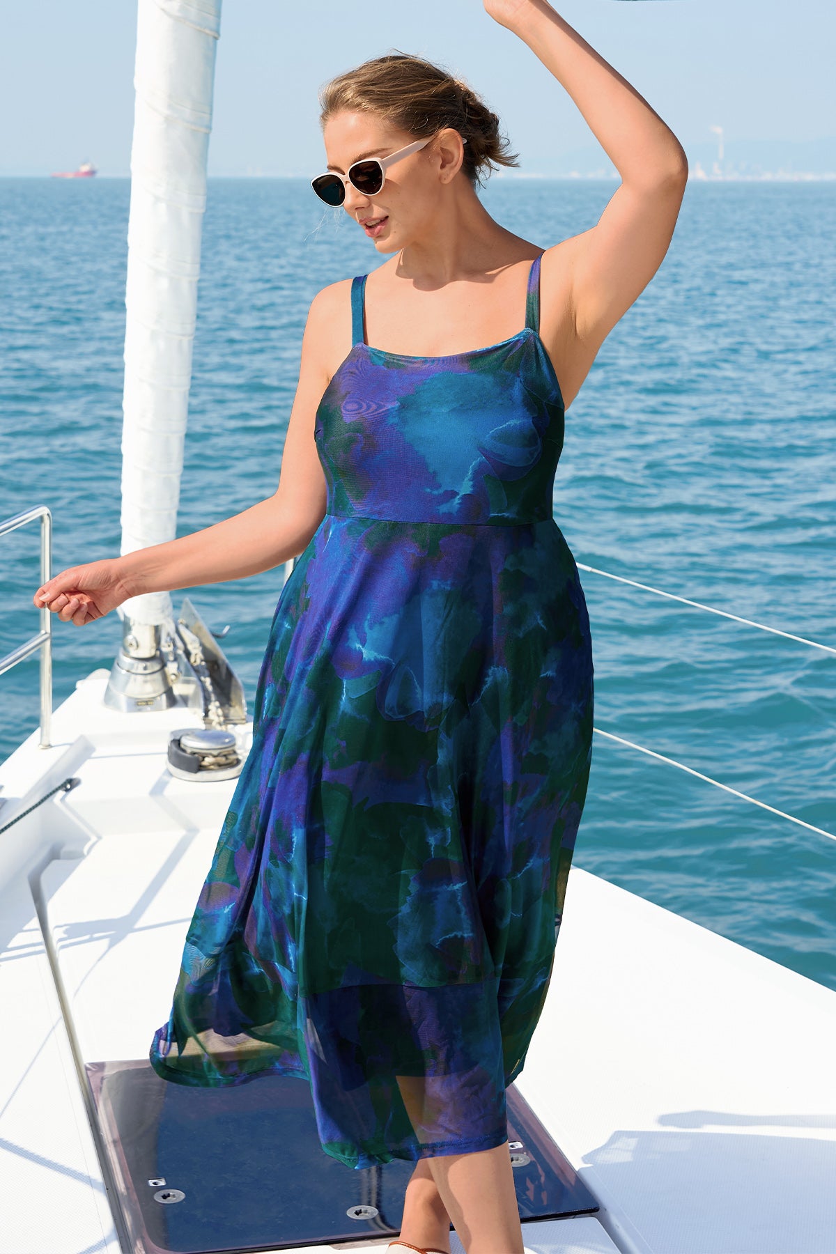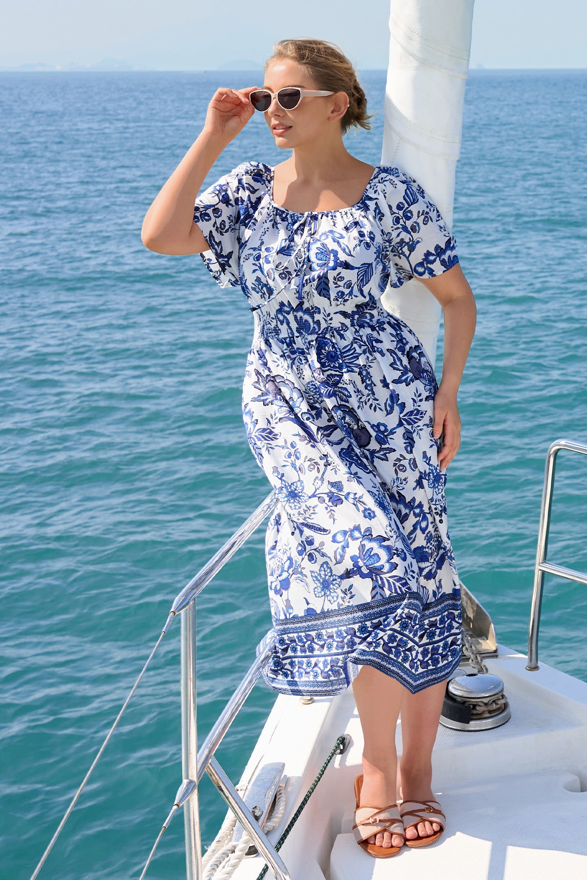 Blue Botanical Square Neck Sleeveless Midi Dress