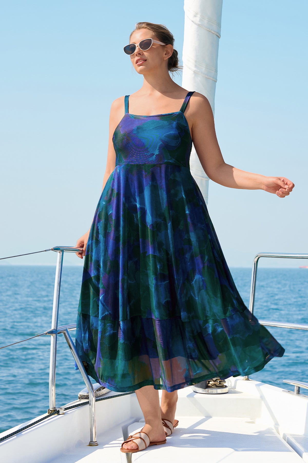 Watercolor Print Spaghetti Strap Flowy Tiered Midi Dress