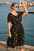 This charming midi dress features a timeless black folk-inspired print with delicate white motifs, bringing a bohemian yet polished vibe. Its practical side pockets add everyday convenience, while the tie-front square neck and ruffled short sleeves offer soft femininity—paired with a flowy A-line skirt that moves smoothly, balancing casual functionality and effortless style.