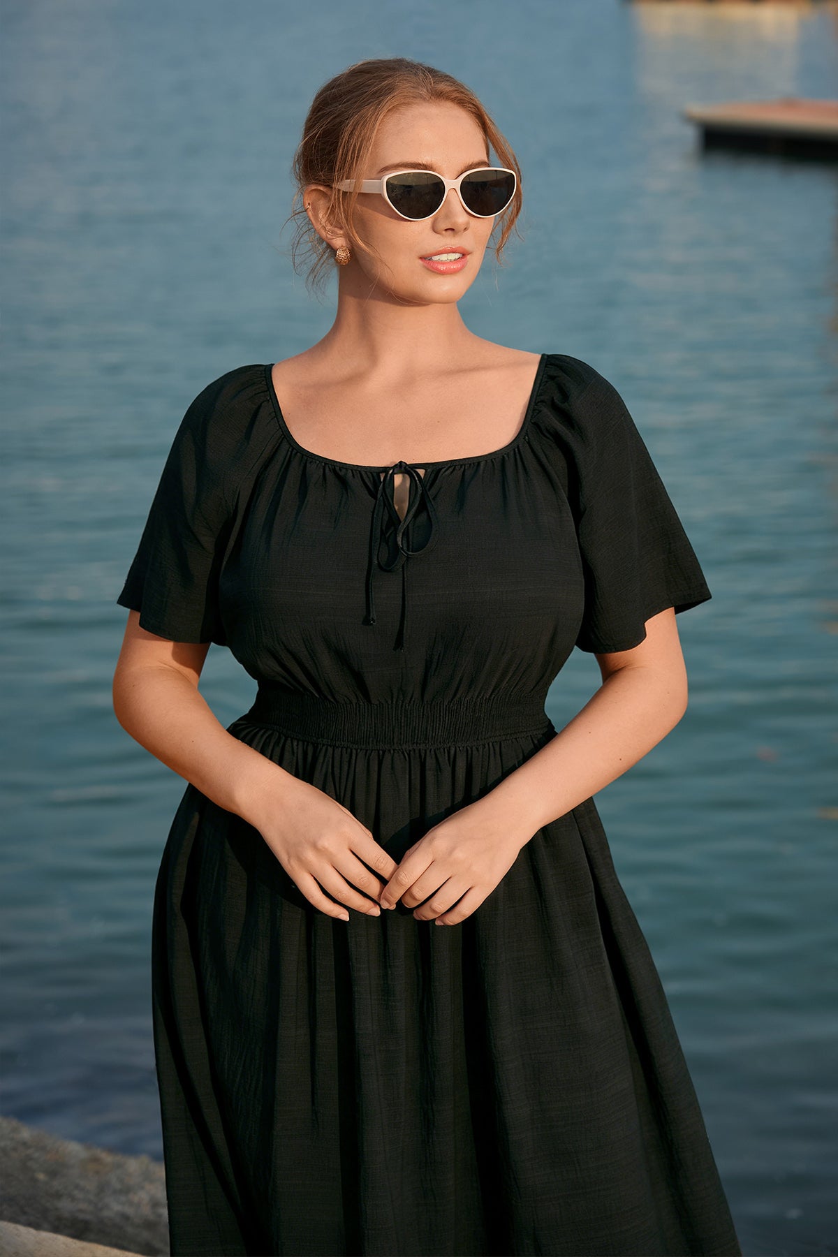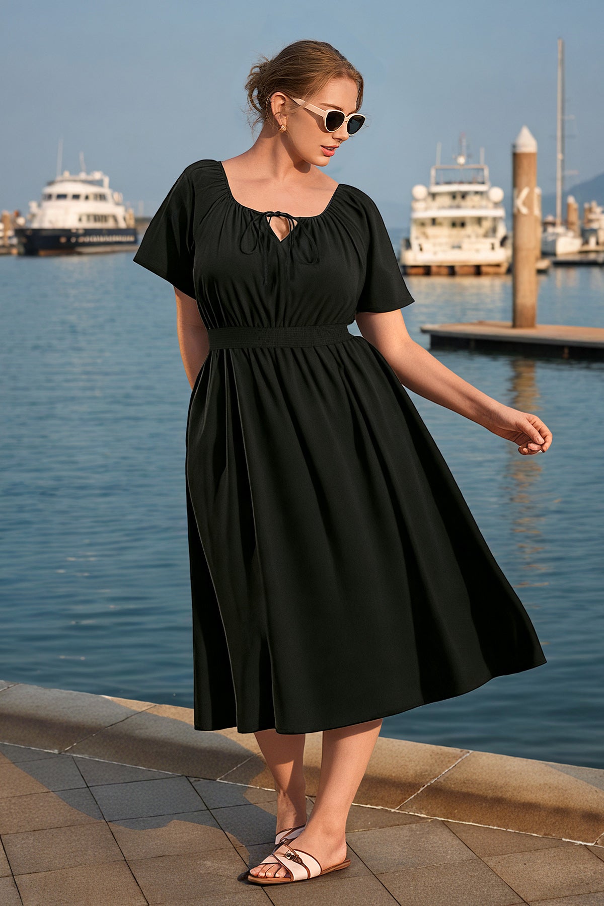 Pockets Elastic Waist Boho Embroidered Midi Dress