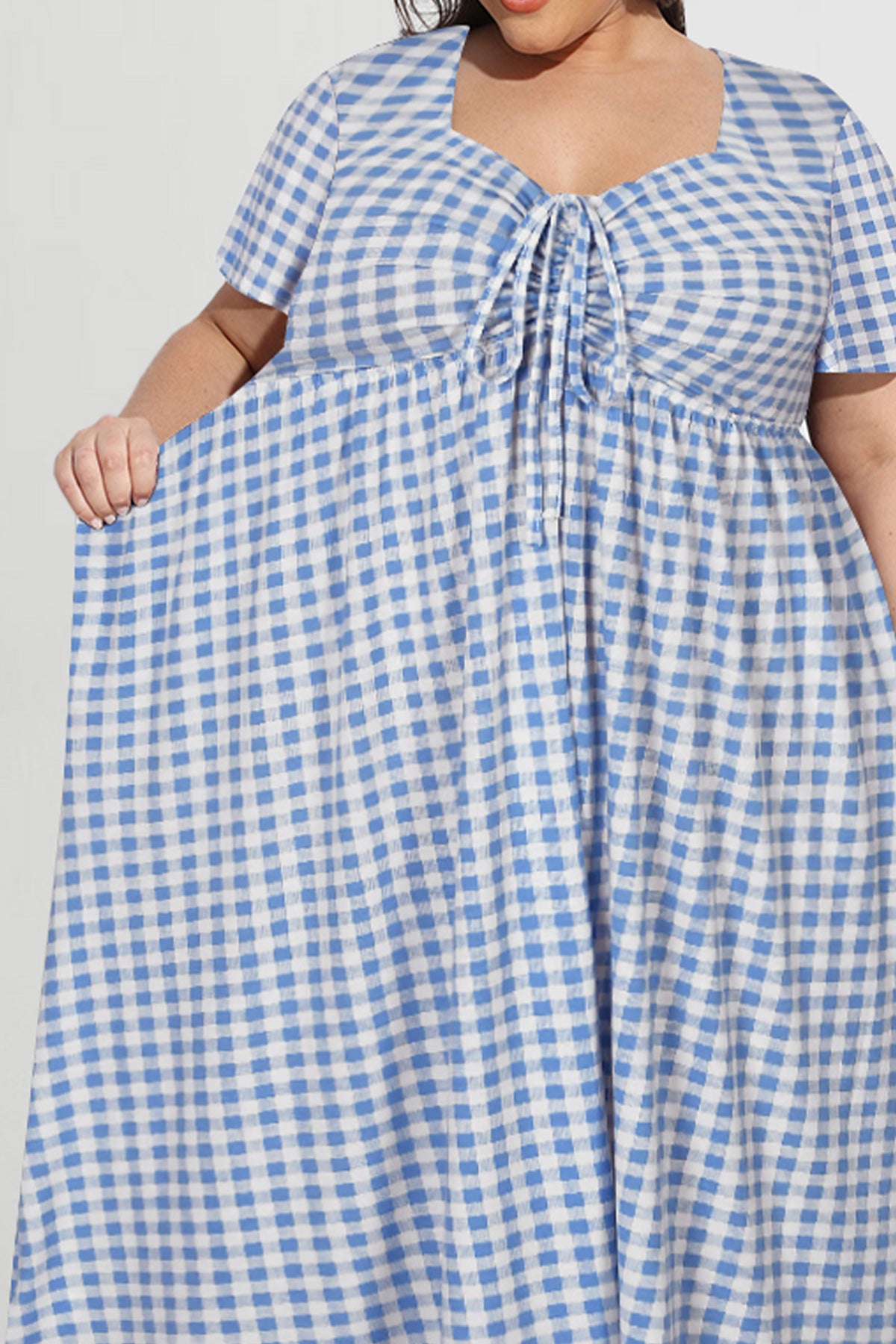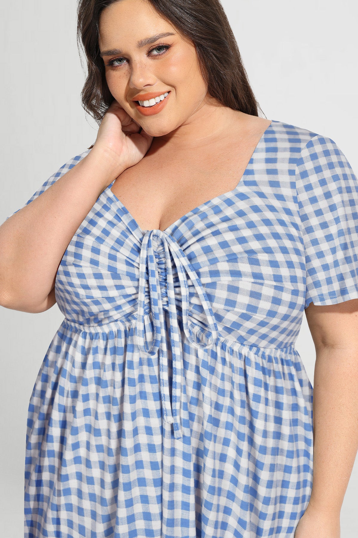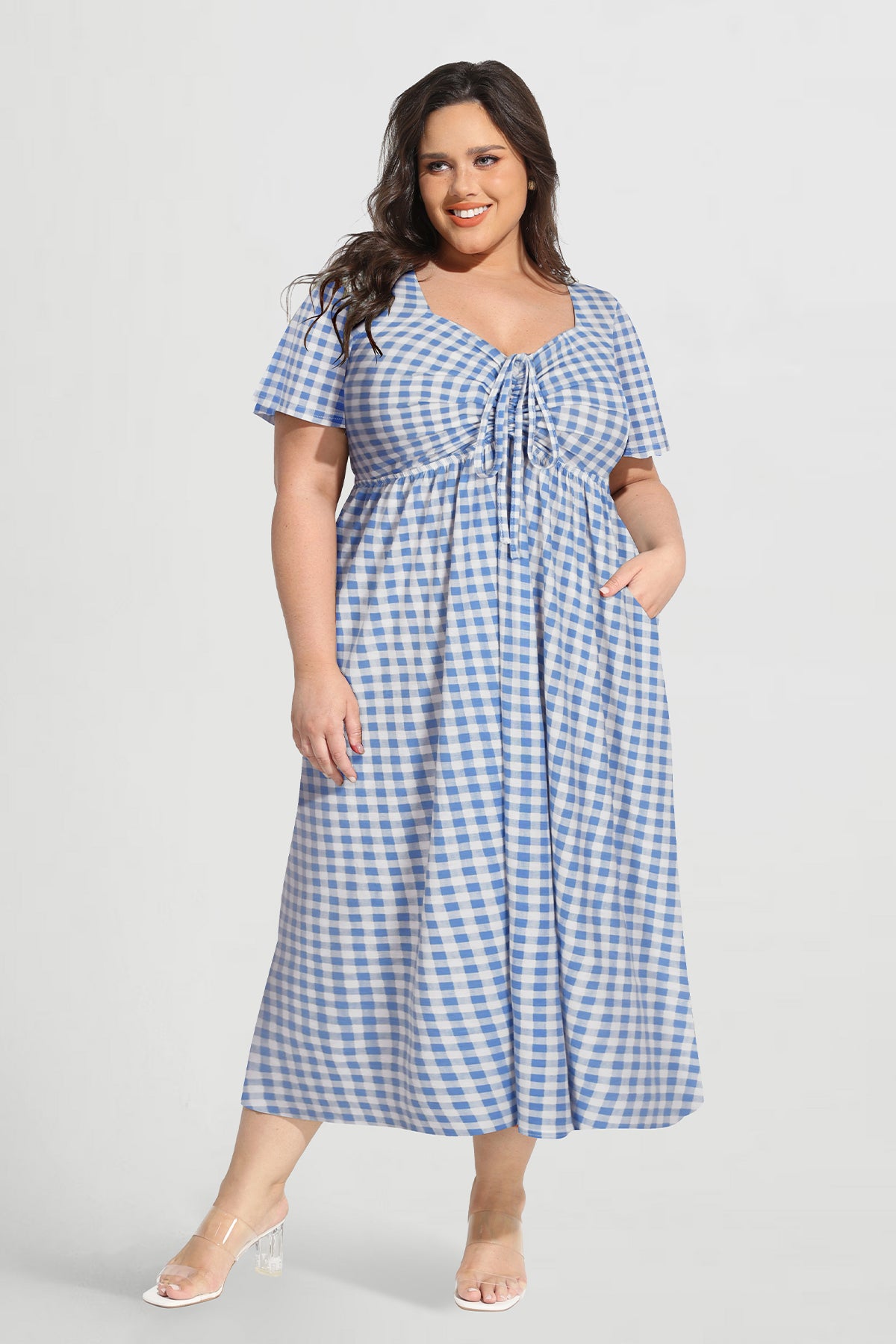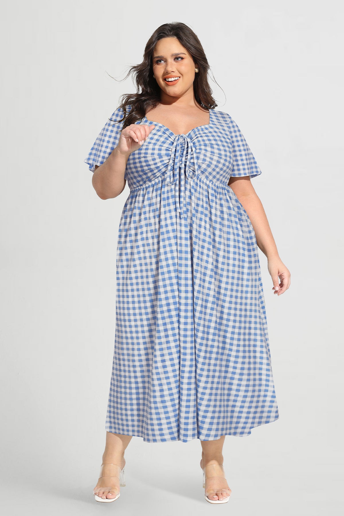 This charming midi dress features classic blue gingham prints that feel fresh and timeless. Its tie-front square neck adds a playful, adjustable touch, while the flowy A-line skirt offers relaxed comfort—paired with short flutter sleeves that bring soft femininity, balancing casual charm and effortless style.