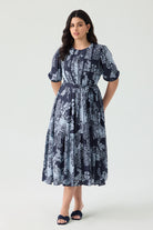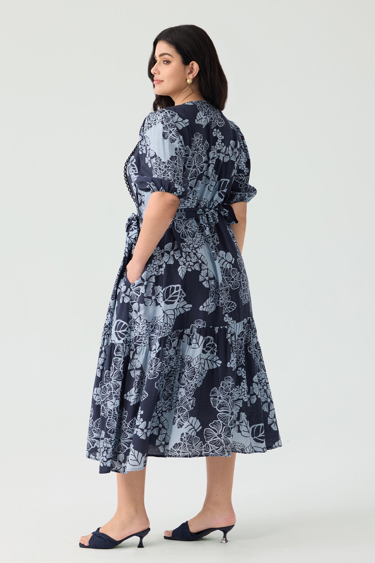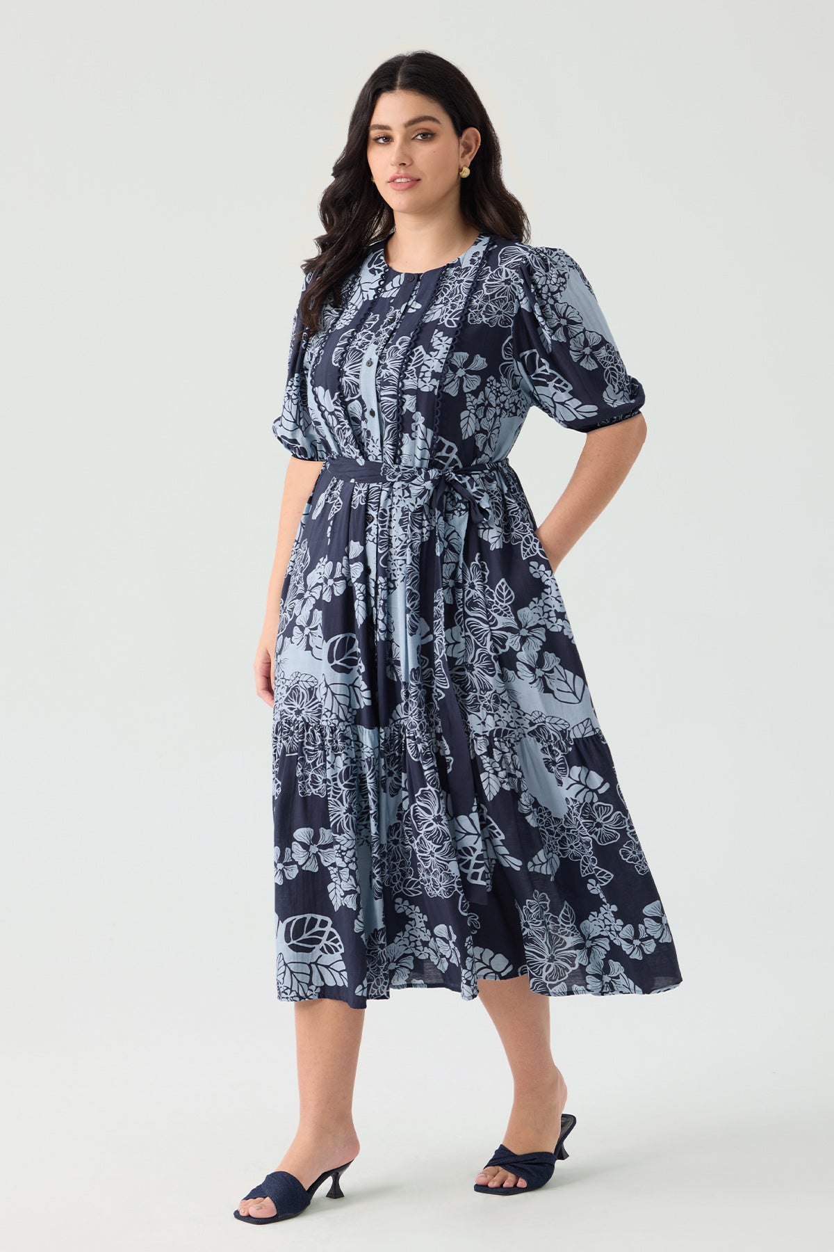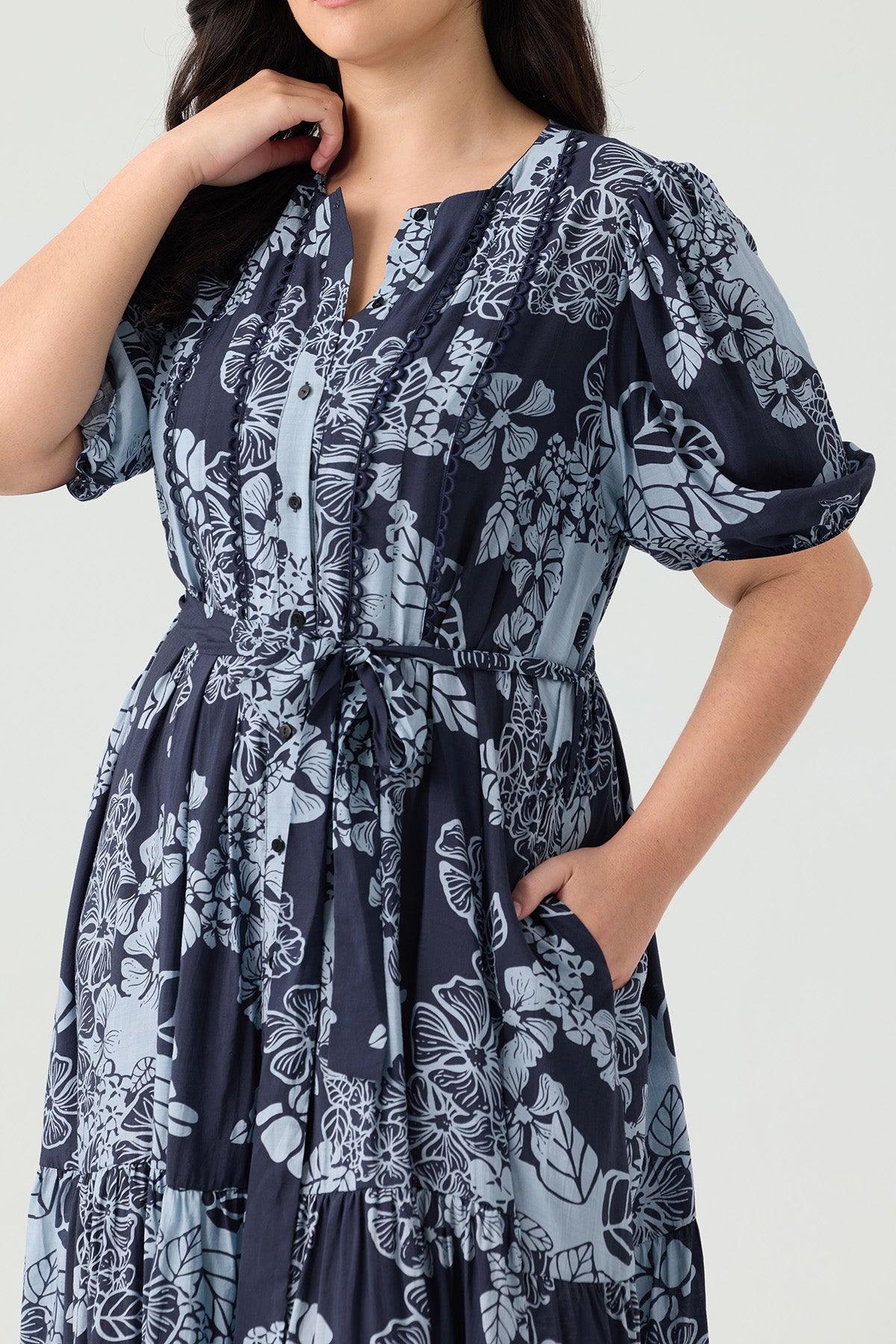 Step into comfort and style with our enchanting plus-size tiered midi dress, featuring a captivating blue floral print. Designed to flatter and flow, this dress is a versatile addition to your wardrobe, perfect for everything from sunny picnics to elegant brunches.