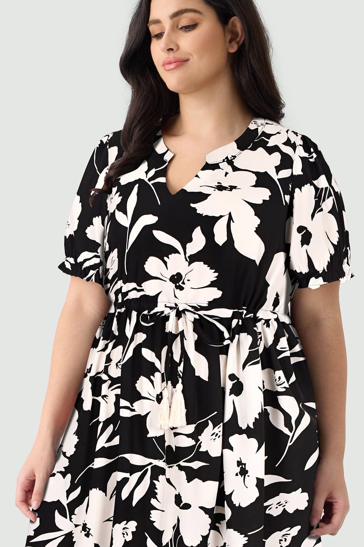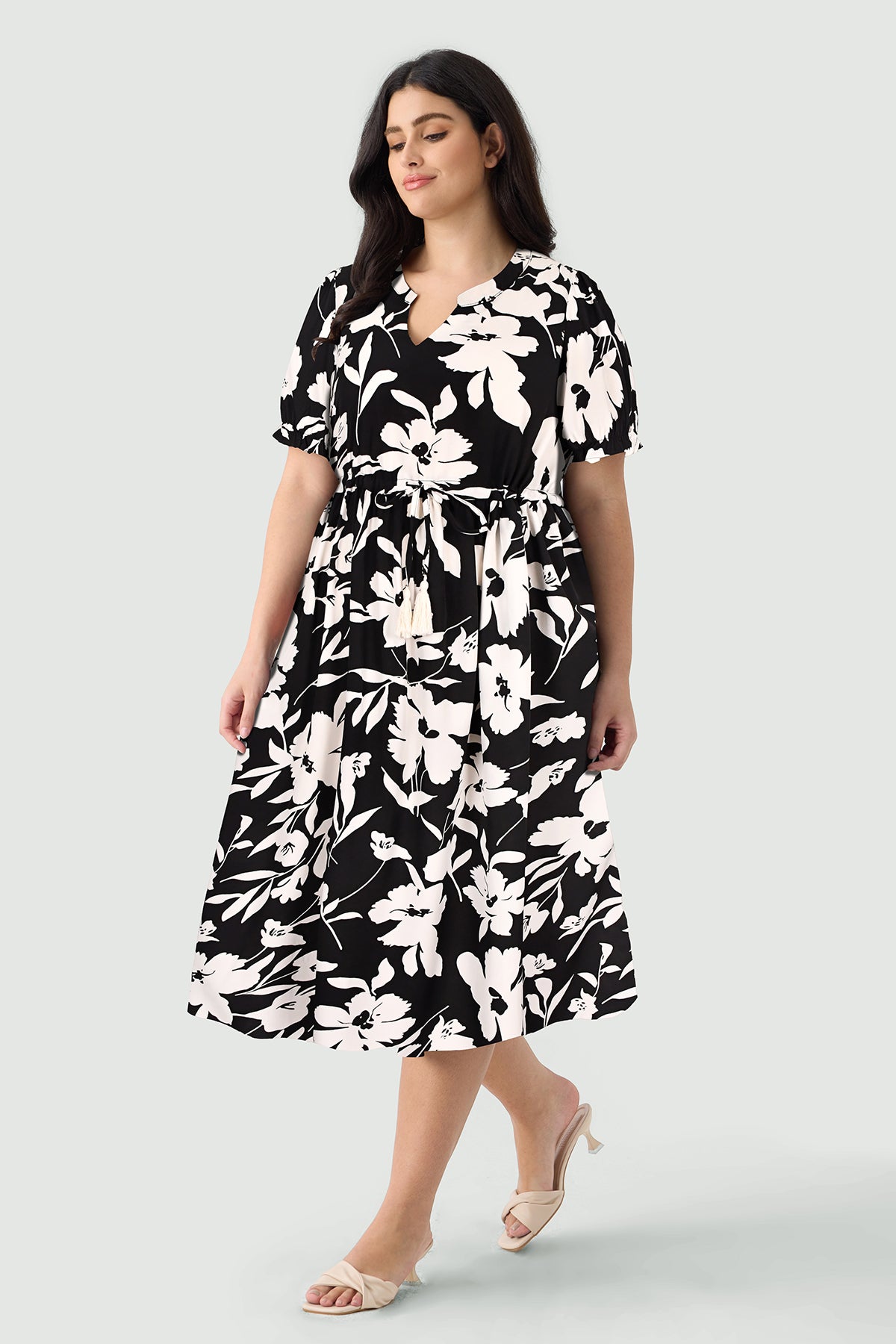 Floral Print Drawstring Tassel Waist A-line V-neck Midi Dress