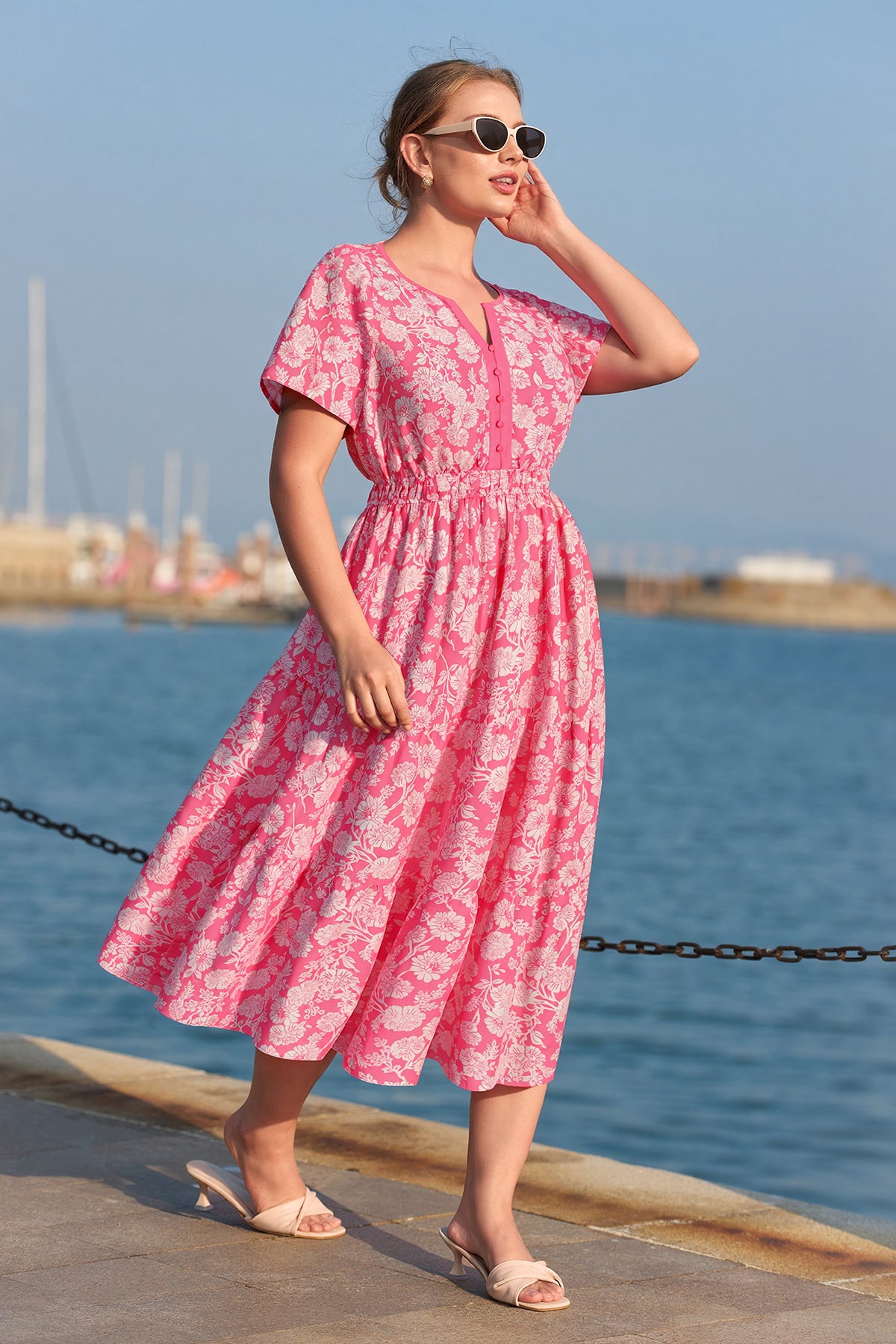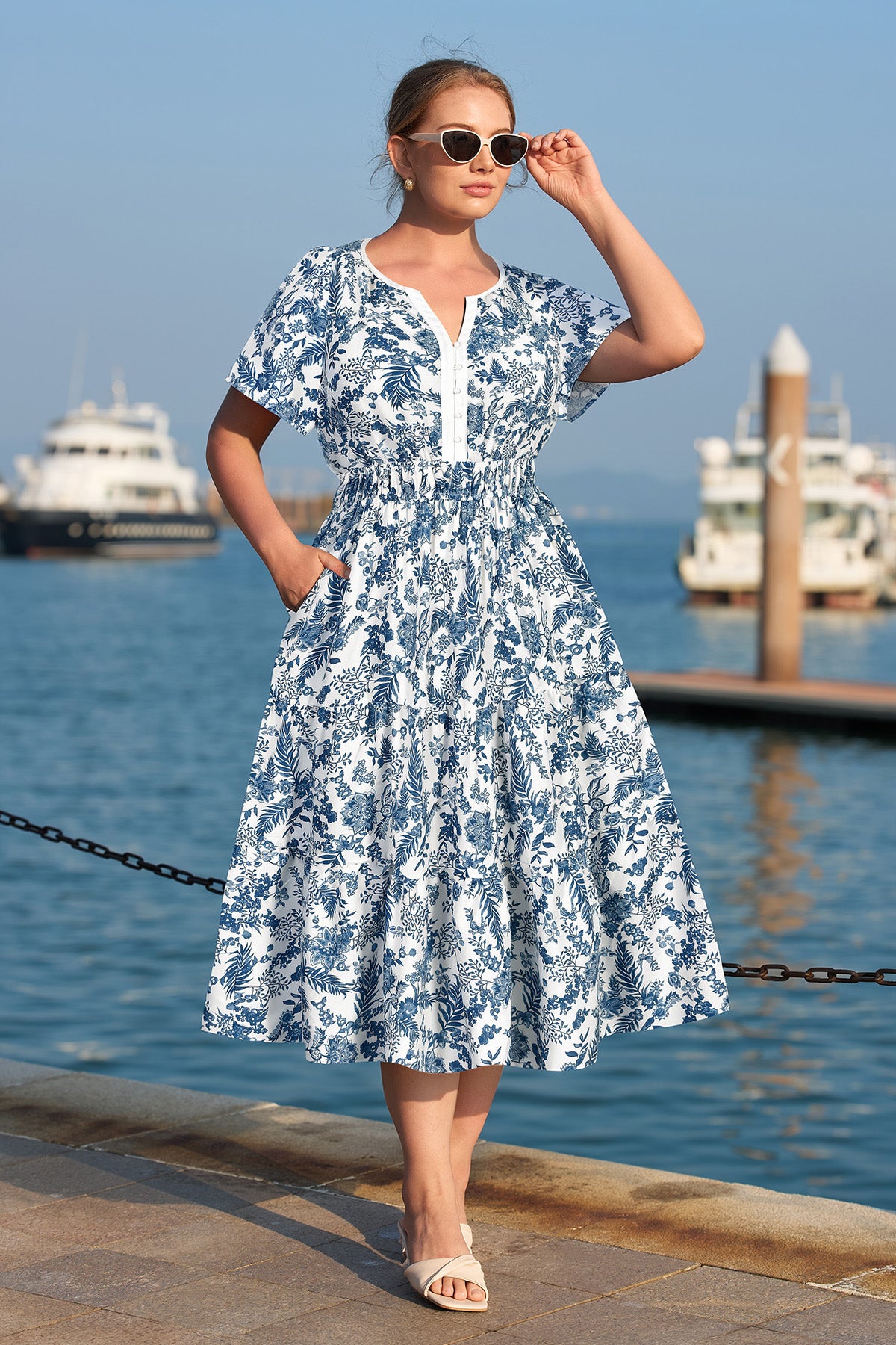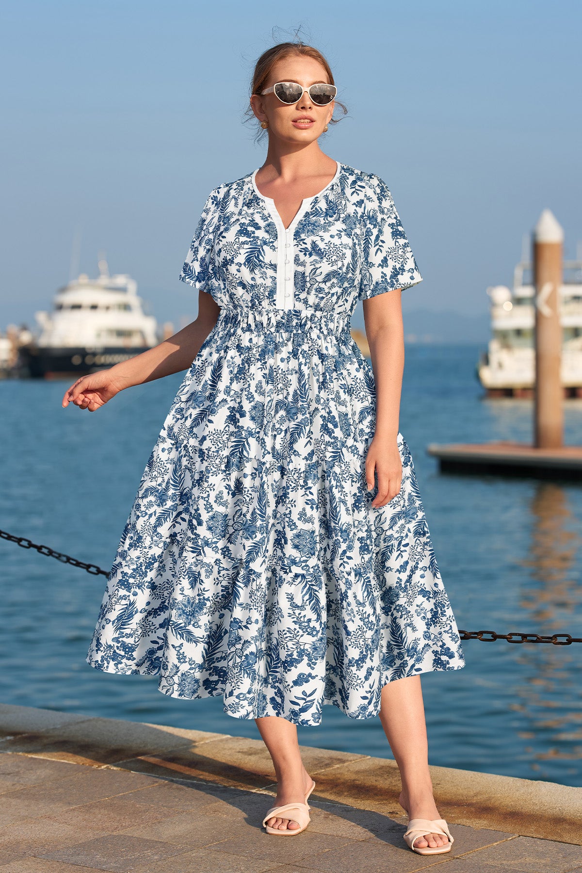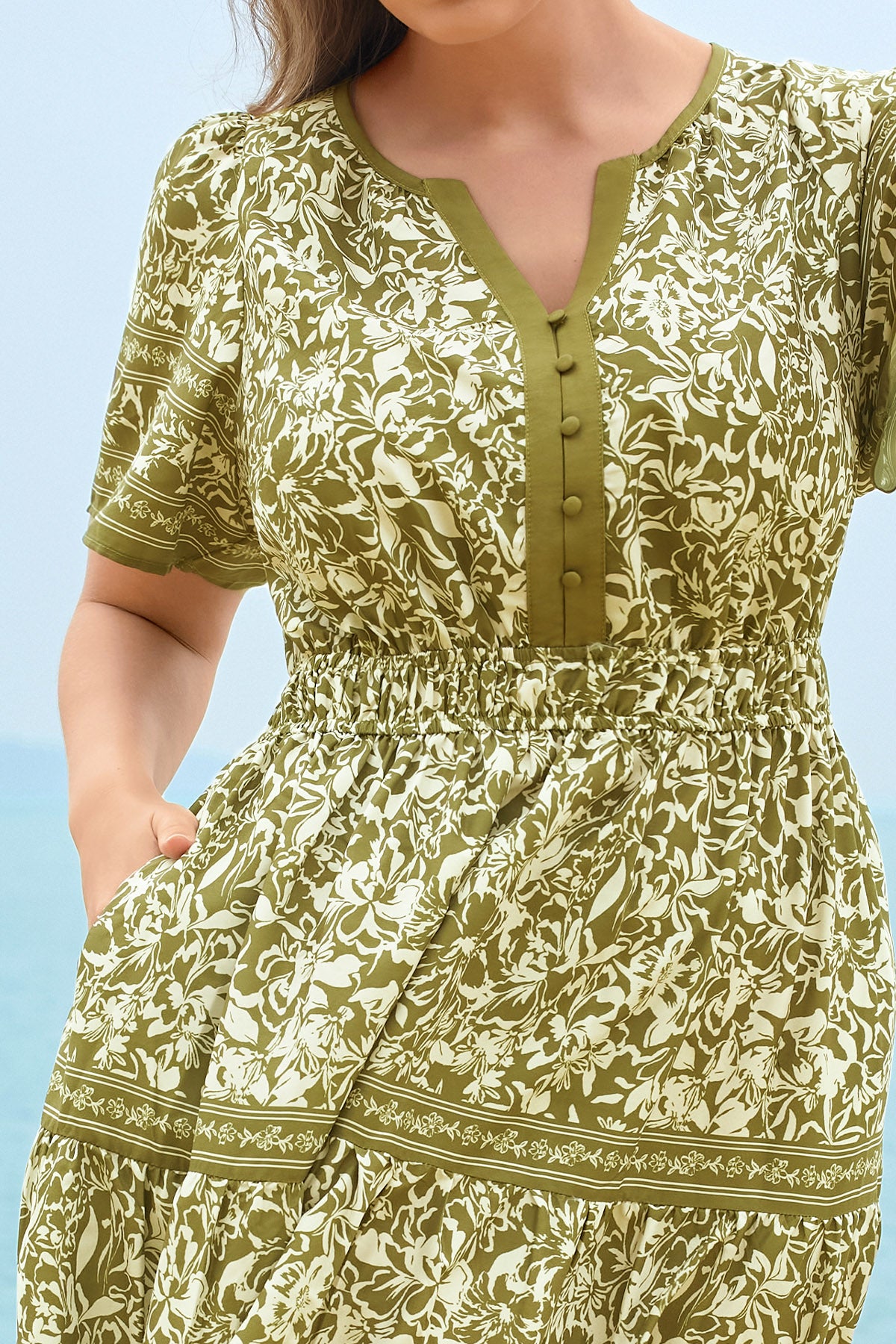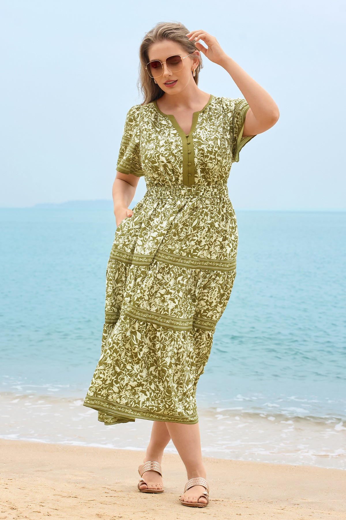 This airy olive green midi dress features delicate leaf prints paired with a contrast-button V-neck (a standout detail that adds subtle visual interest). Its smocked waist cinches gently for a flattering fit, while short sleeves and a tiered skirt bring soft movement—balancing casual charm and effortless style.
