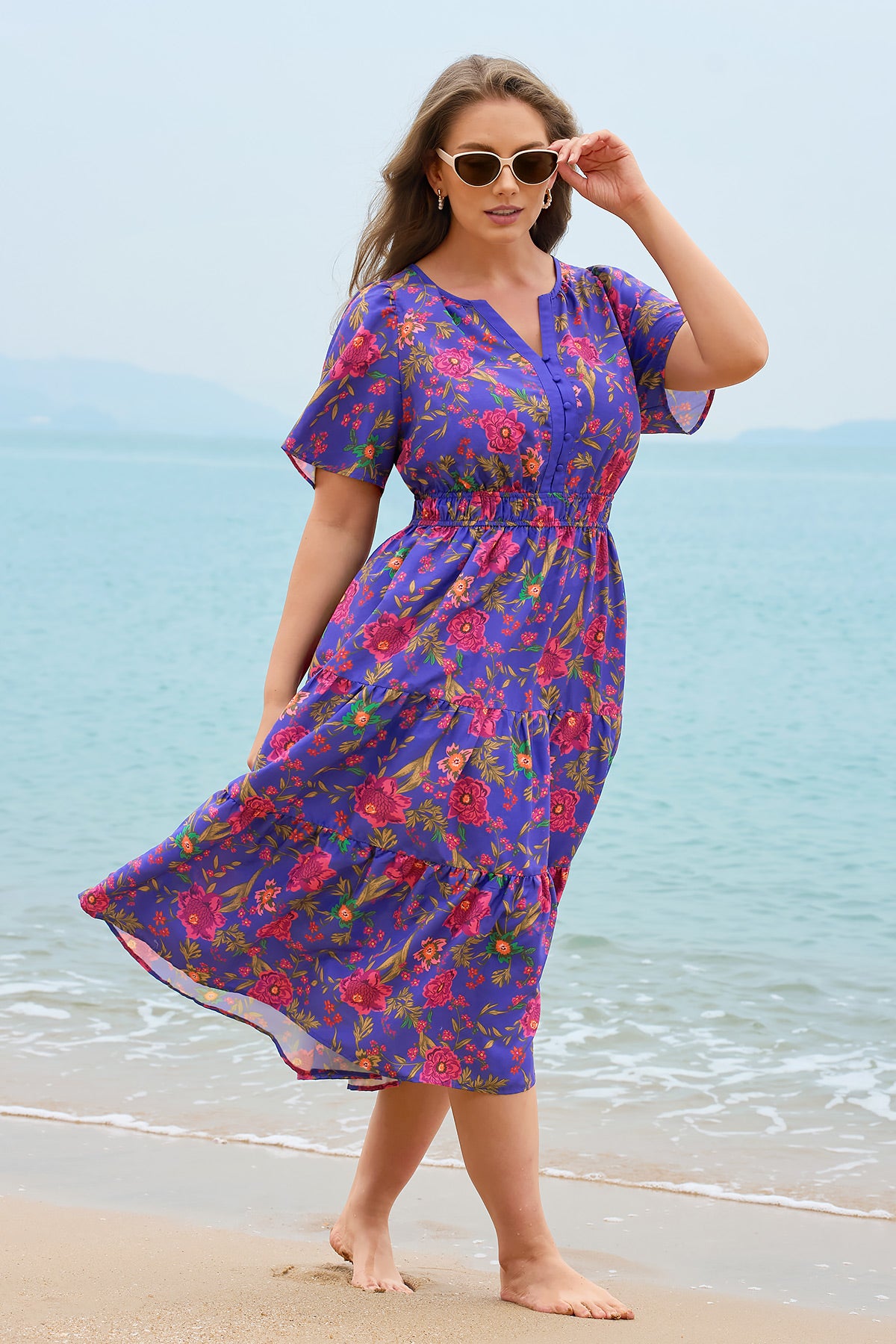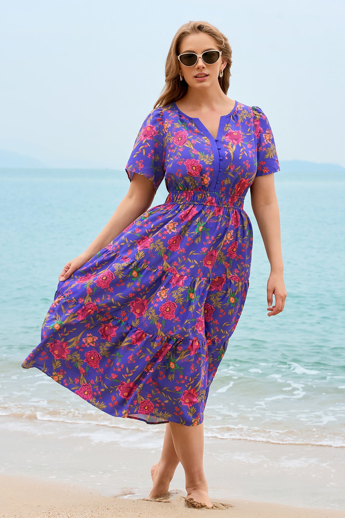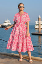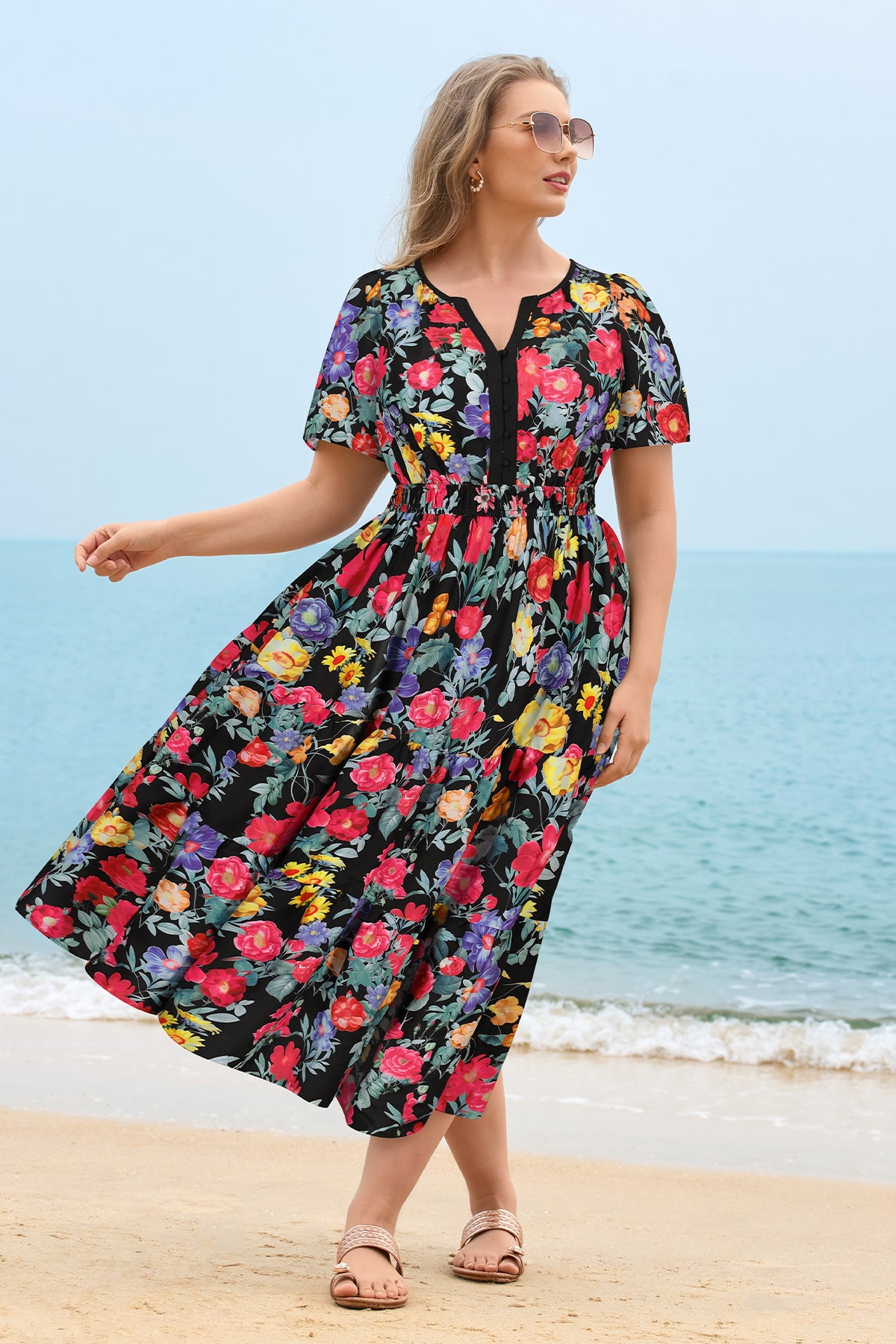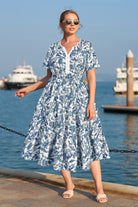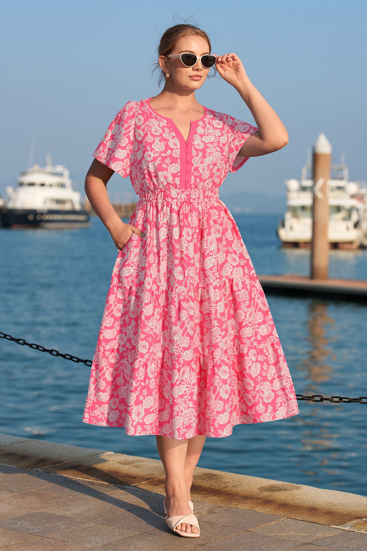 This airy olive green midi dress features delicate leaf prints paired with a contrast-button V-neck (a standout detail that adds subtle visual interest). Its smocked waist cinches gently for a flattering fit, while short sleeves and a tiered skirt bring soft movement—balancing casual charm and effortless style.