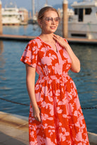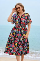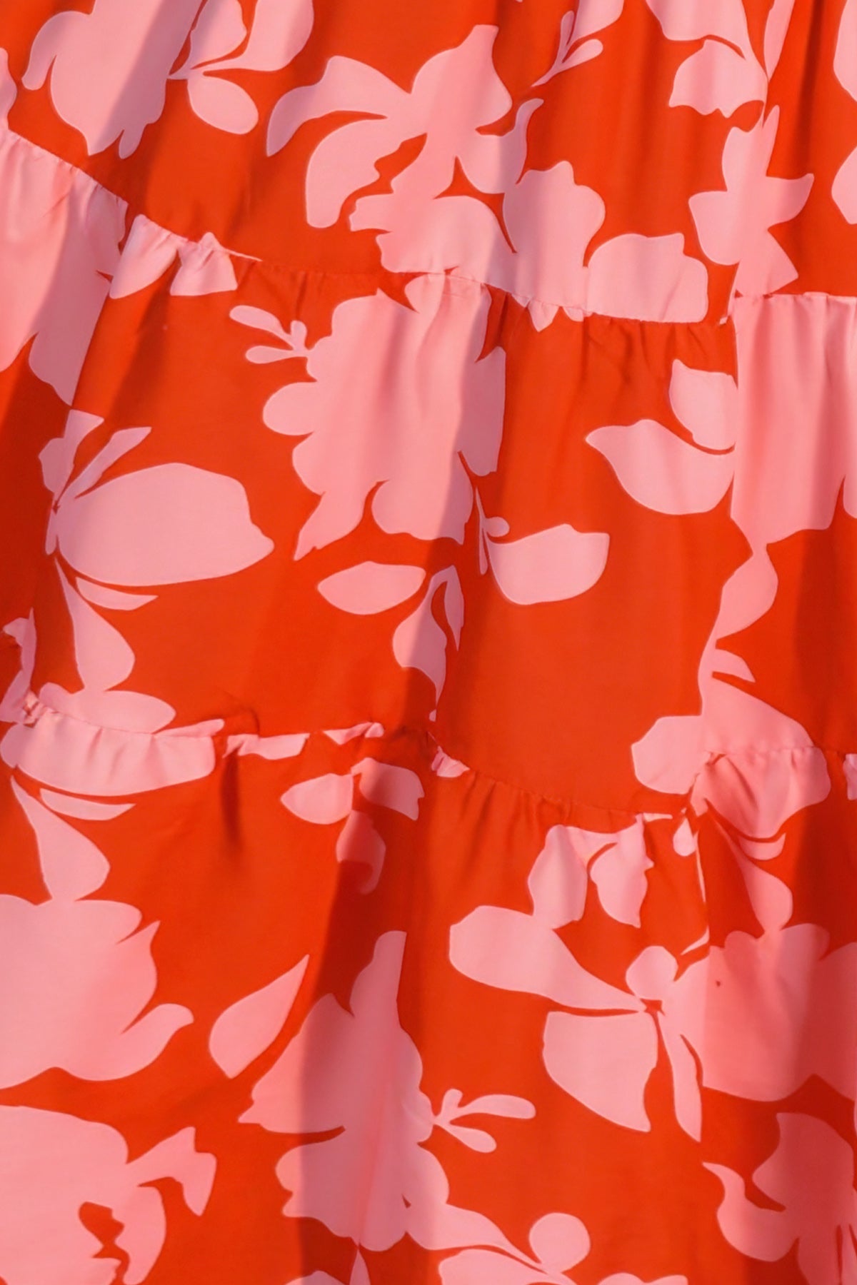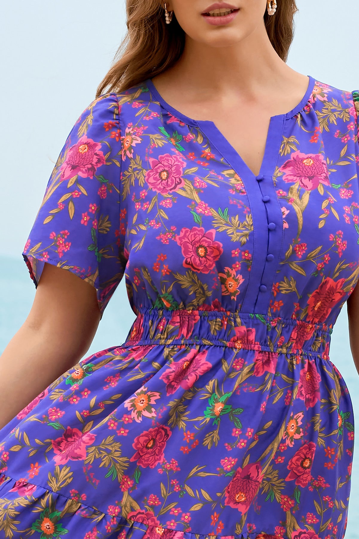 - Details: Contrast-button V-neckline, Smocked waist, Short sleeves, Tiered skirt, Contrast trim