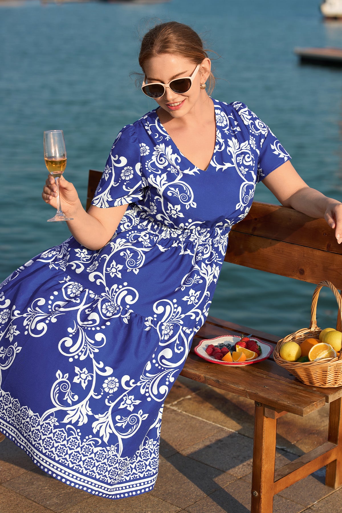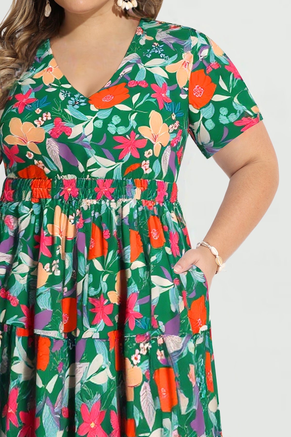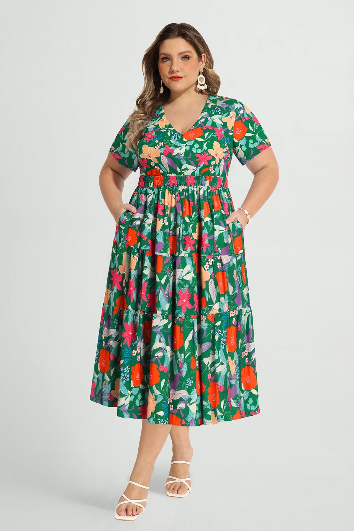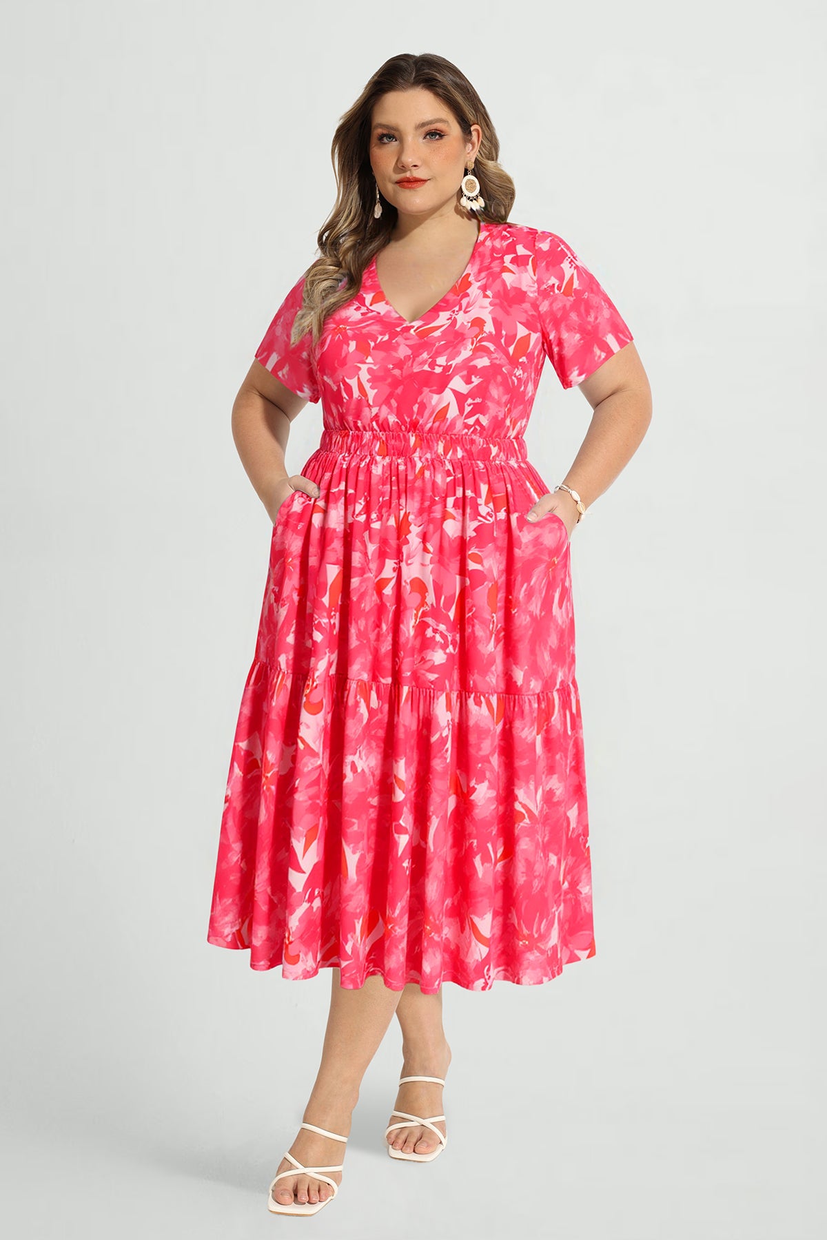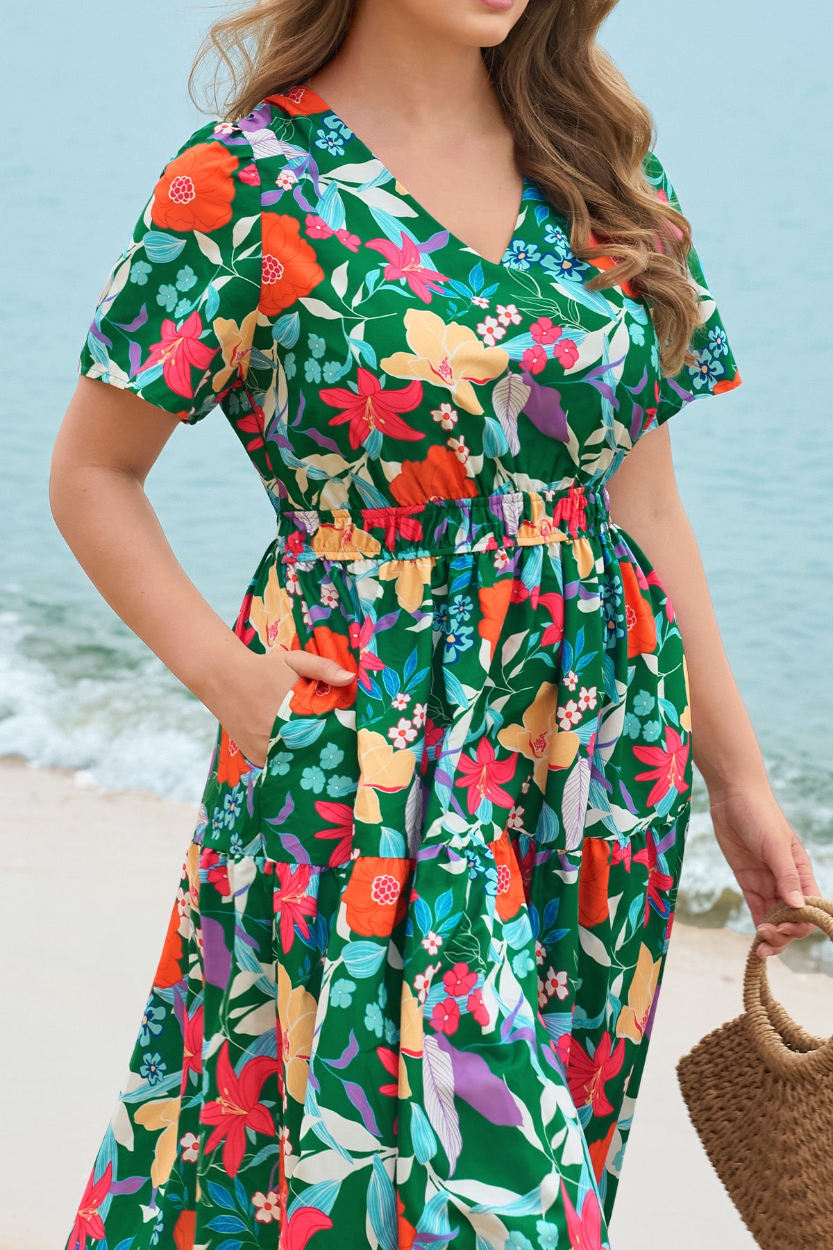 Upgrade your spring/summer wardrobe with this plus-size midi dress! Breathable and comfy for warm days, it features a delicate floral print, flattering A-line fit, elasticated waist, and handy side pockets—this V-neck piece balances style and practicality perfectly. Great for brunch, errands, or casual outings—ideal for plus-size women who want comfort without sacrificing elegance.