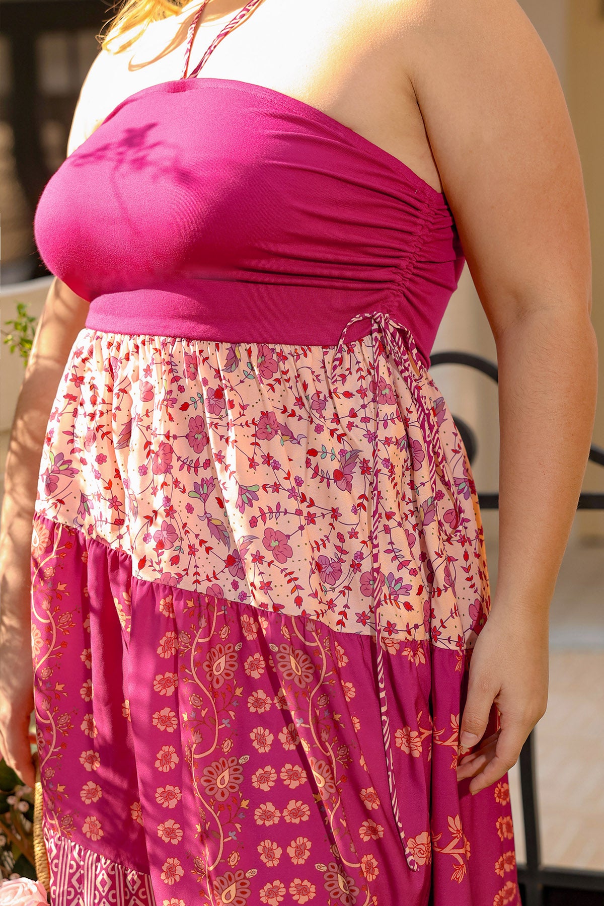 The Plus-size boho maxi dress, a perfect blend of boho chic and comfortable elegance designed for plus-size women. This strapless maxi dress features a vibrant boho print that exudes free-spirited charm, while the adjustable drawstring waist ensures a flattering fit for all body types. The functional side pockets add a practical touch, making it ideal for beach vacations, festivals, or casual outings.