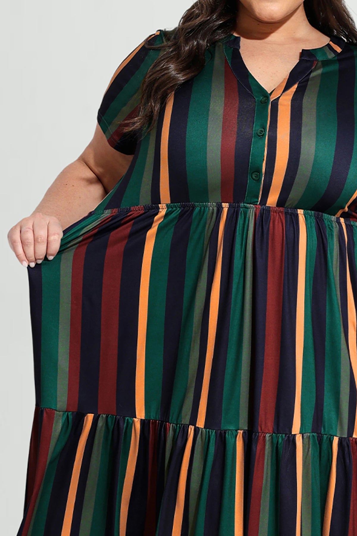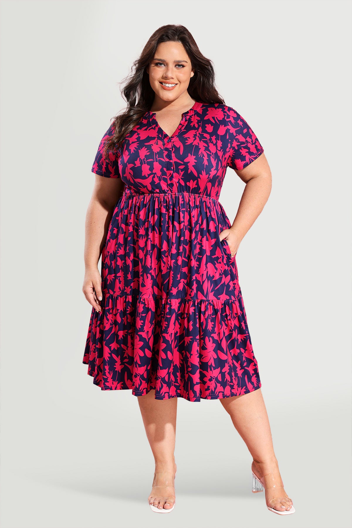 The plus-size floral dress designed specifically for plus-size women. This elegant dress features a flattering A-line silhouette that enhances your curves, while the button-up front adds a touch of sophistication. The floral pattern is both trendy and timeless, making it a versatile addition to any wardrobe. With practical pockets, it's as functional as it is fashionable. Ideal for casual outings or dressier occasions, this midi dress is a must-have for any season.