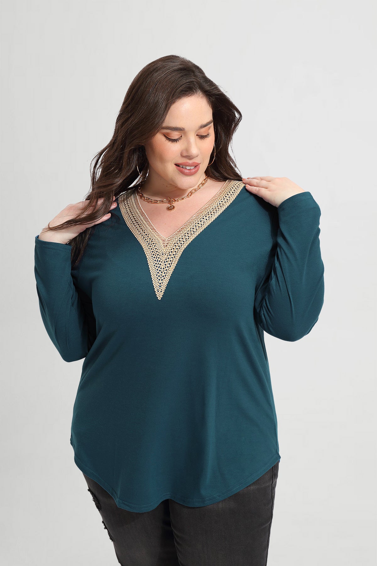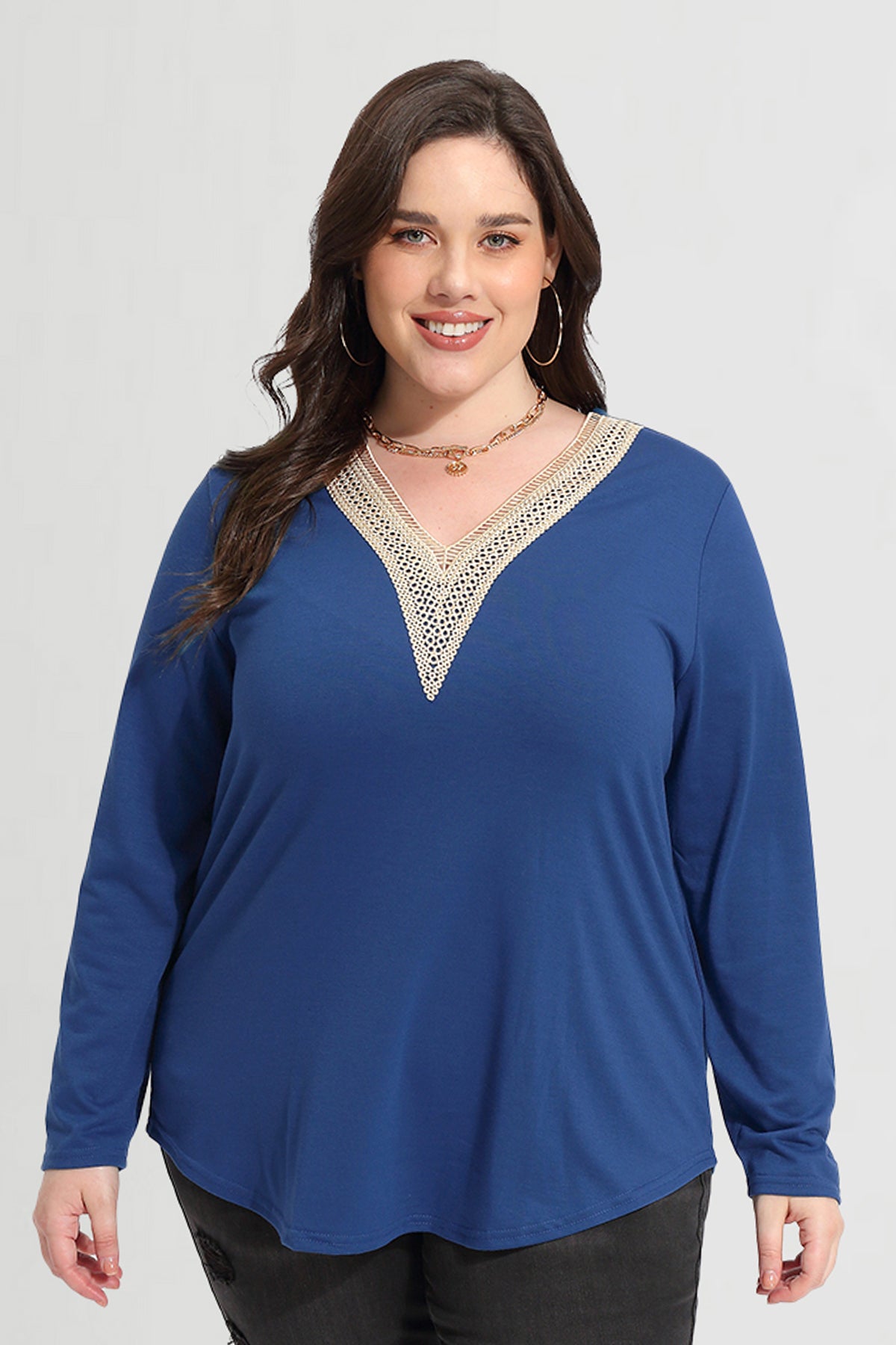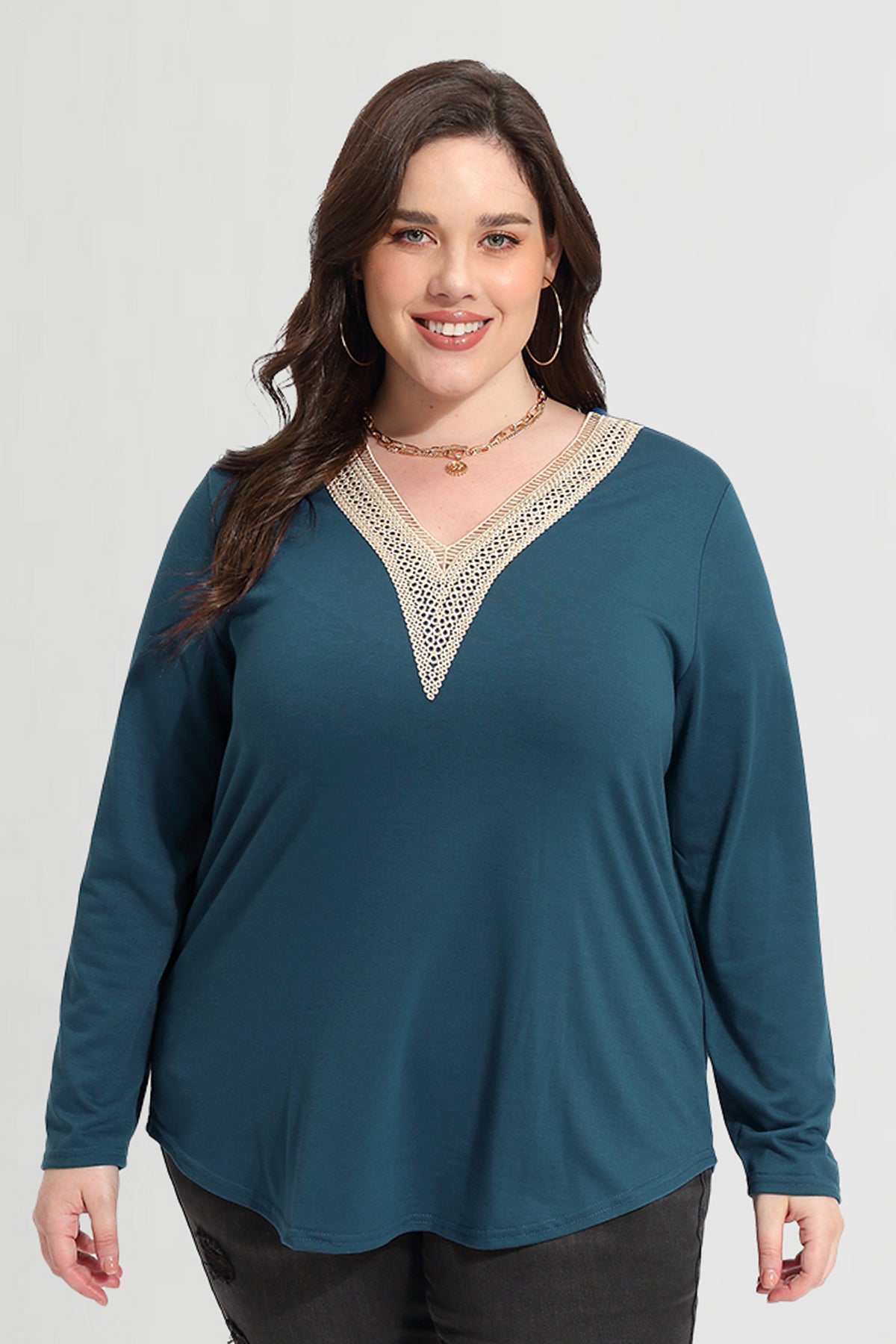 Solid Sexy Lace V-neck Long Sleeve T-Shirt
