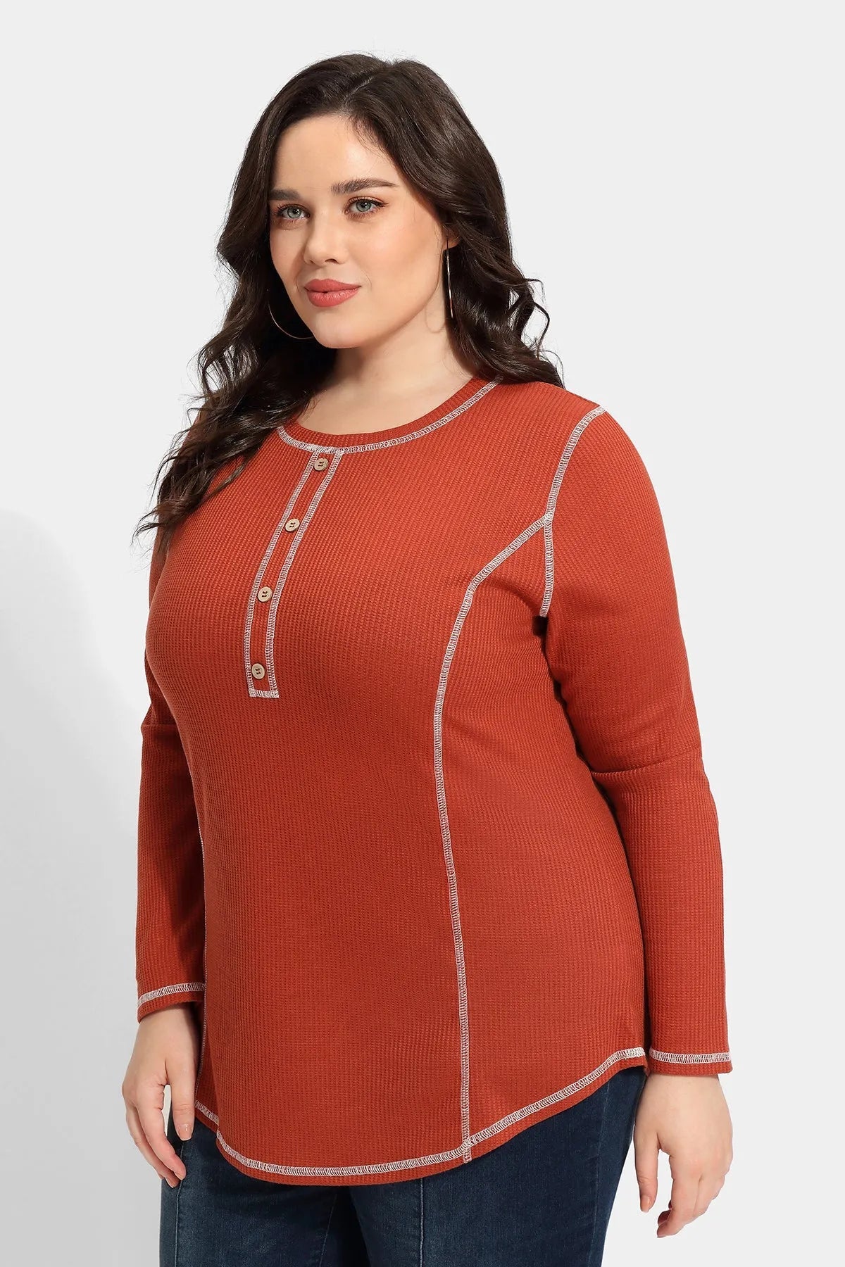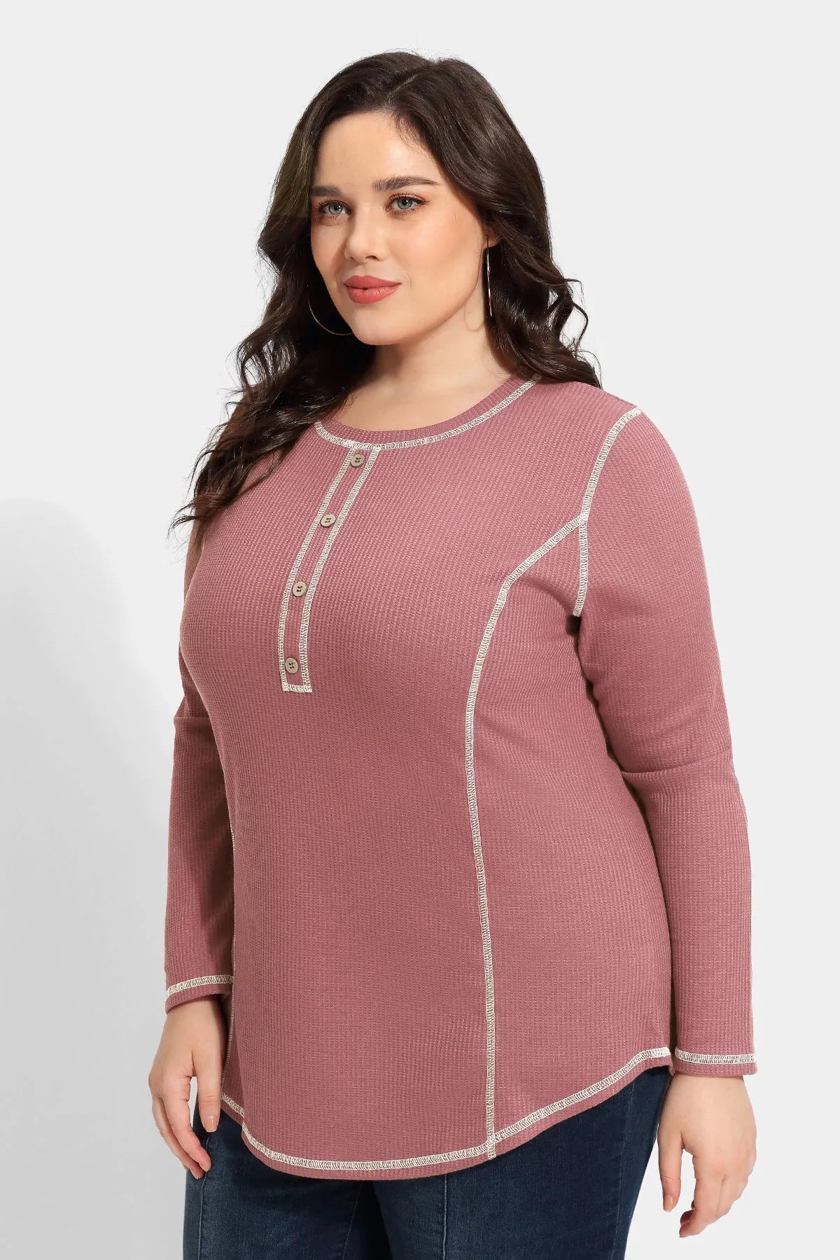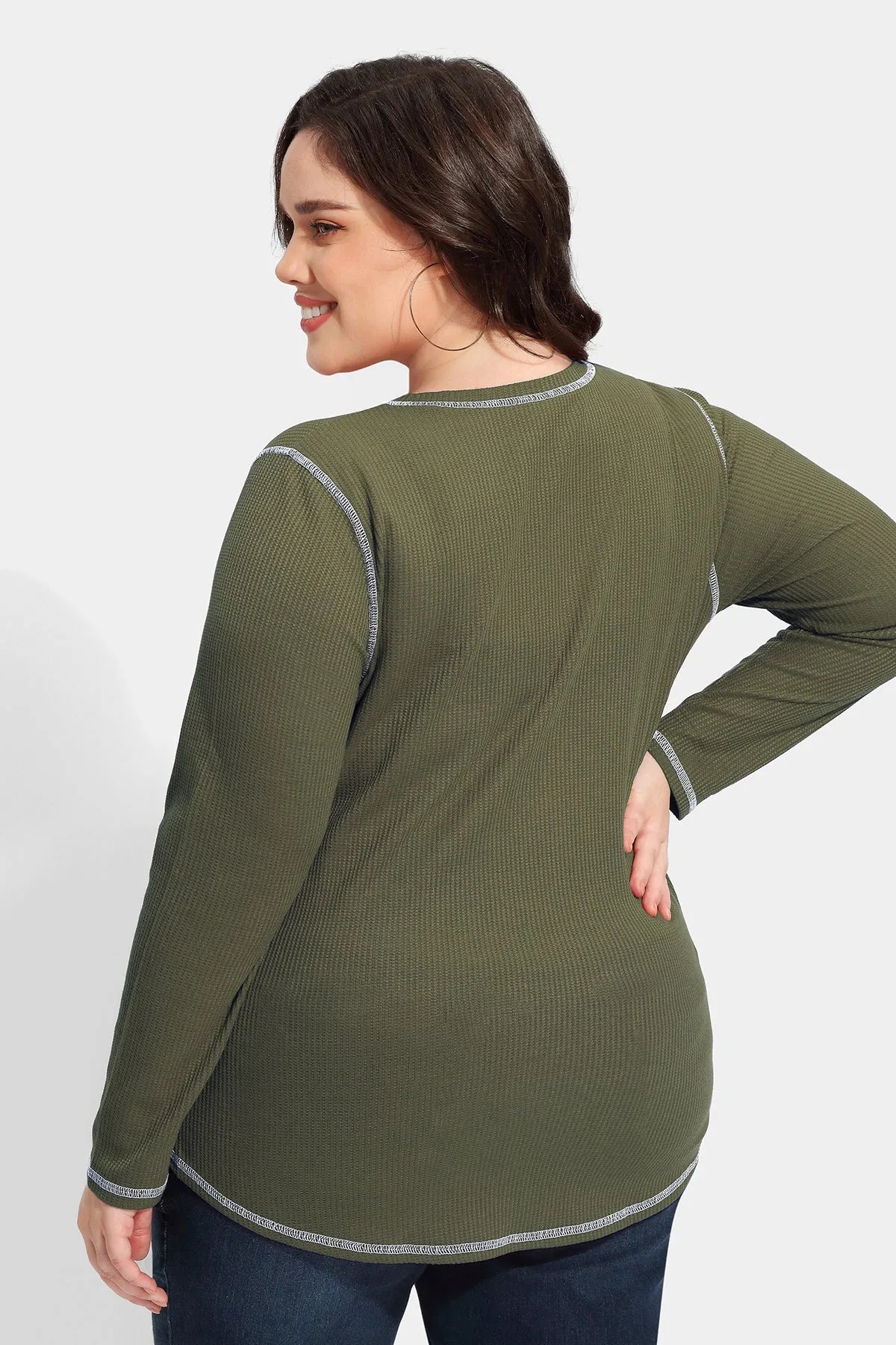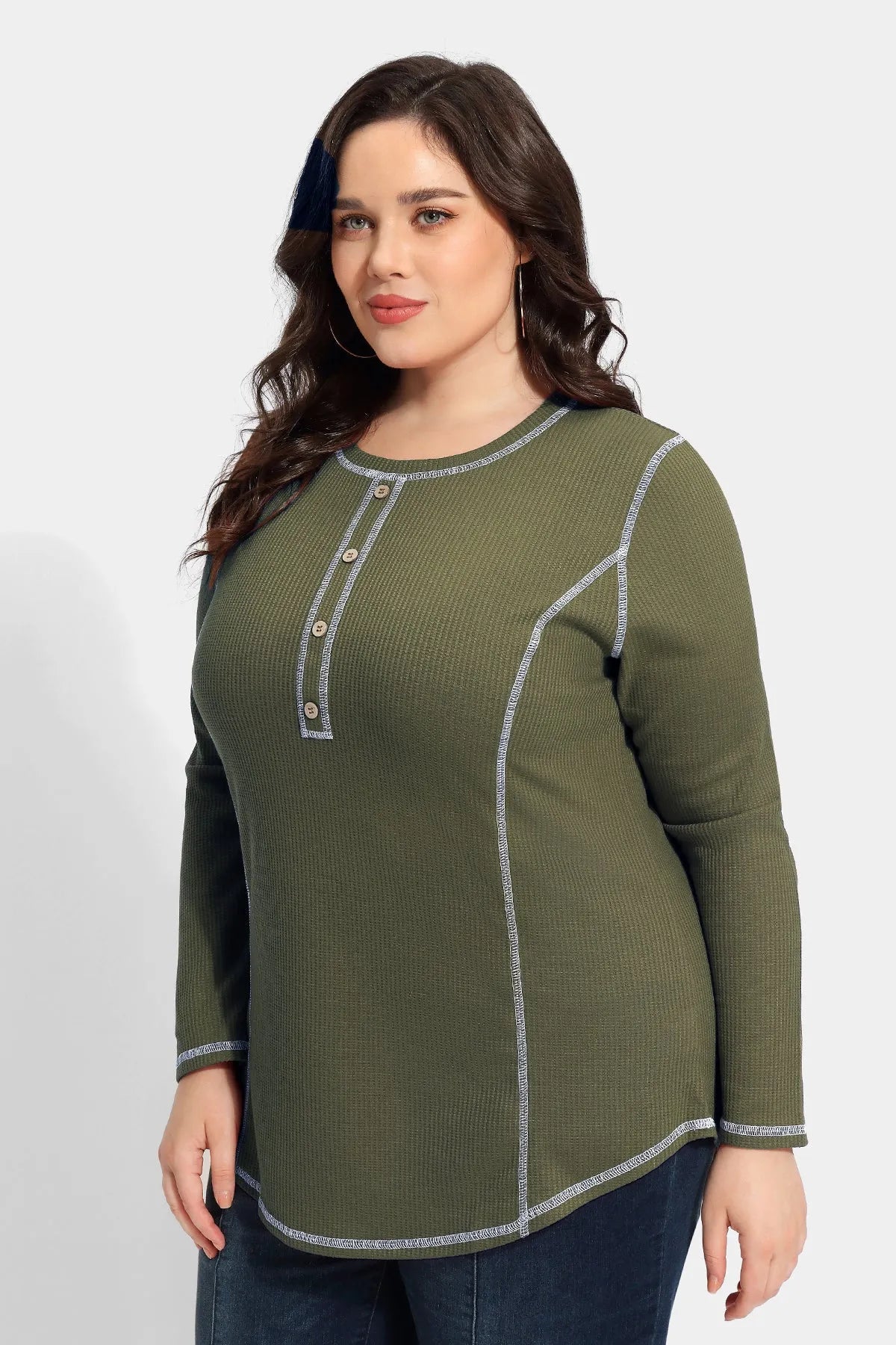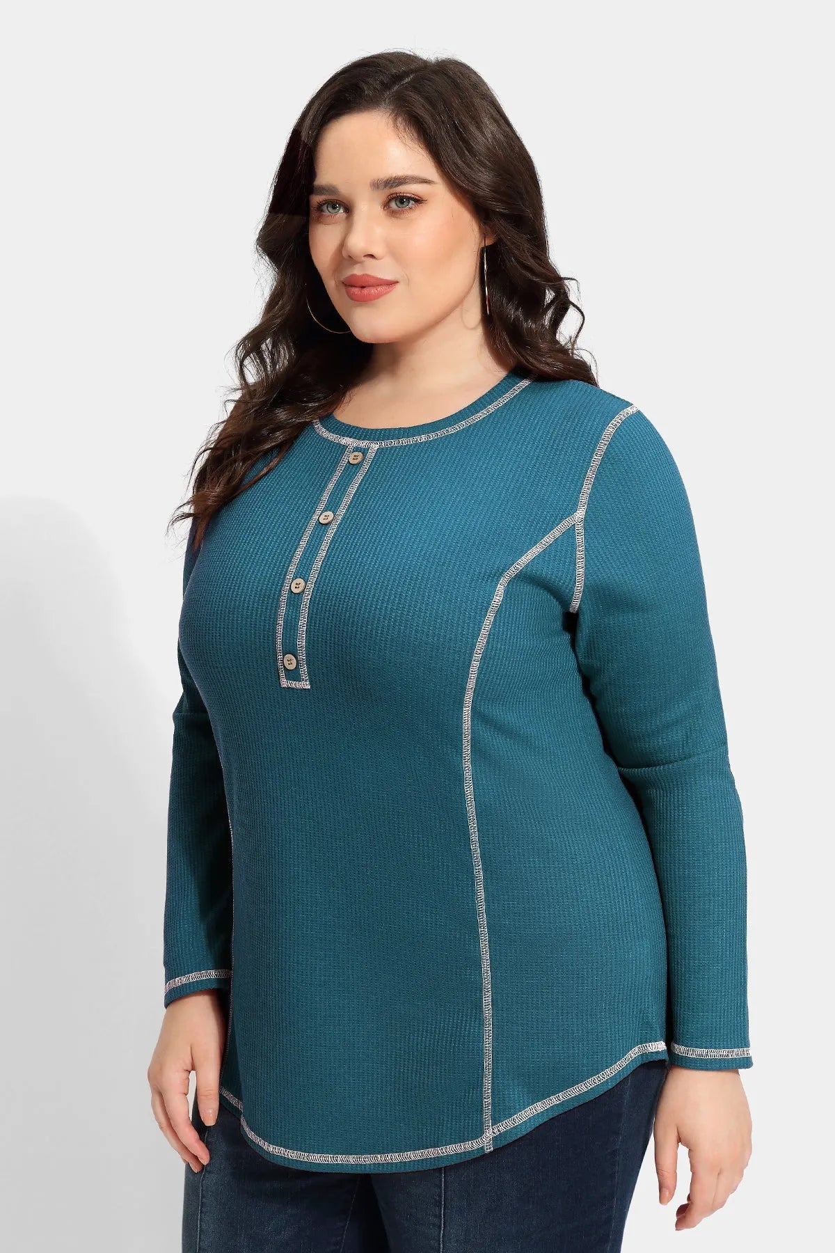 Solid Button Up Detail Crewneck Waffle T-Shirt