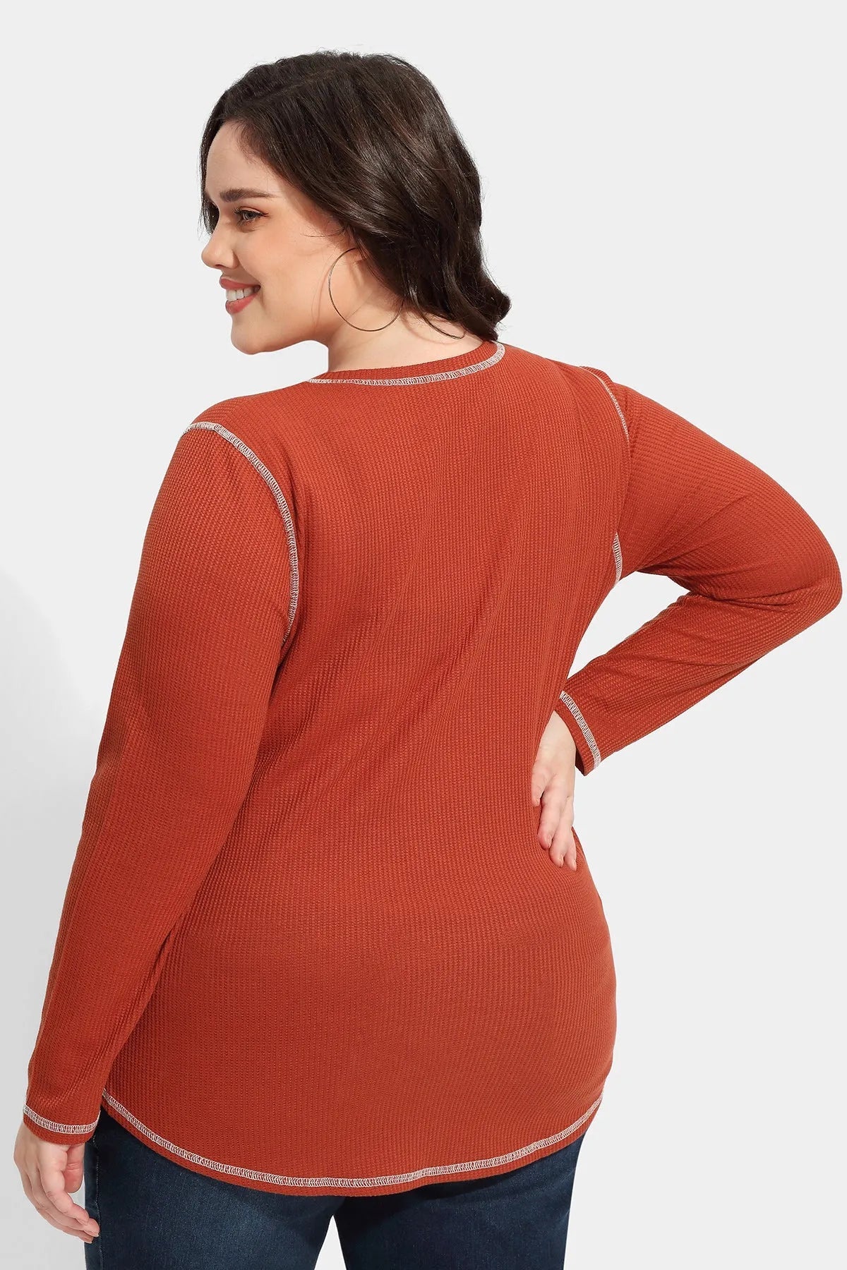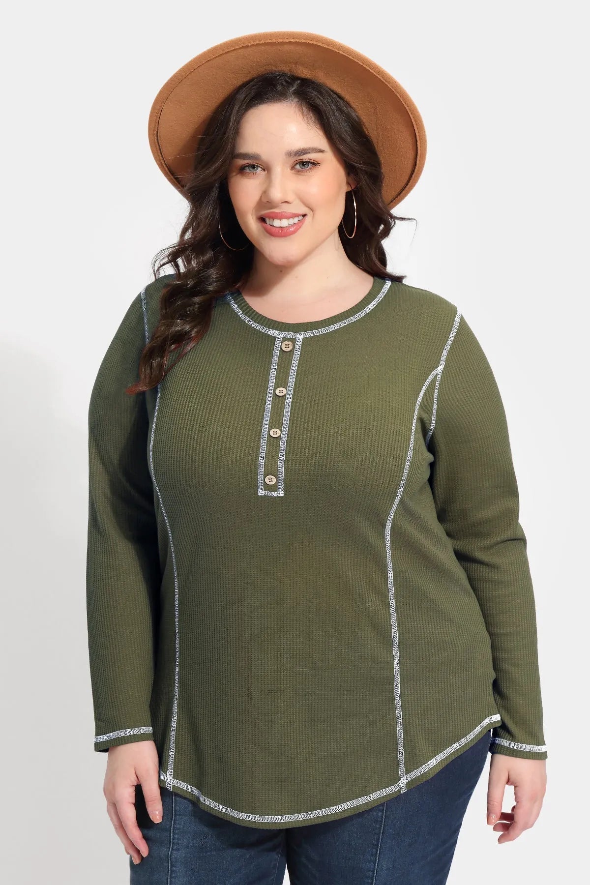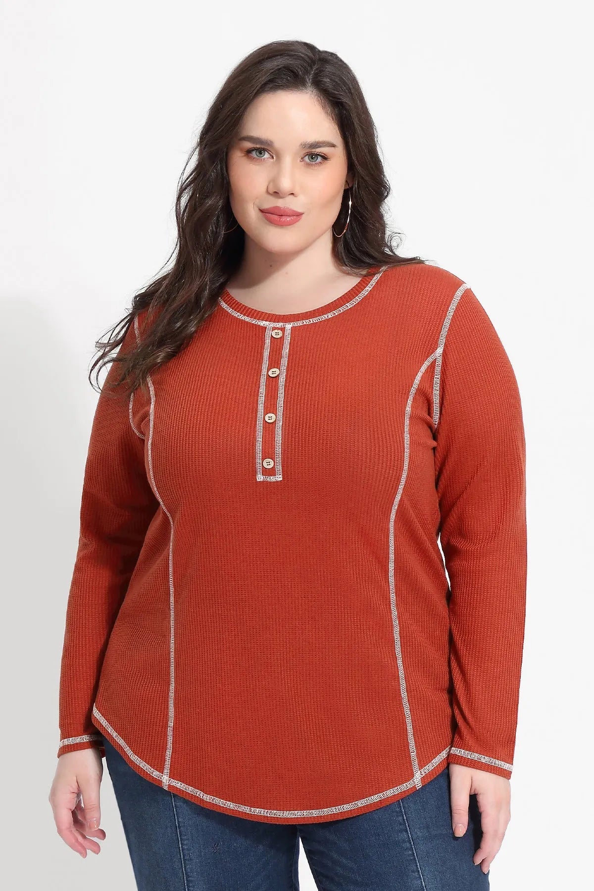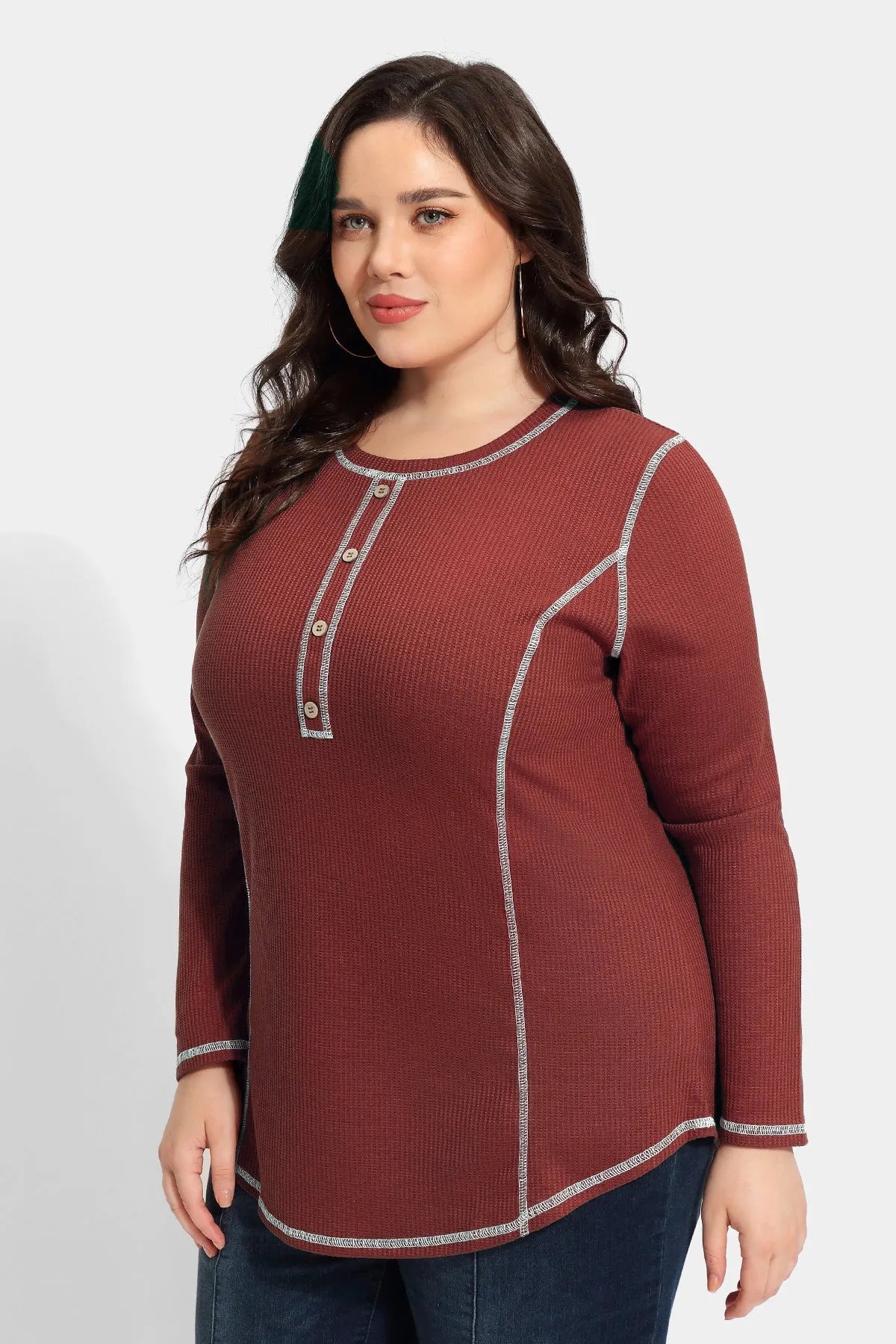 Solid Button Up Detail Crewneck Waffle T-Shirt