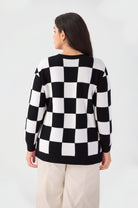 Step up your style game with our Checkerboard V-Neck Sweater. This trendy knit top features a bold black and white checkerboard pattern that adds a modern, edgy twist to a classic silhouette. Made from a soft and comfortable knit fabric, it's perfect for staying cozy while making a fashion statement. The classic V-neckline and relaxed fit make it easy to wear and pair with a variety of bottoms.
