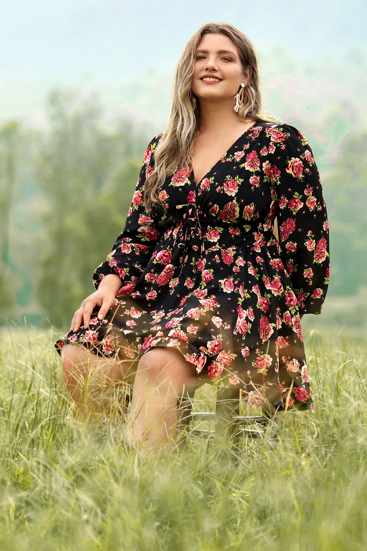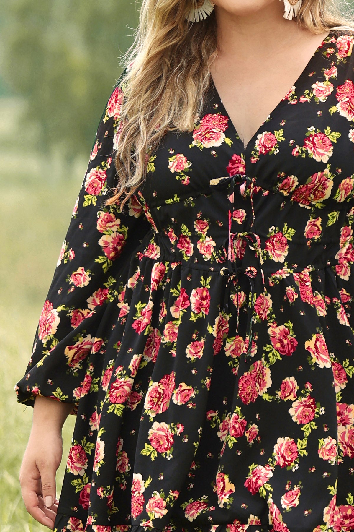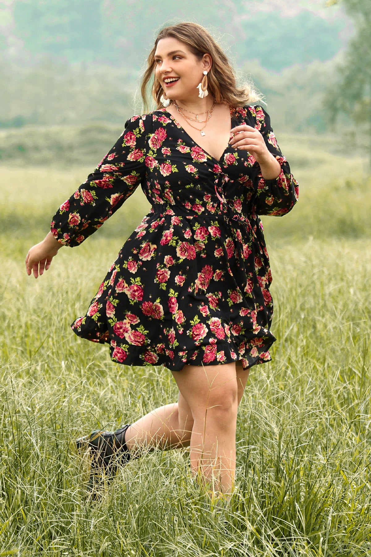 Rose Floral Print Lantern Sleeve V Neck Mini Dress