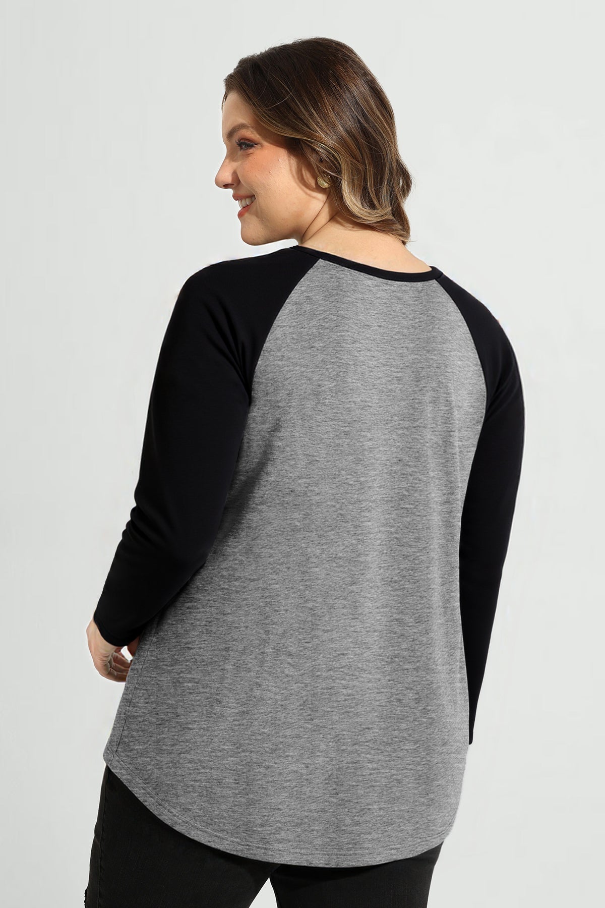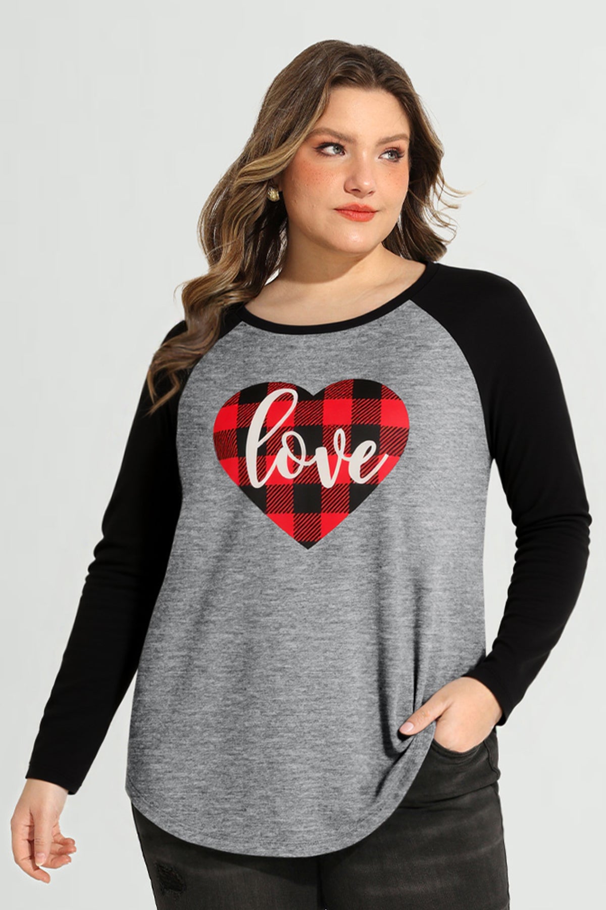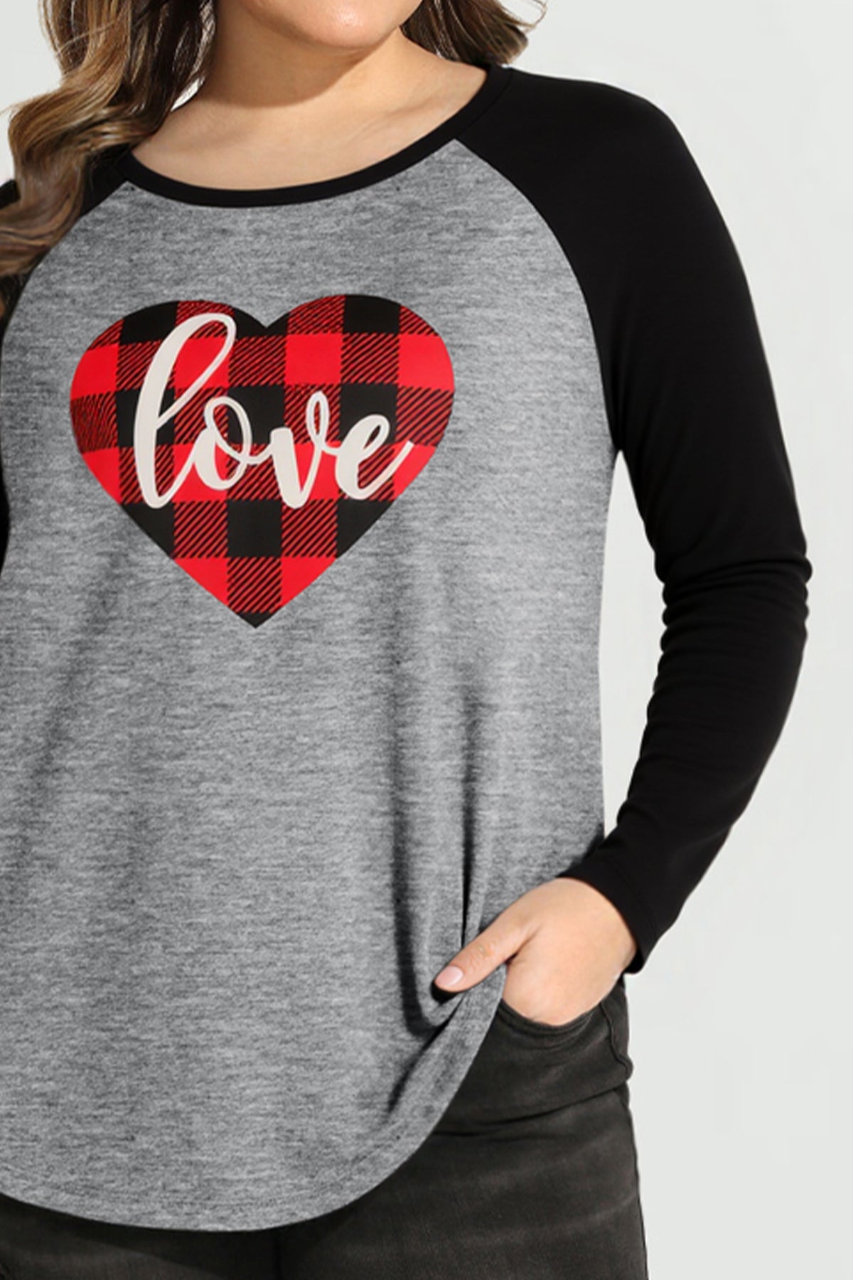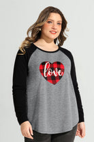 Contrast Gather Plaid Love Heart Print Raglan Long Sleeve Top