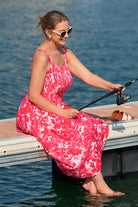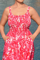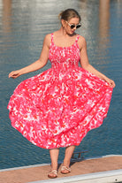 This vibrant midi dress features bold coral red floral prints that feel bright and lively. Its smocked bodice offers a flexible, flattering fit, while slim spaghetti straps add a delicate touch—paired with a flowy full skirt that swishes beautifully with every move, balancing playful charm and effortless elegance.