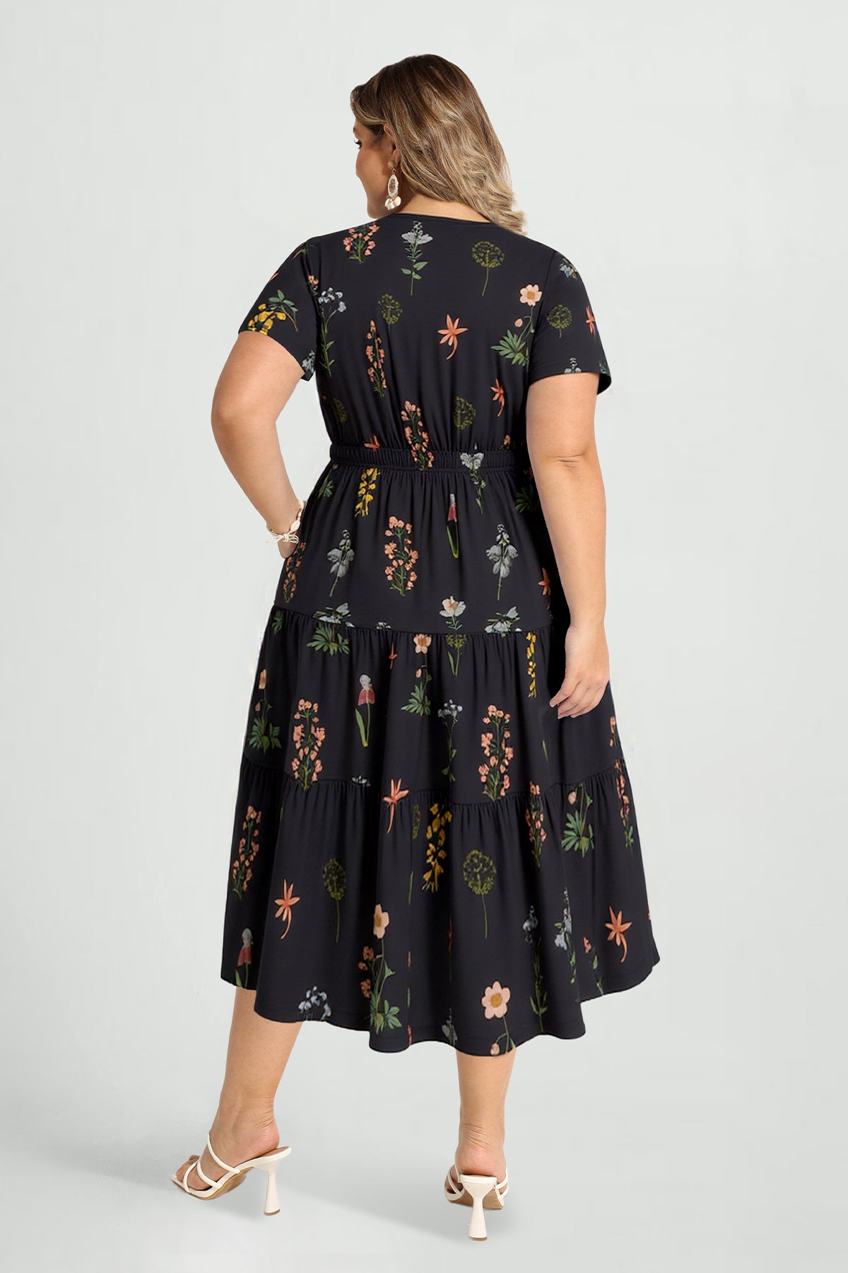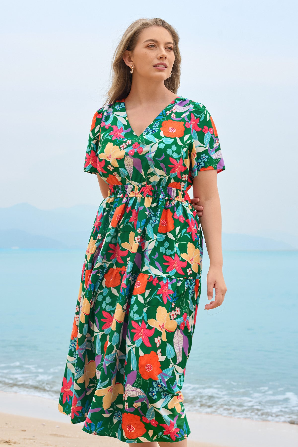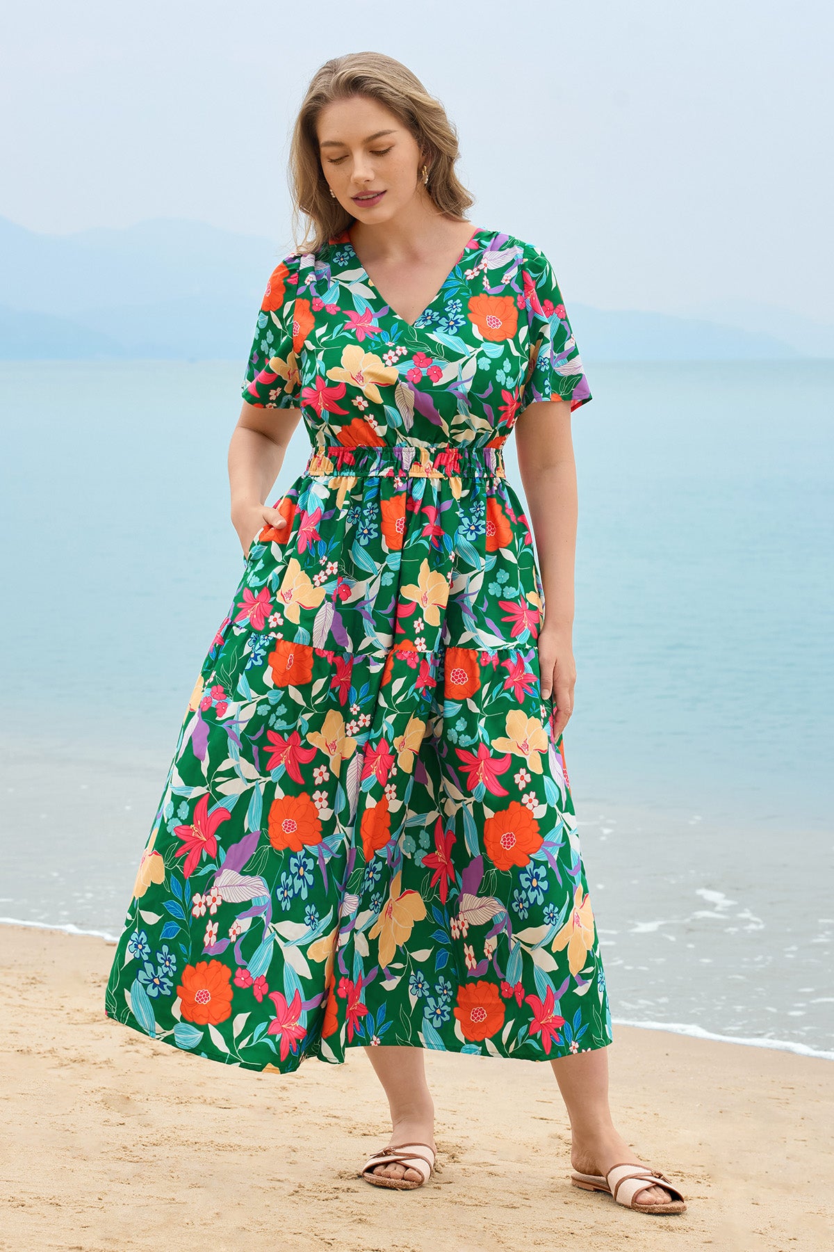 Upgrade your spring/summer wardrobe with this plus-size midi dress! Breathable and comfy for warm days, it features a delicate floral print, flattering A-line fit, elasticated waist, and handy side pockets—this V-neck piece balances style and practicality perfectly. Great for brunch, errands, or casual outings—ideal for plus-size women who want comfort without sacrificing elegance.