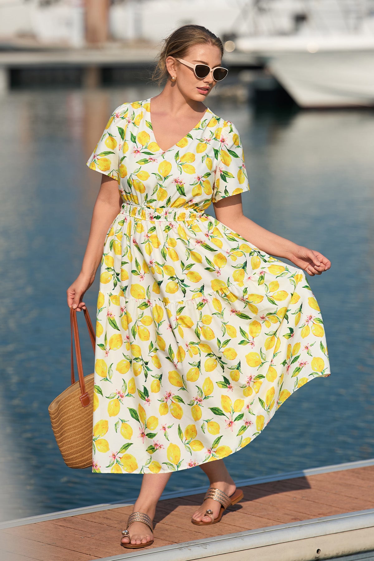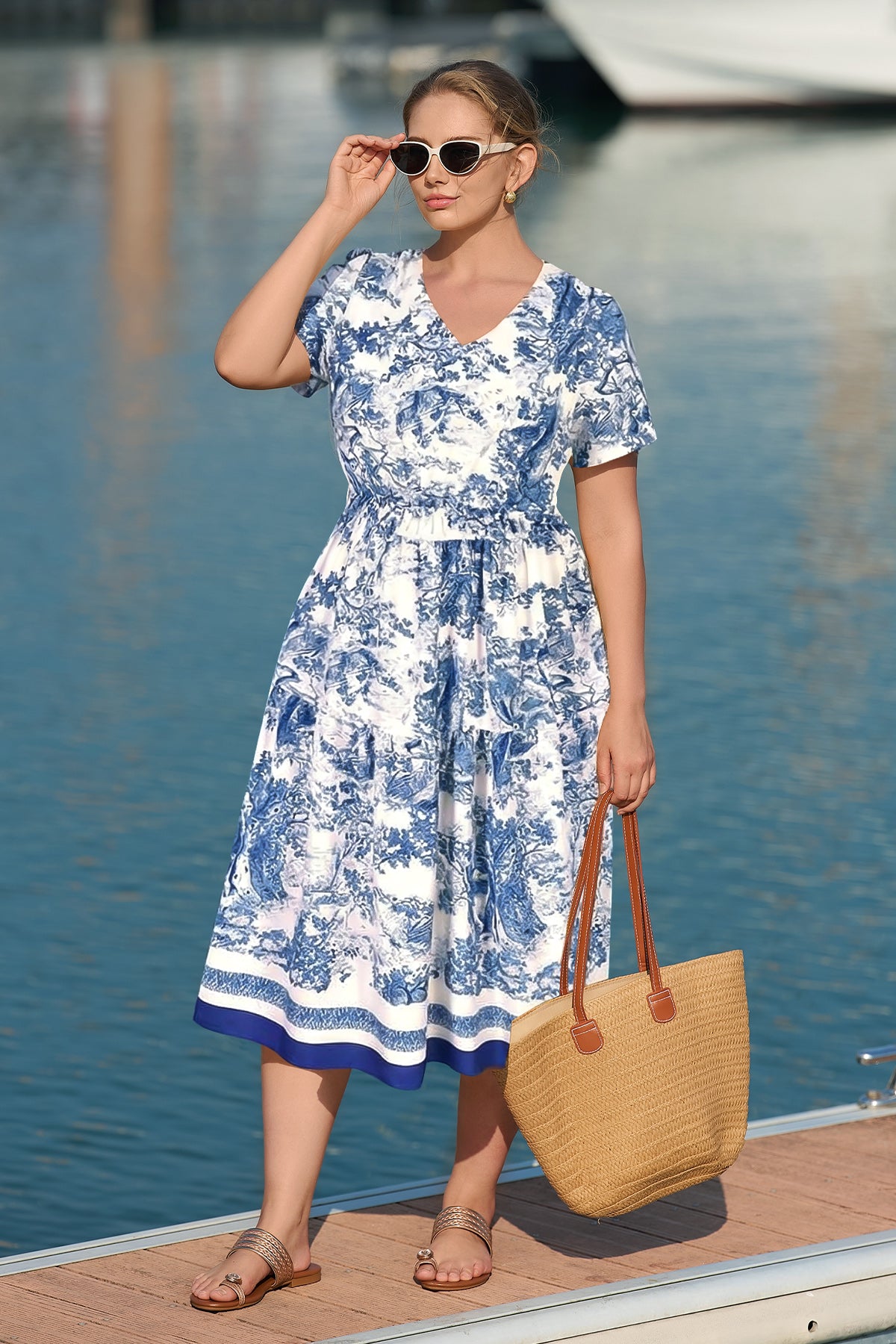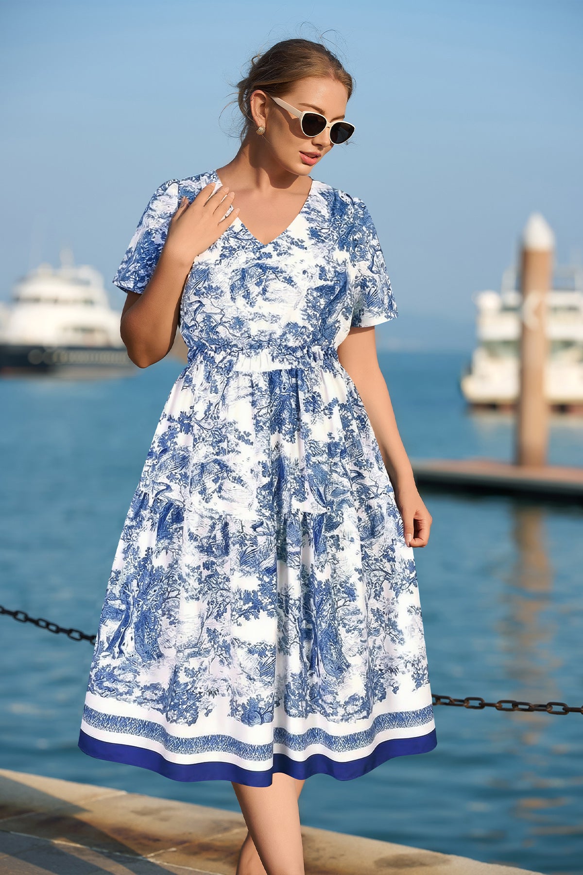 Upgrade your spring/summer wardrobe with this plus-size midi dress! Breathable and comfy for warm days, it features a delicate floral print, flattering A-line fit, elasticated waist, and handy side pockets—this V-neck piece balances style and practicality perfectly. Great for brunch, errands, or casual outings—ideal for plus-size women who want comfort without sacrificing elegance.