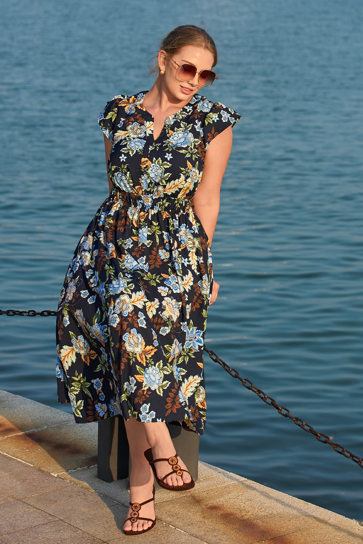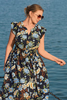 This eye-catching midi dress features rich blue & white floral prints that feel timeless and elegant. Its tie-neck square neck adds a delicate, adjustable touch, while the elasticated waist cinches to flatter your shape—paired with short flutter sleeves and a flowy skirt that moves beautifully, balancing classic charm and effortless ease.