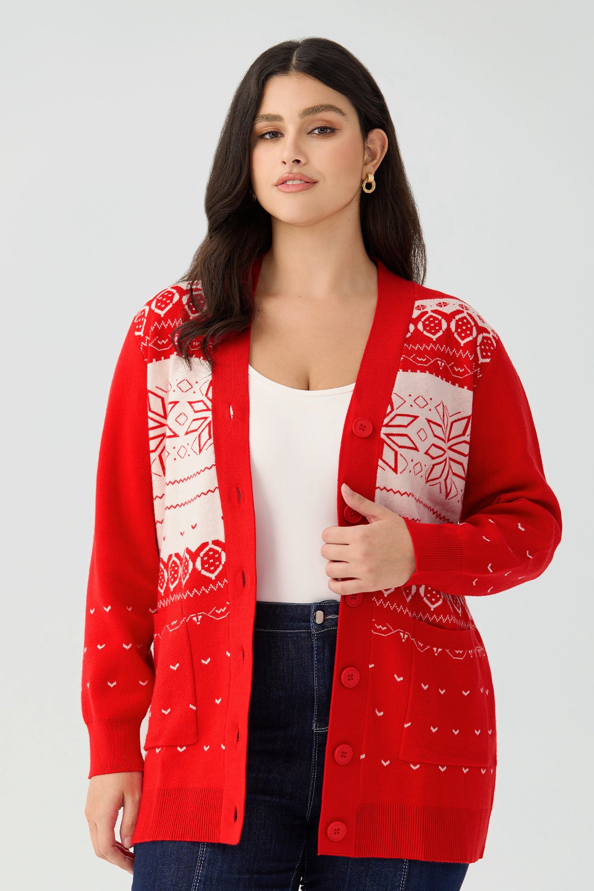 Bring cozy holiday vibes to your winter wardrobe with this red Christmas cardigan sweater. Designed with a classic Fair Isle snowflake pattern, this open-front knit cardigan adds festive charm while keeping you warm.