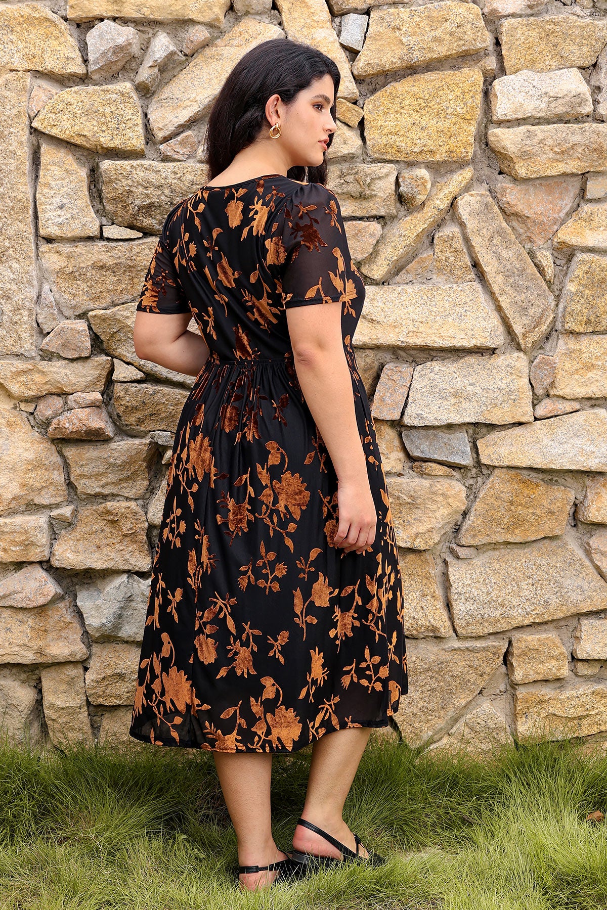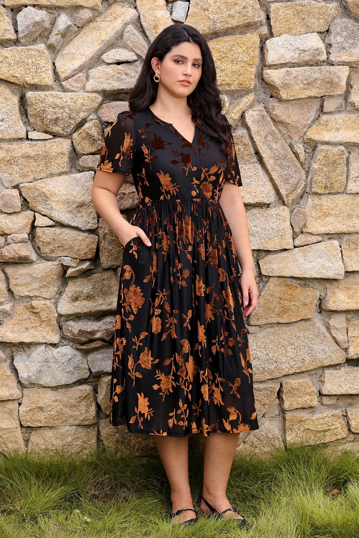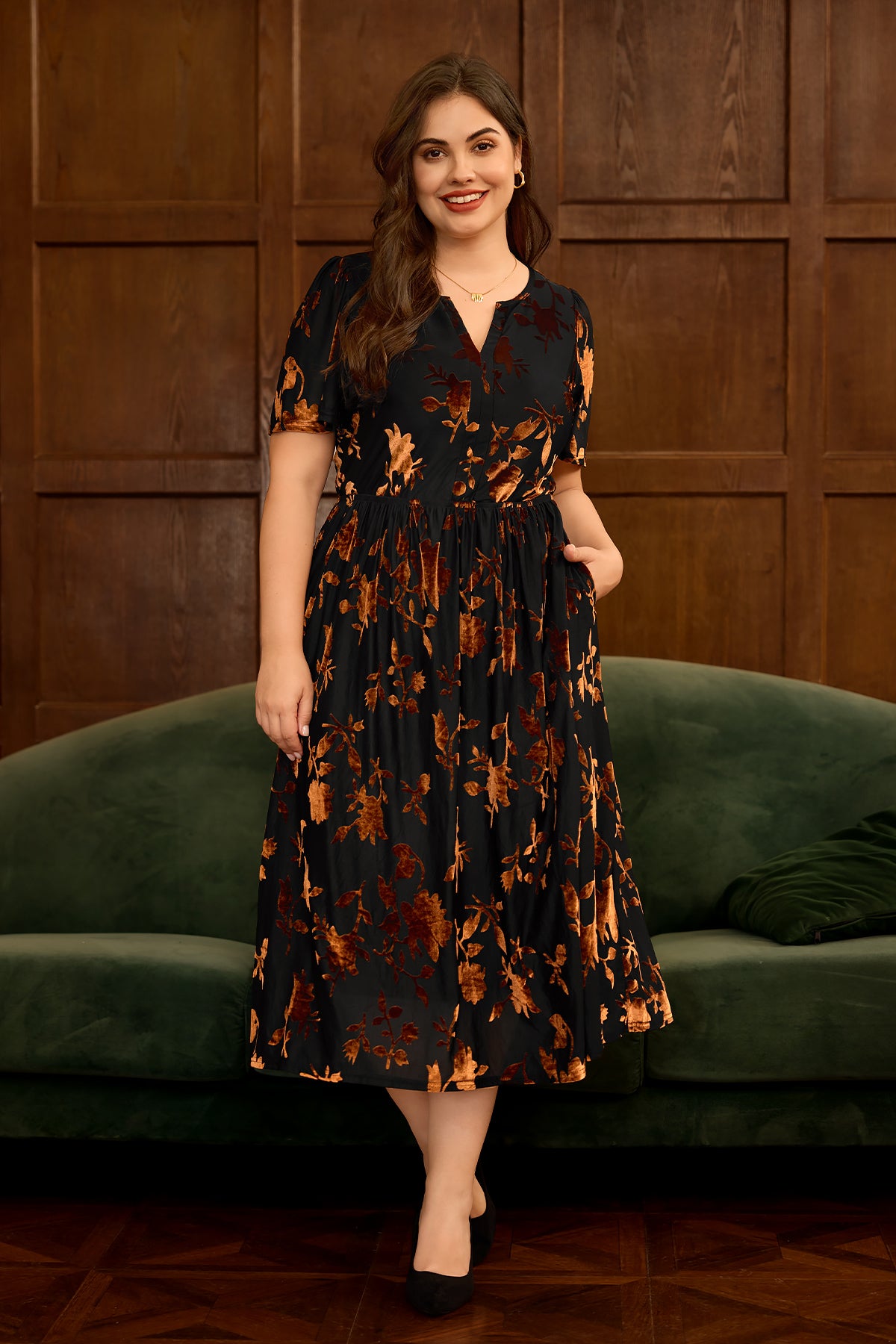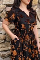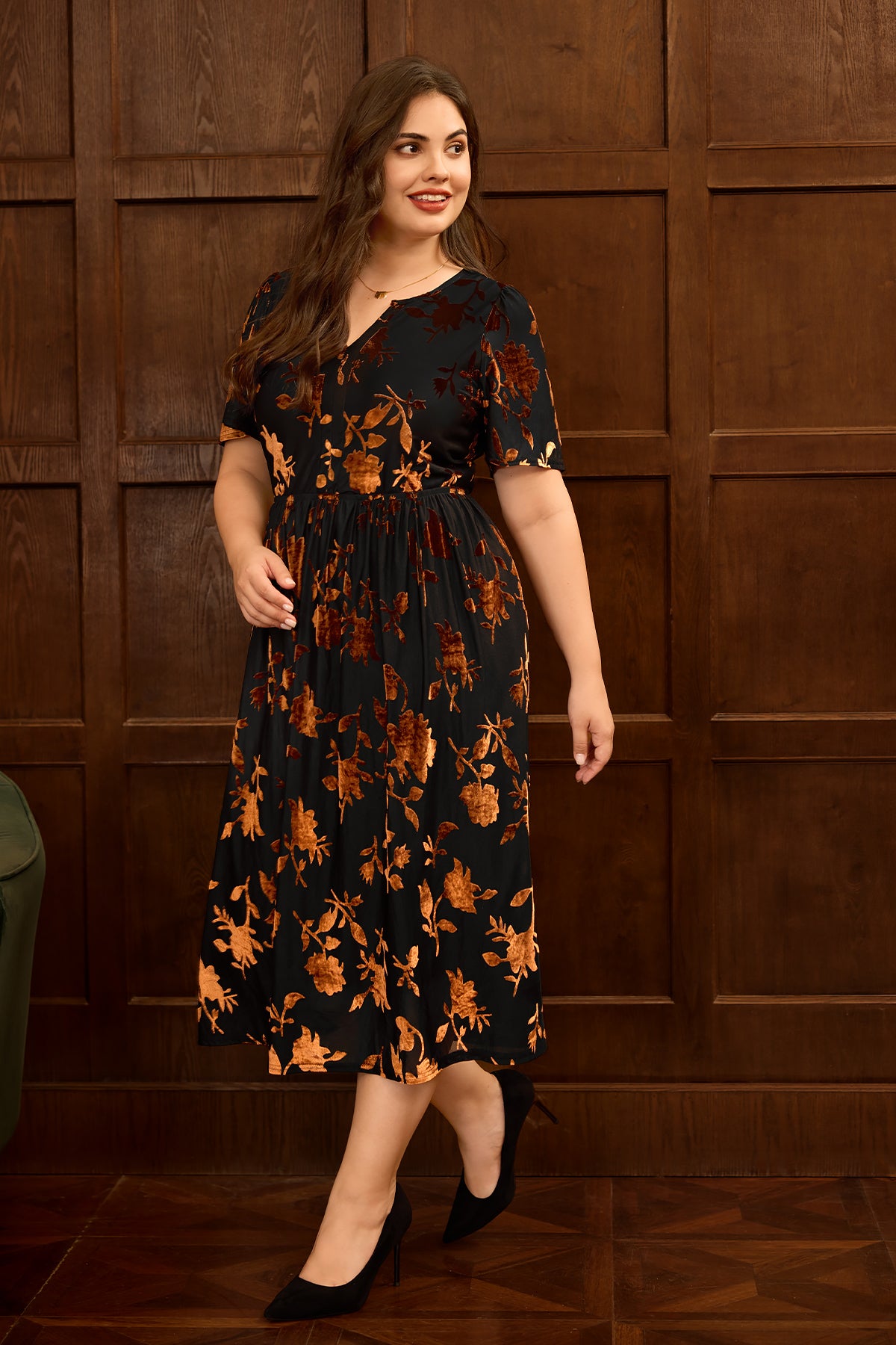 Elevate your casual wardrobe with this flattering plus-size midi dress featuring a stunning floral print in warm earth-toned browns (rust, olive, terracotta) on a rich black background—perfect for summer and beyond. Designed with functional side pockets (ideal for phones, cards, or keys), this dress blends style and practicality effortlessly.