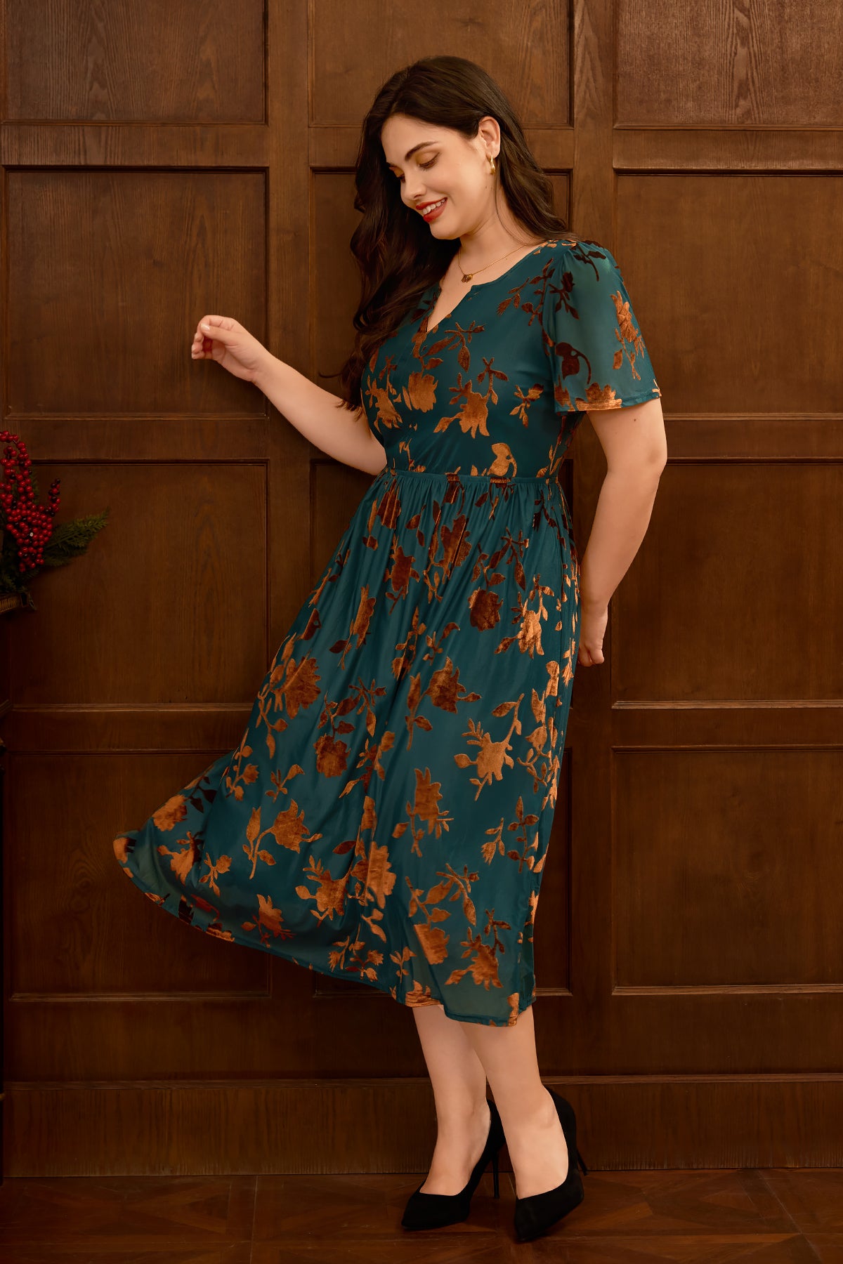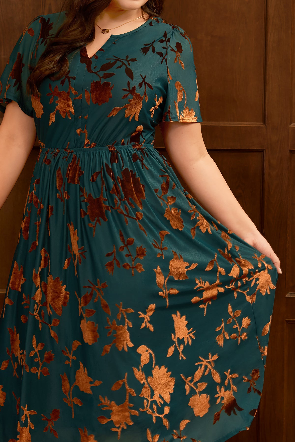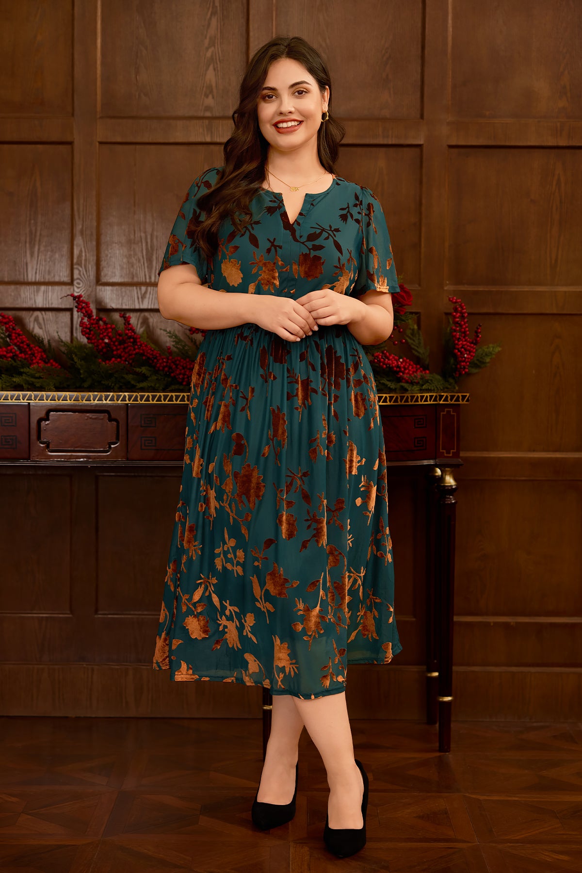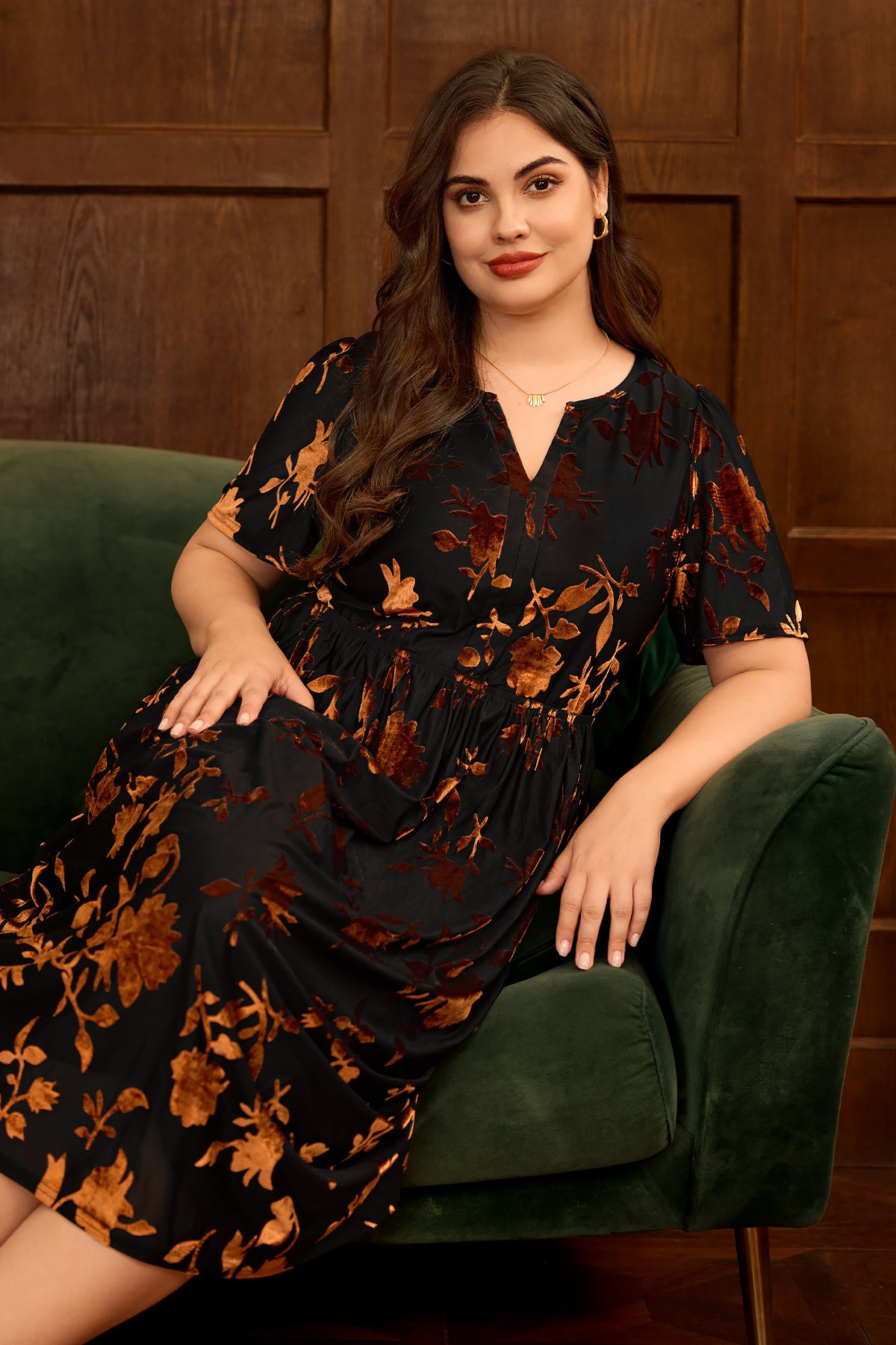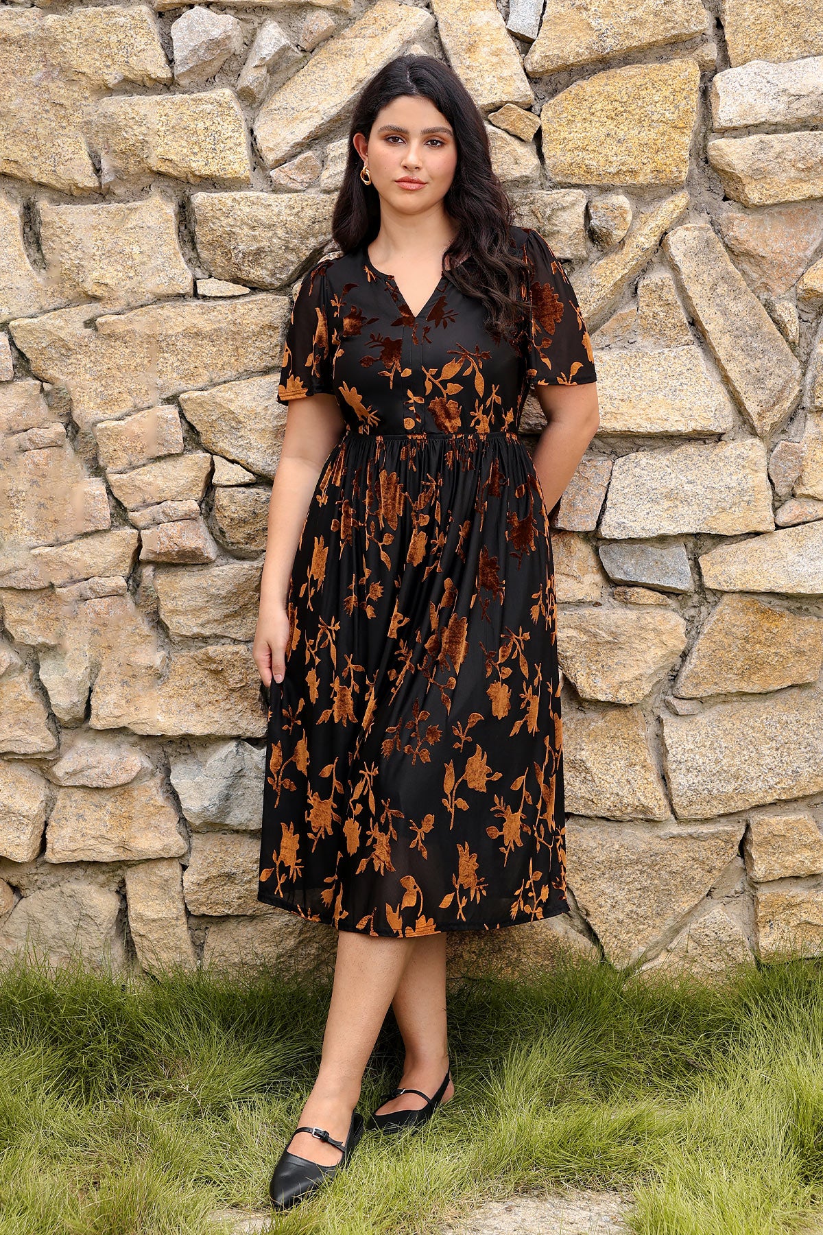 Elevate your casual wardrobe with this flattering plus-size midi dress featuring a stunning floral print in warm earth-toned browns (rust, olive, terracotta) on a rich black background—perfect for summer and beyond. Designed with functional side pockets (ideal for phones, cards, or keys), this dress blends style and practicality effortlessly.
