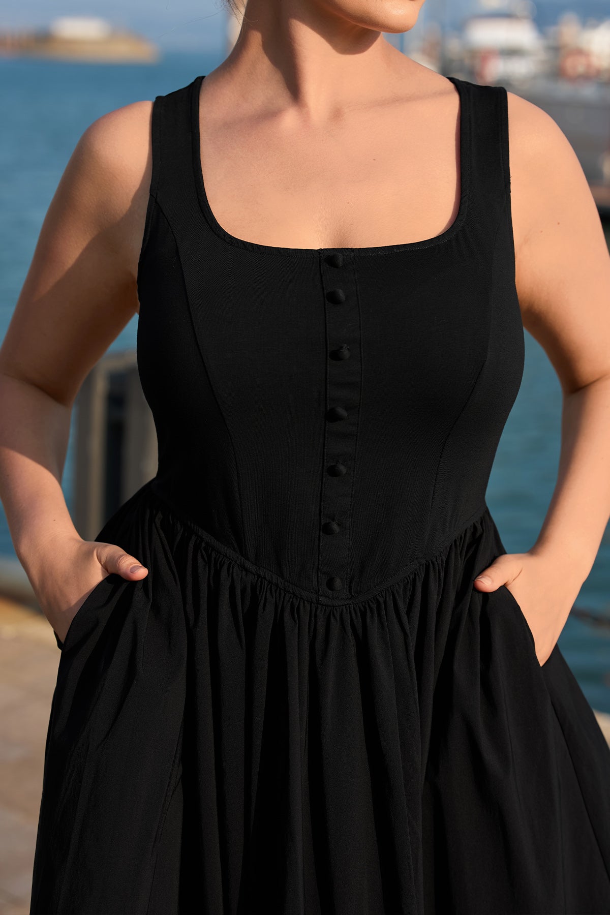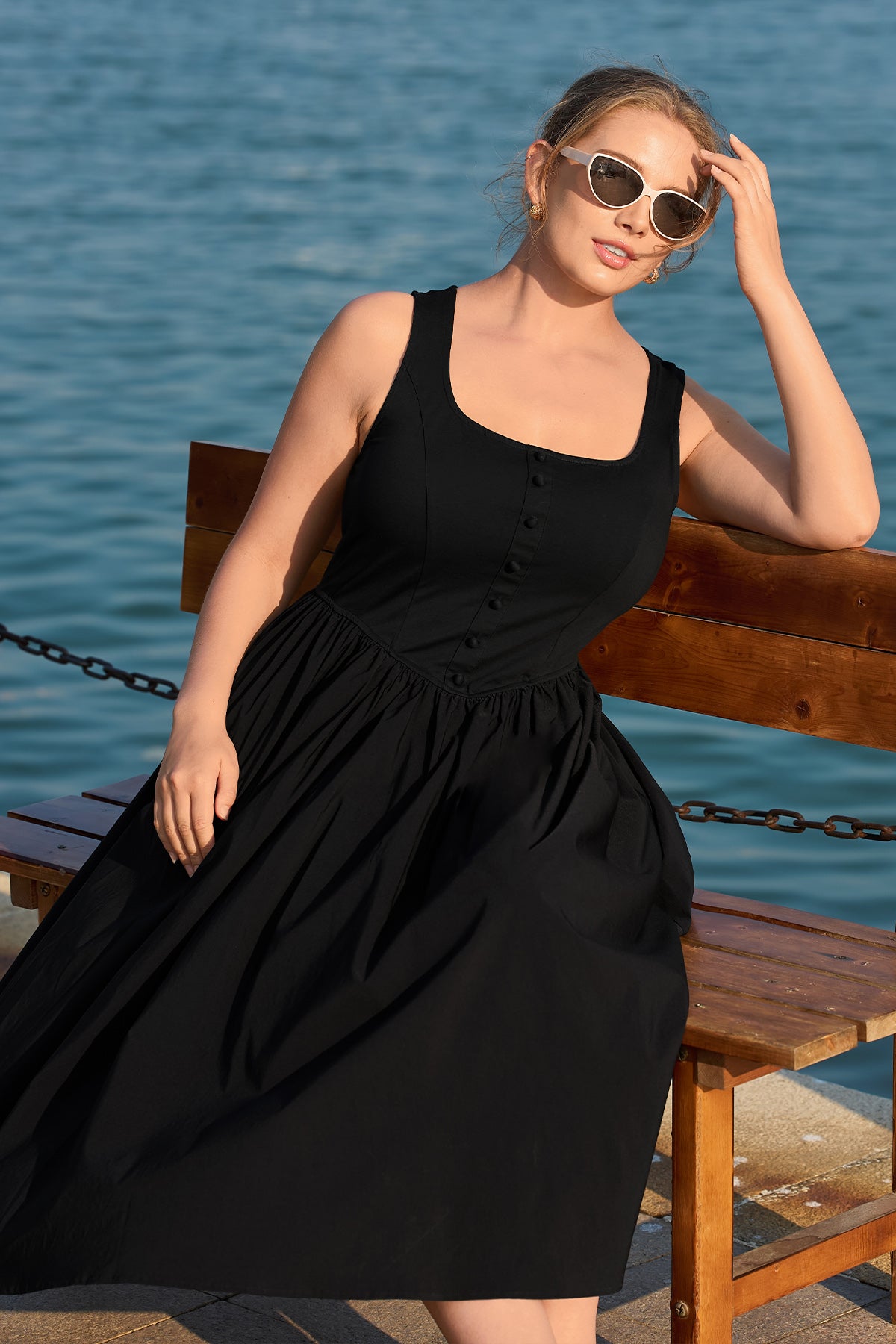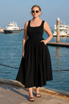 Elevate your wardrobe with this classic solid black midi dress. Key features include practical side pockets, a figure-flattering square neck, and a lightweight, flowy A-line skirt that delivers effortless minimalist style