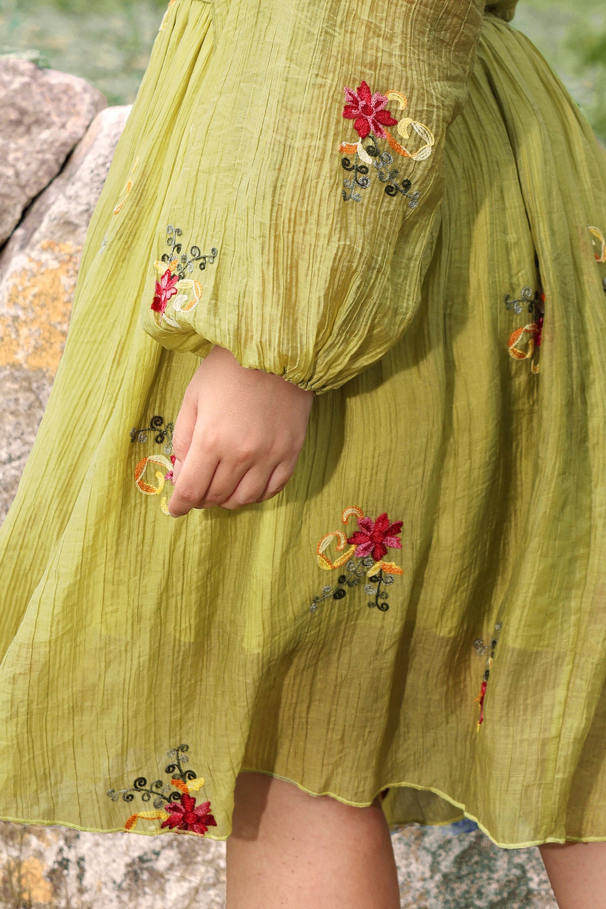 Embroidered Floral Shirred Square Neck A-line Midi Dress