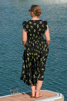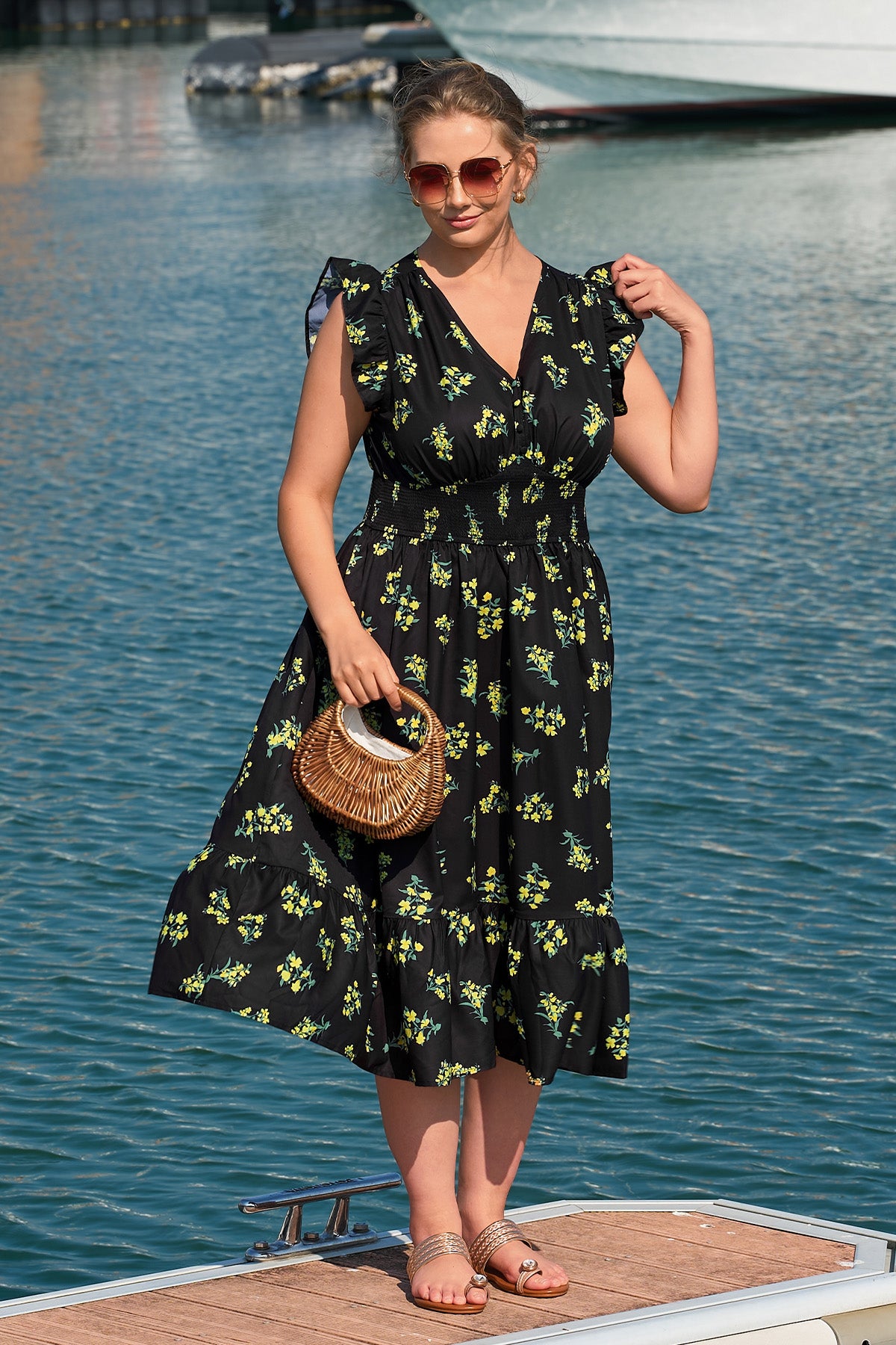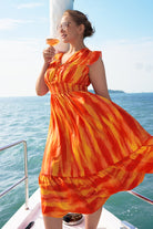 This eye-catching midi dress comes in bold vibrant prints (including sunny orange-yellow tie-dye and classic black-yellow floral) to match your style. Its ruffled sleeves add a playful, feminine touch, while the smocked waist cinches to flatter your silhouette—paired with a tiered flowy skirt that swishes beautifully with movement, balancing lively charm and effortless comfort.
