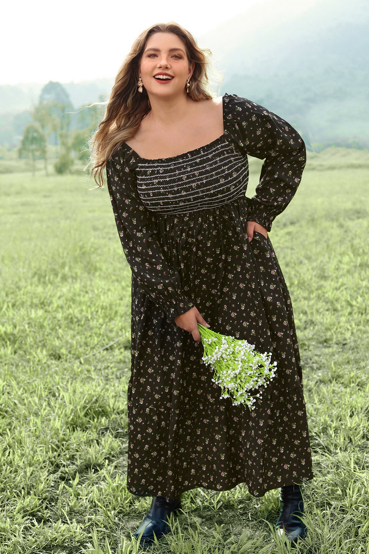 Floral Elastic Waist Square Neck Shirred Pockets Maxi Dress