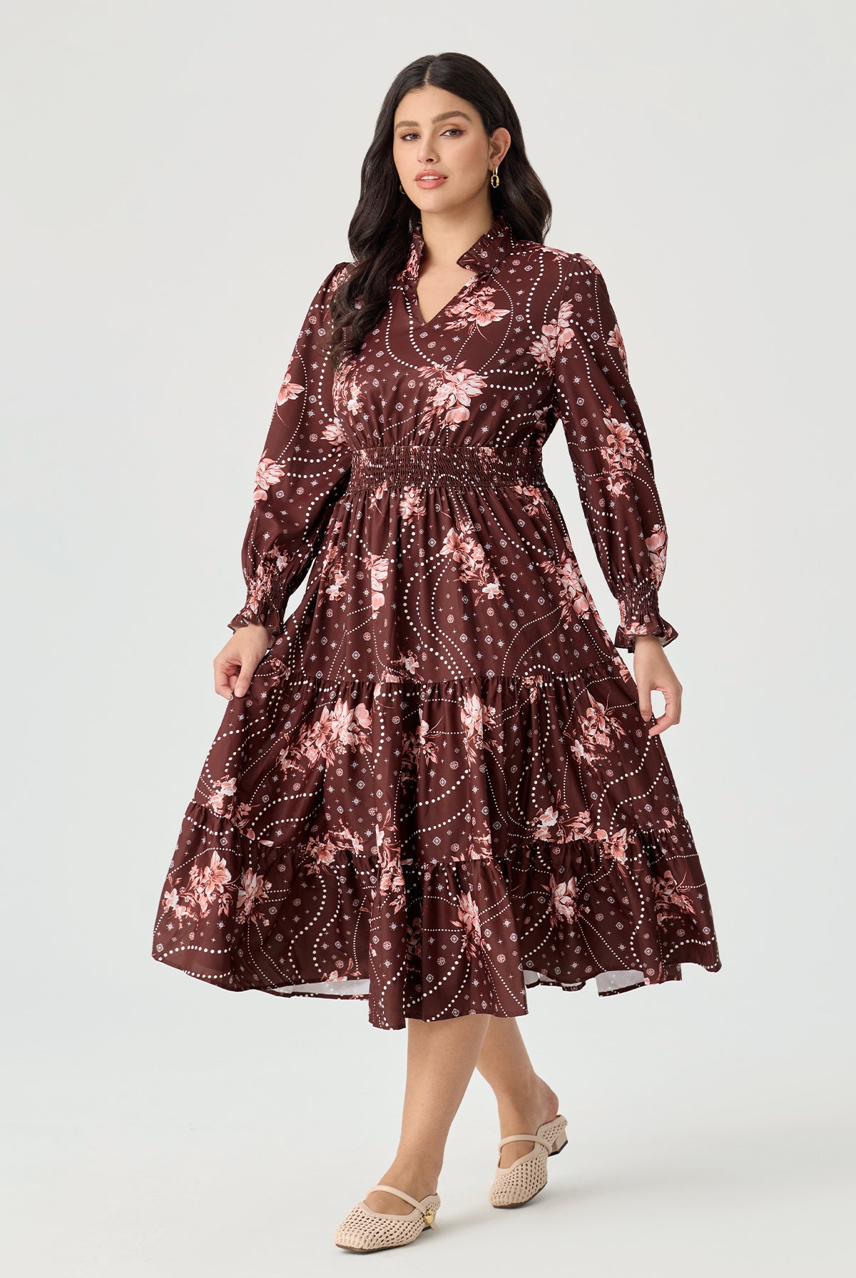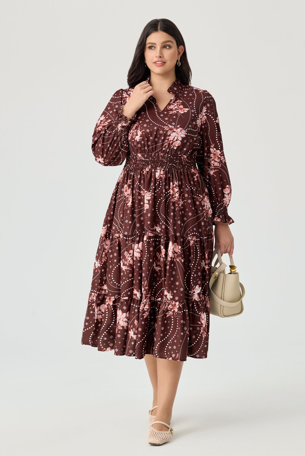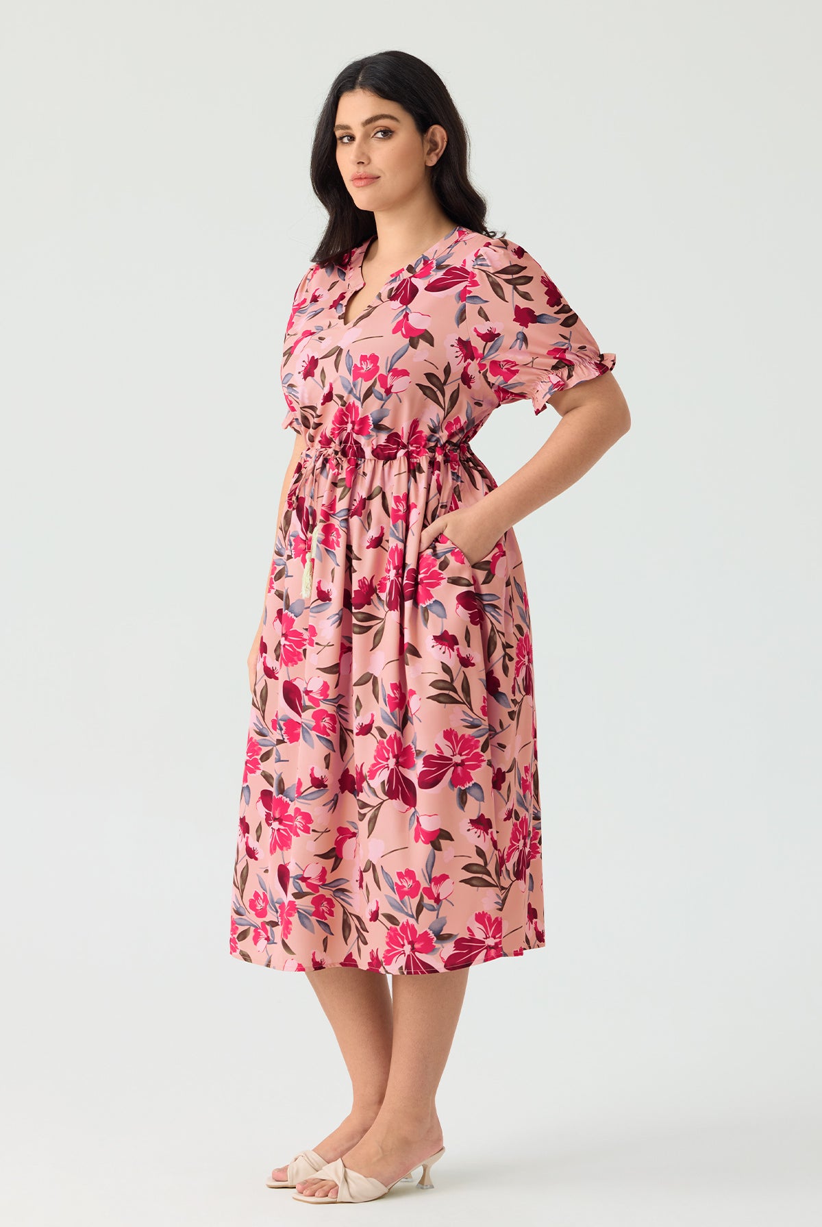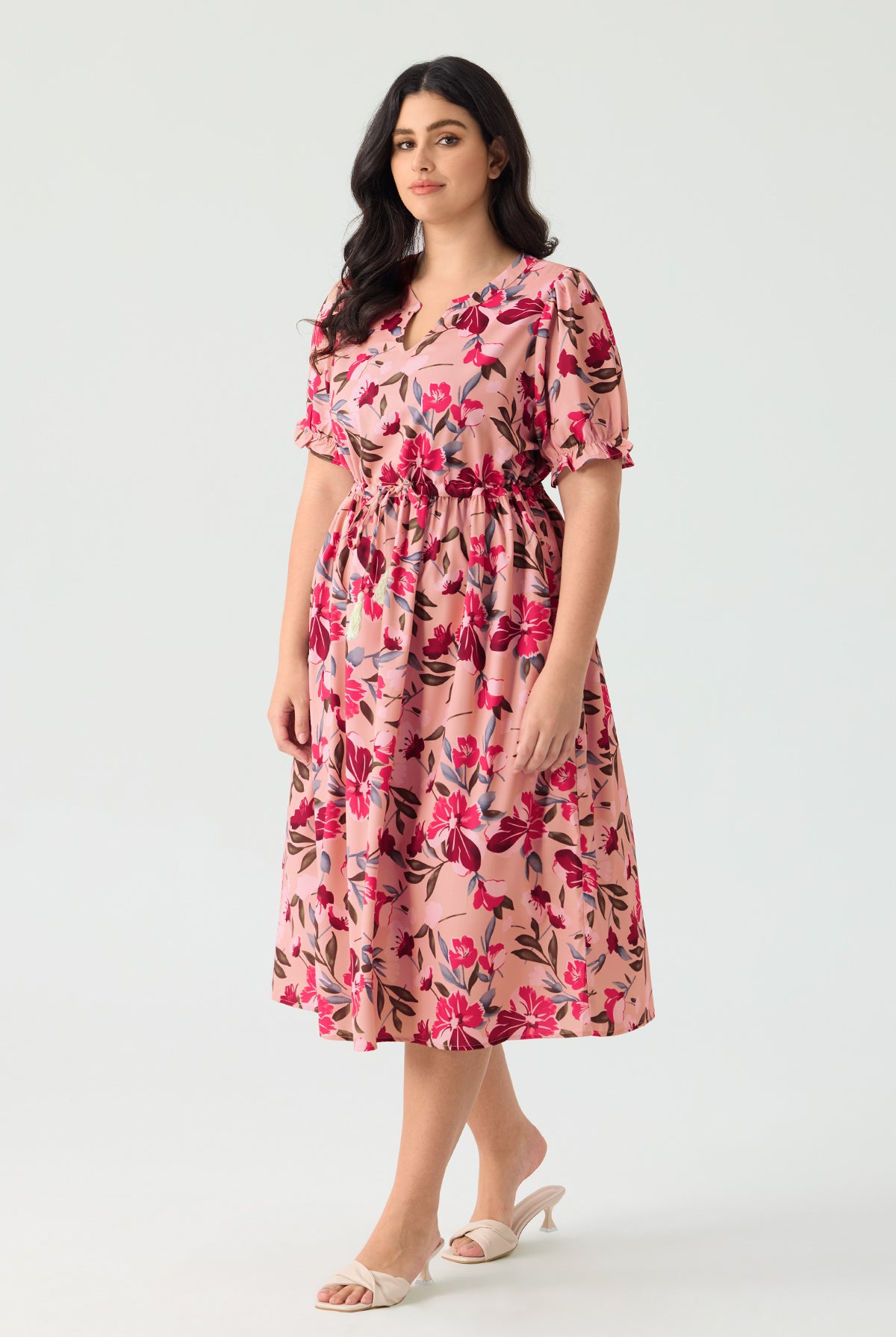 Ritera – Gerafftes Midikleid mit Knopfleiste, Blumenmuster und Polokragen
